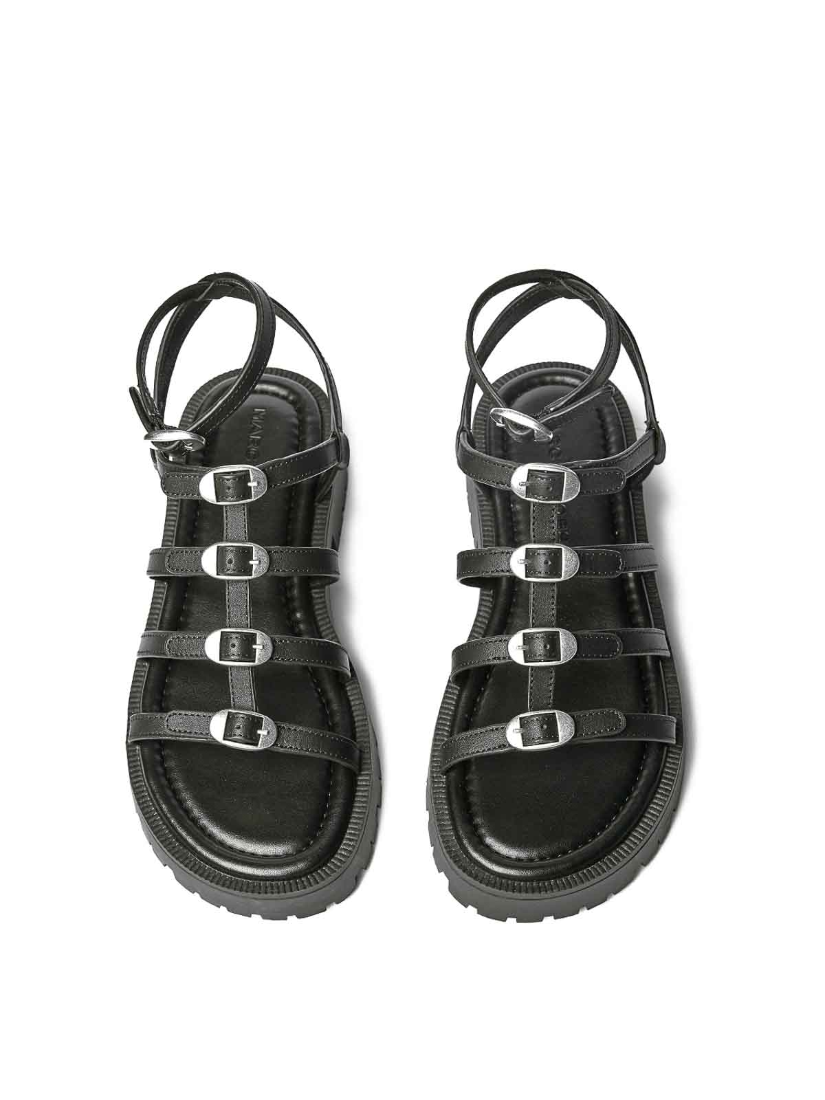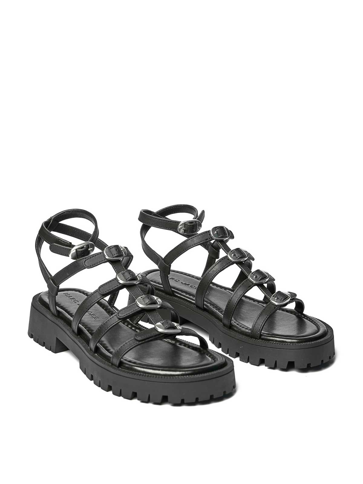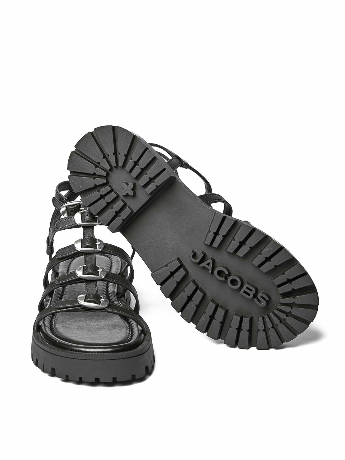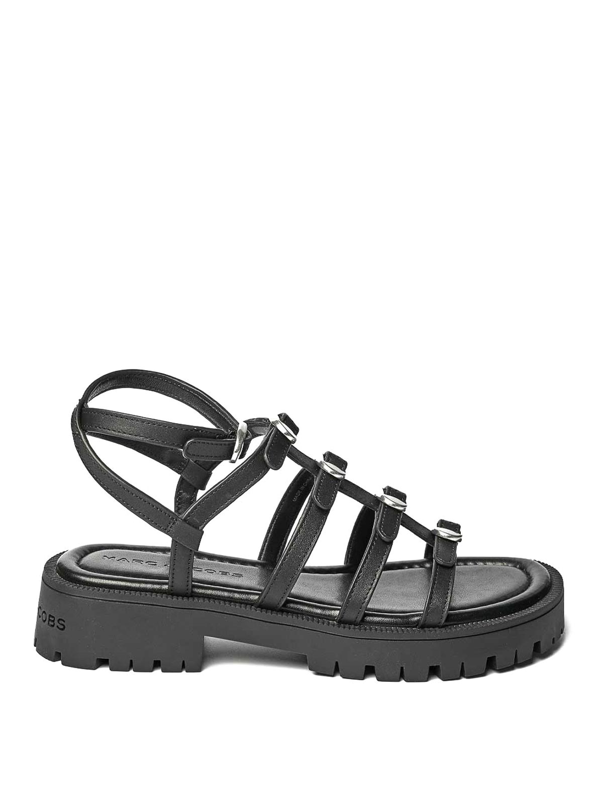 黒のキキグラディエーターサンダルは、マークジェイコブスのレザーグラディエーターサンダルで、ブロックヒールと金属製のバックルで装飾された複数のストラップが付いています。アンクルストラップクロージャー、ローブロックヒール、ヒールの後ろに刻印されたロゴ、レザーストラップ、メタルバックル、アンクルストラップクロージャー。