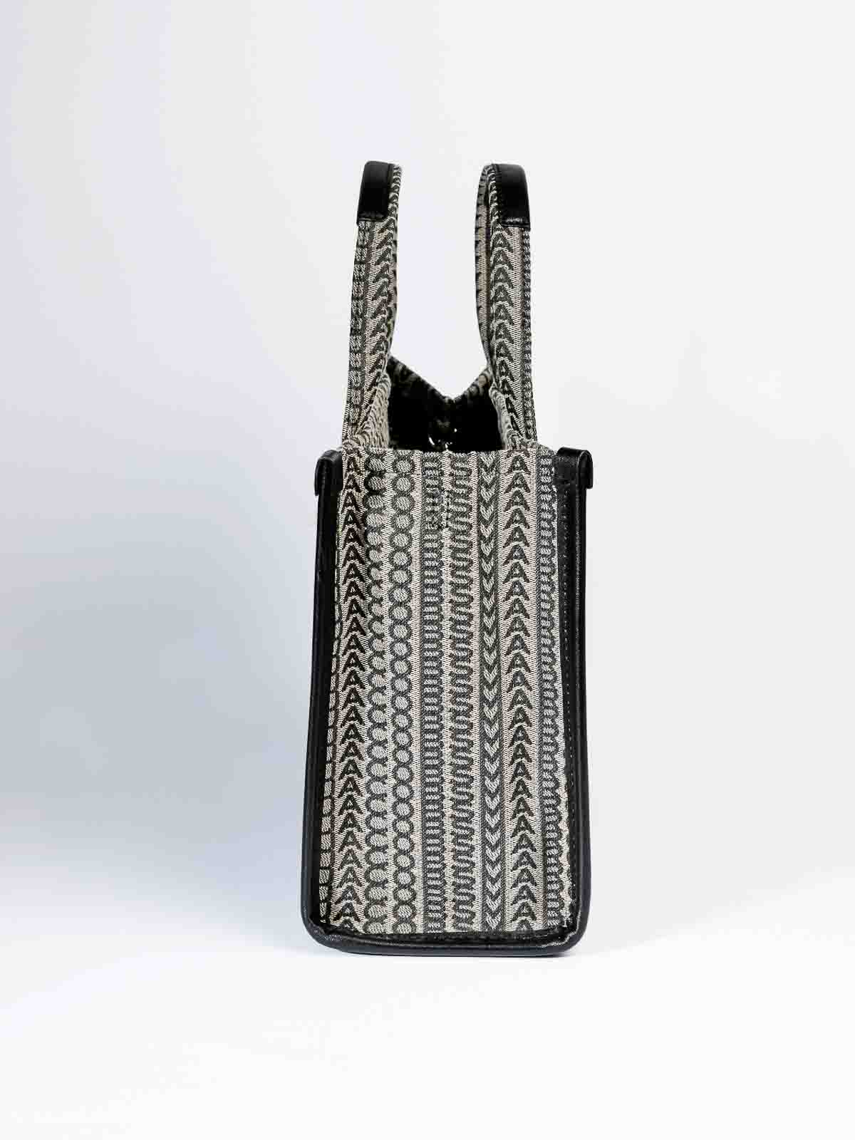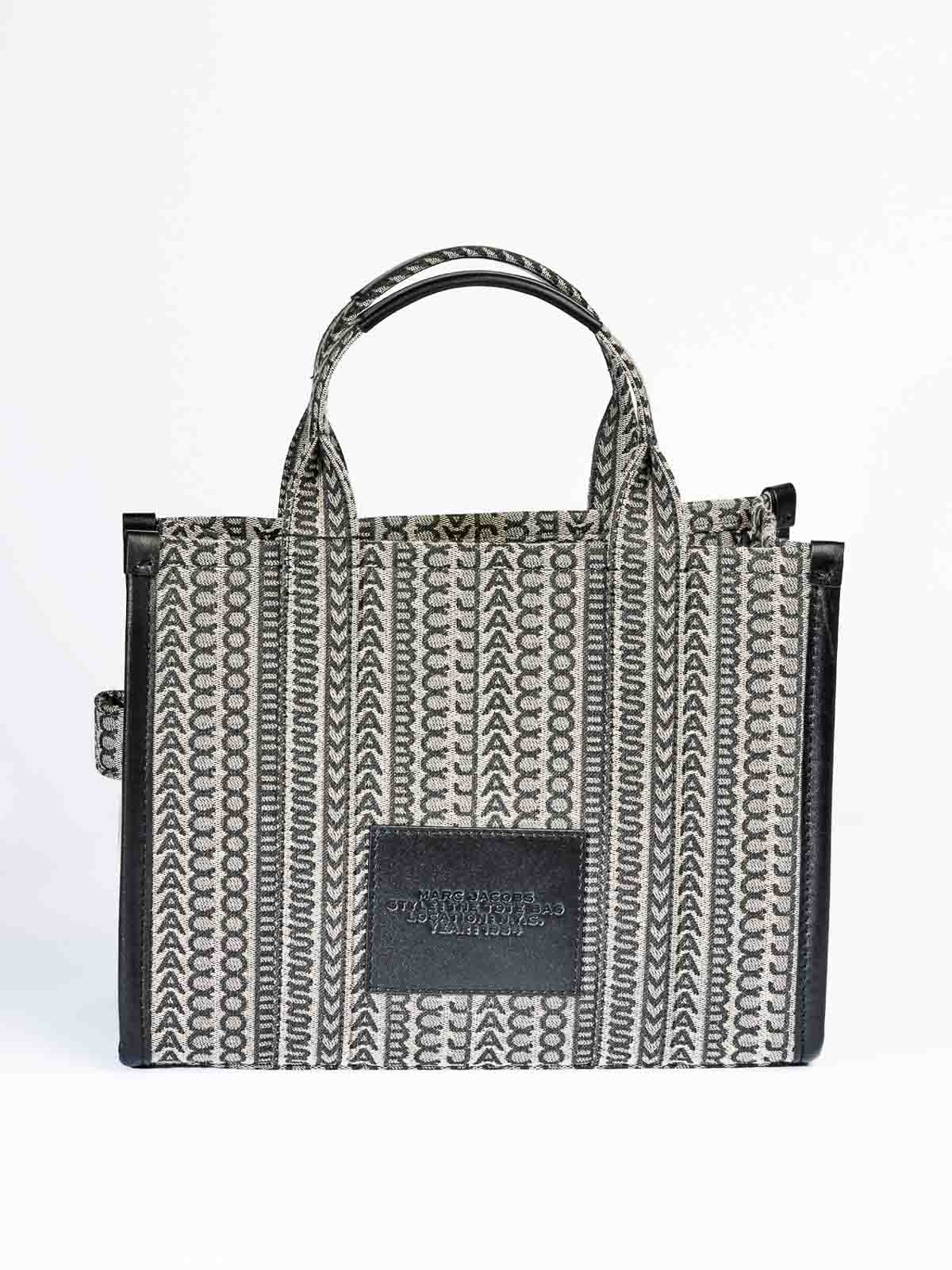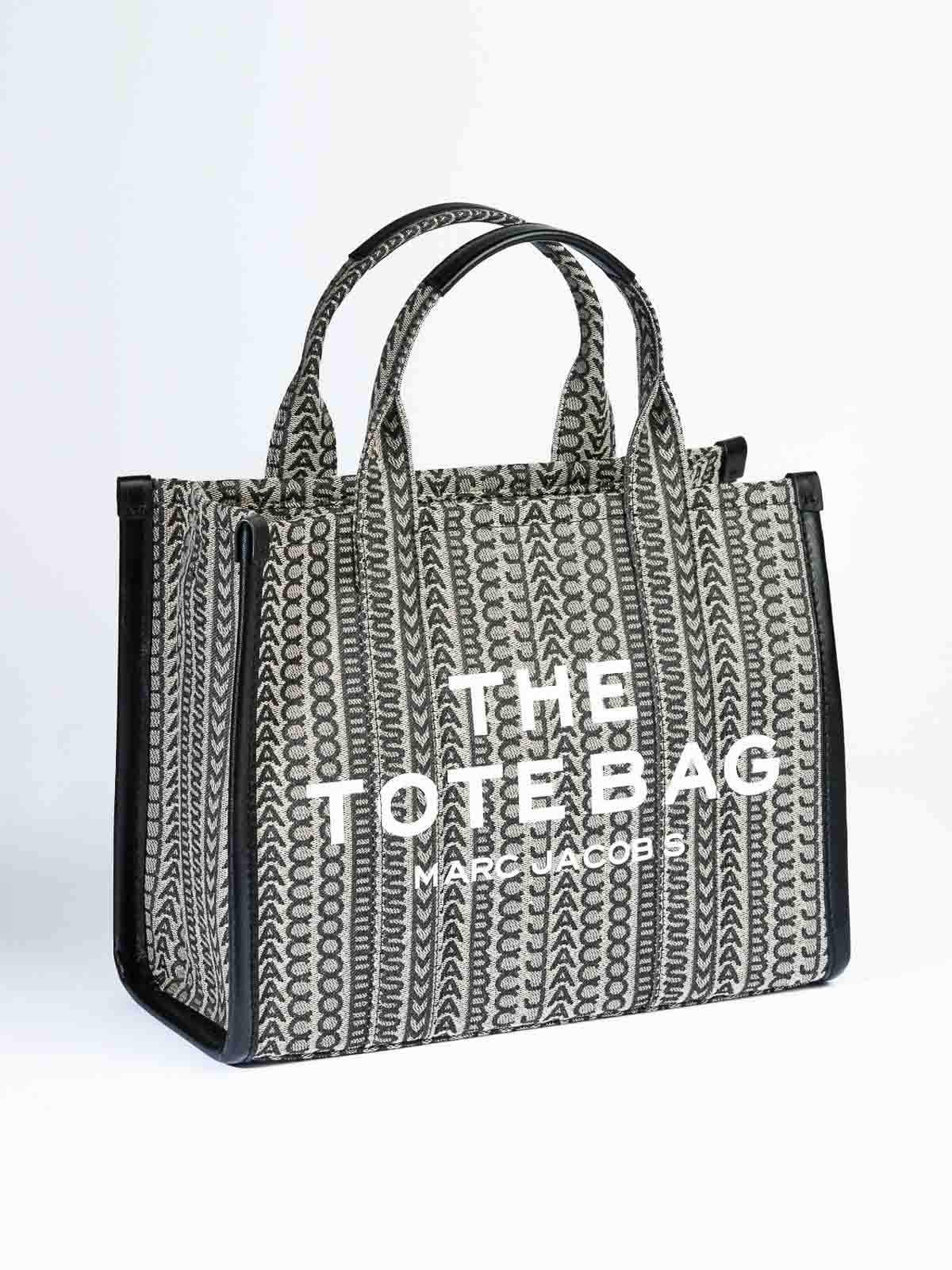 マルチカラーのミディアムトートモノグラムジャガードトートバッグは、全体にコントラストの効いたマークジェイコブスジャカードロゴと、マークジェイコブスのロゴが書かれたトートバッグのコントラストが特徴で、マークジェイコブスのロゴと書かれたトートバッグの取り外し可能なストラップヘム、背面のマークジェイコブスパッチサイドループジップ w h(ハンドルなし)d w h d