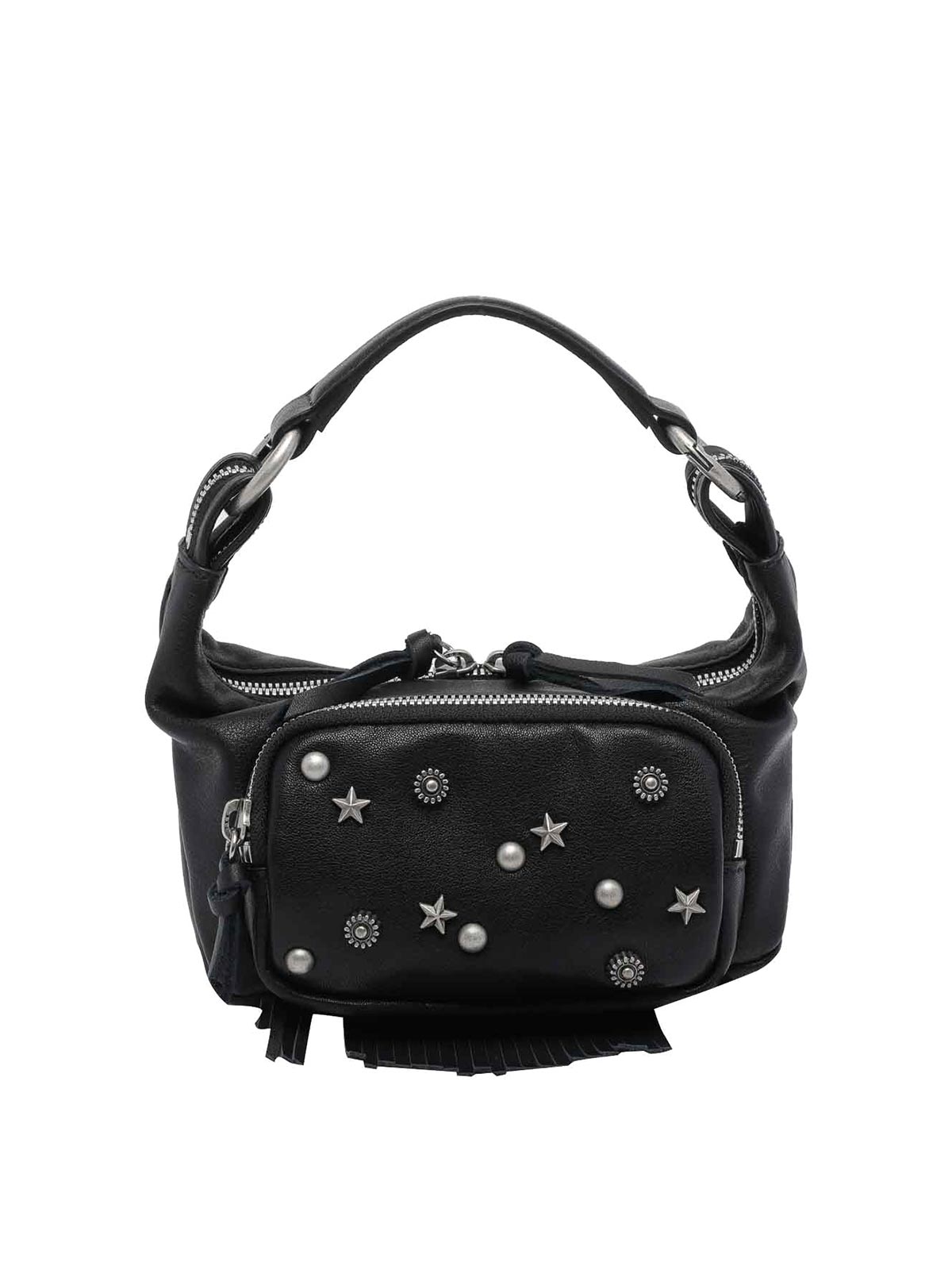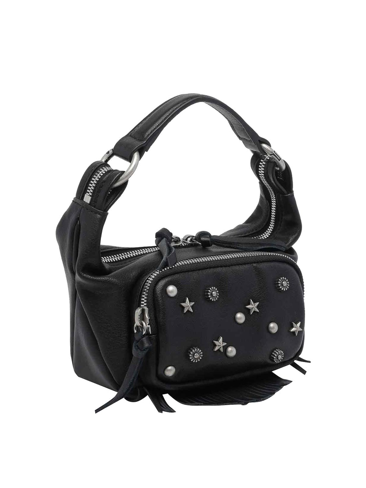 Margesherwood ブラックマイクロシティホーボーバッグ、ファスナー開閉、内側にオープンポケット、外側にファスナー付きポケット、ハンドル1つ、レザーアッパー
