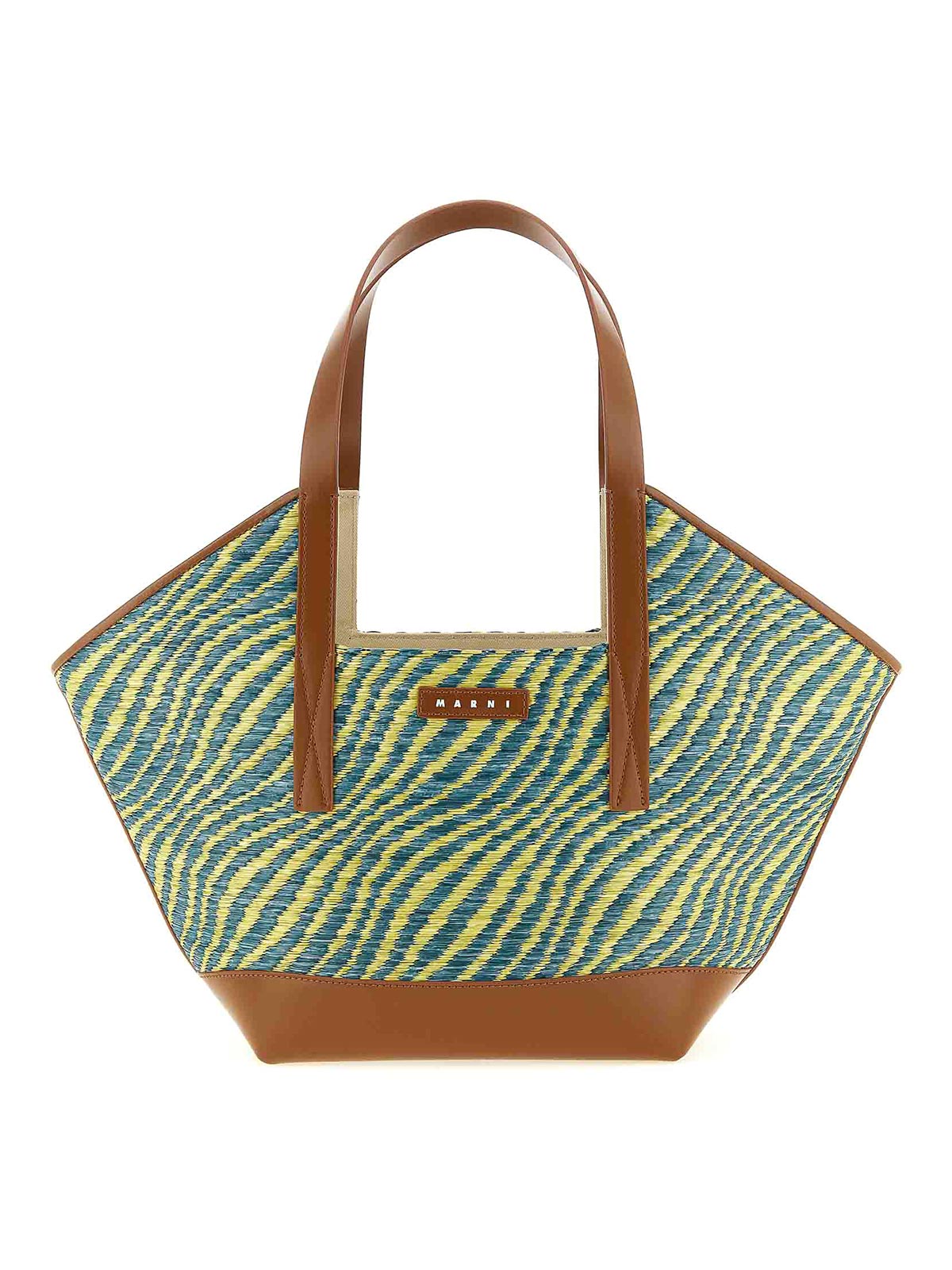 Wavesの台形ラフィアエフェクト生地、サイドに開口部、レザーディテール、ダブルフィックスレザーハンドル、フロントレザーロゴパッチ付き。