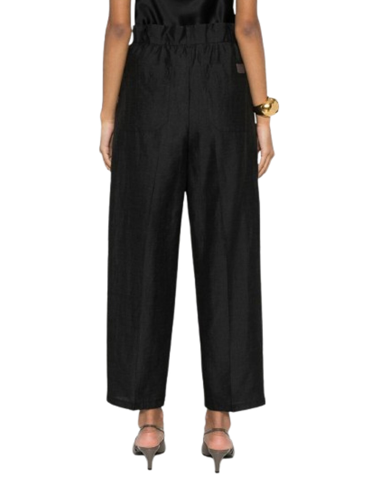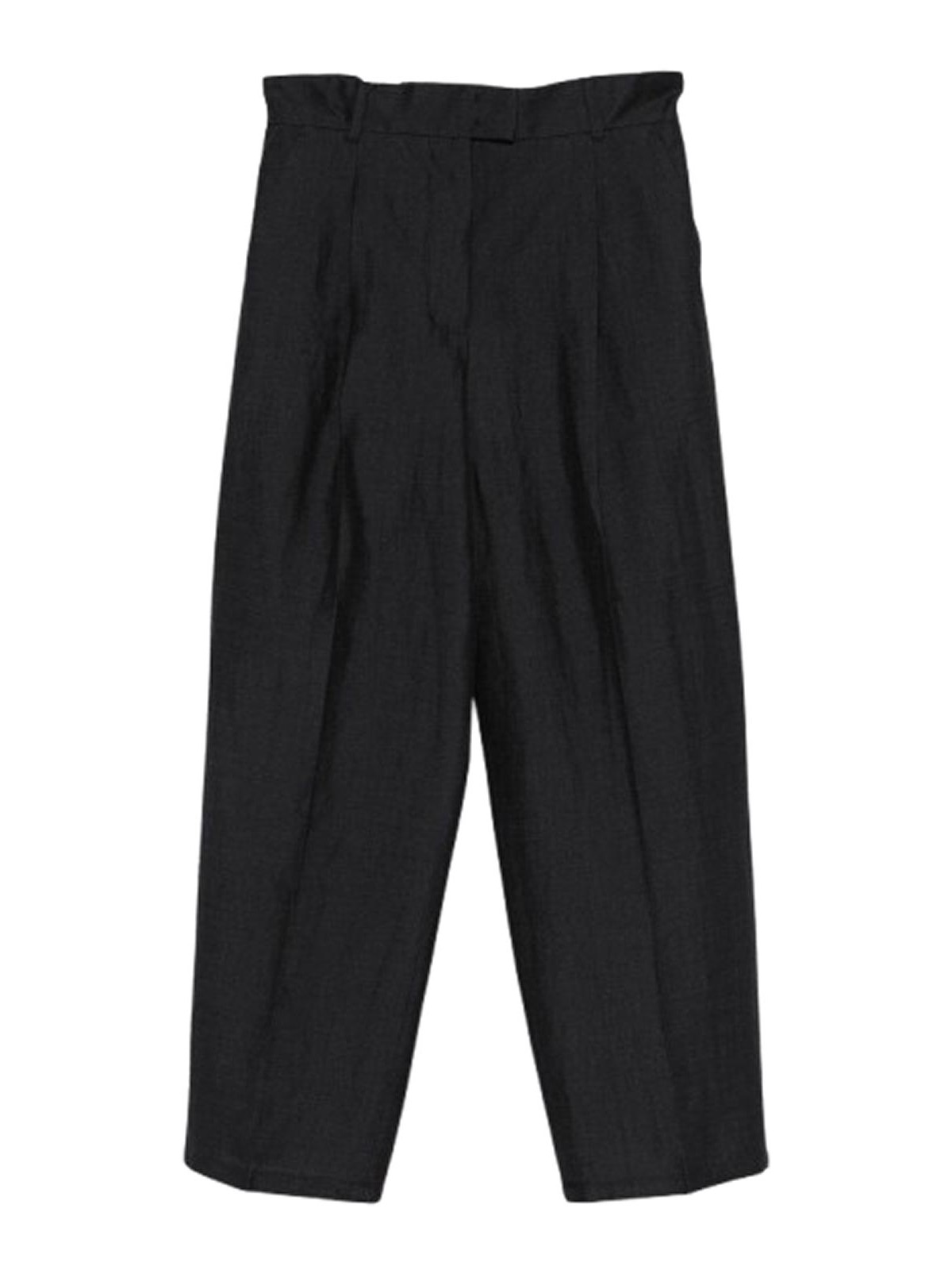 ブラックのストレートフィットパンツ。ウォッシュ加工とブレンド加工を施し、プリーツとアイロンをかけた折り目を施した伸縮性のあるウエストとベルトループで、サイドにはめ込みポケット、背面の右ポケットにはロゴラベルが付いたパッチポケット、フラップとフック付きのハイウエストバンドジッパー付き