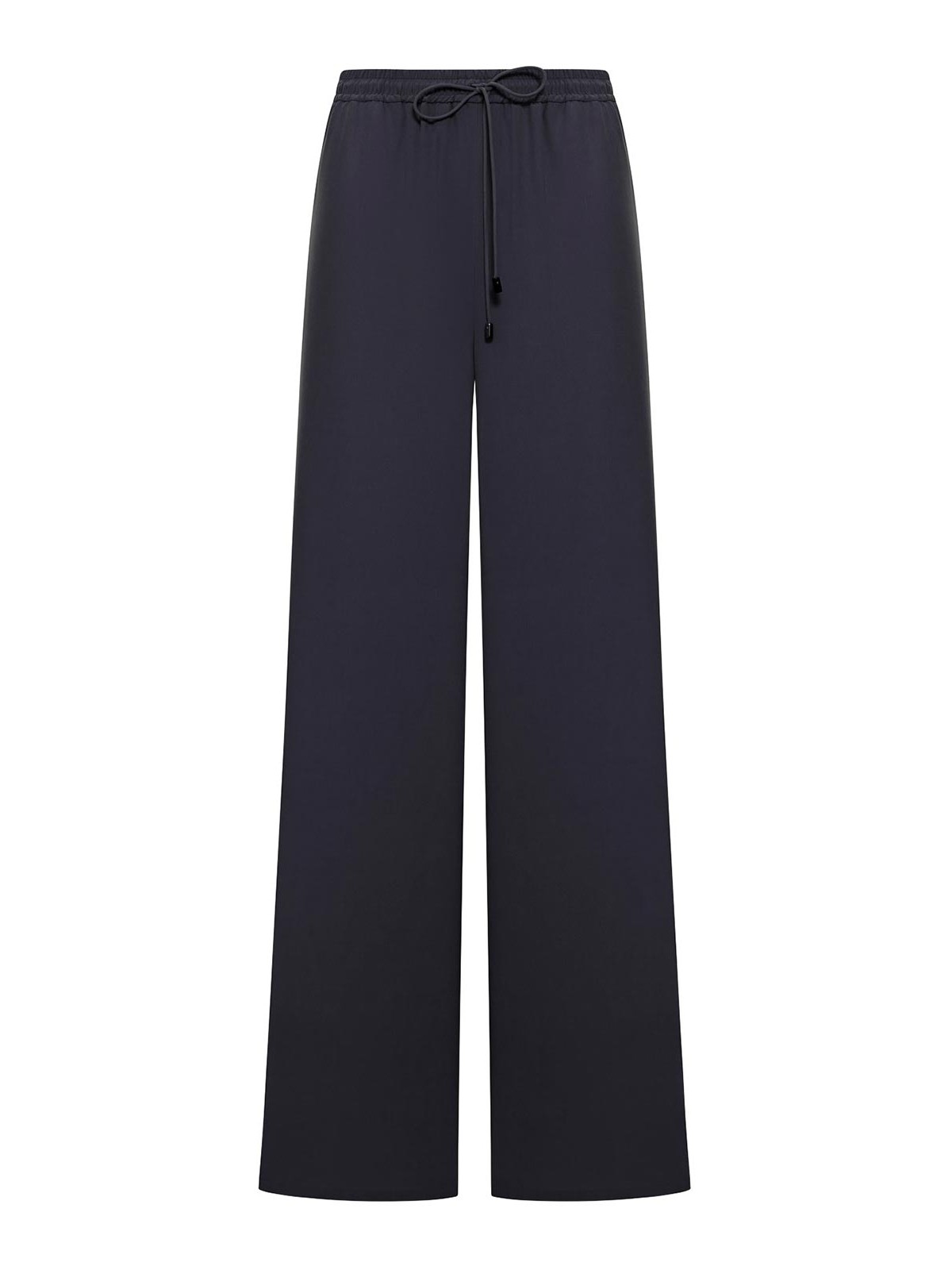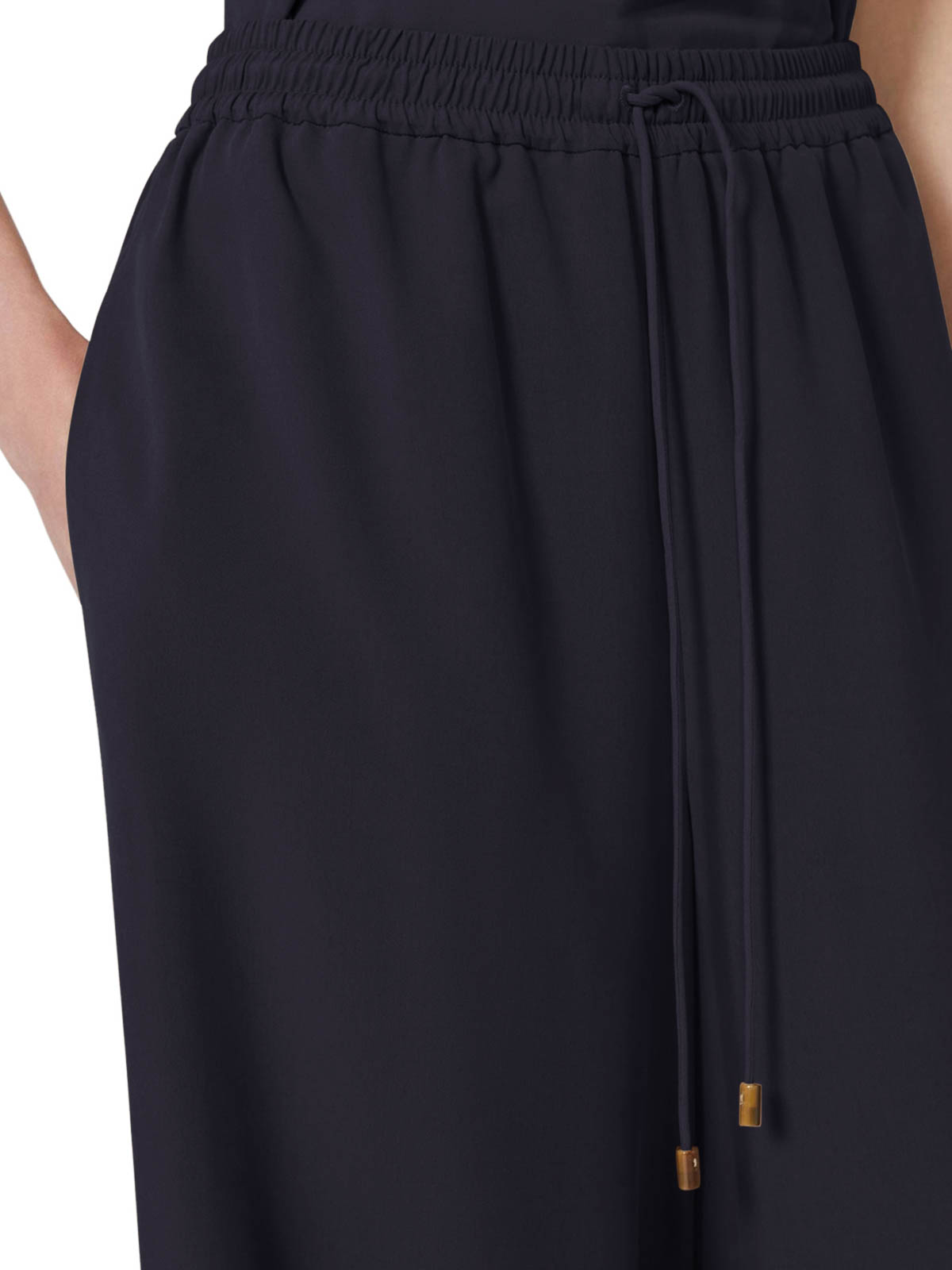 ドローストリング付き伸縮性ウエスト、はめ込み式サイドポケット、ウォッシュ加工のピュアシルクキャンバス製、流れるようなフィット感、モデルはサイズ40 (it)、身長178cm、100% シルク、色:ネイビーブルー