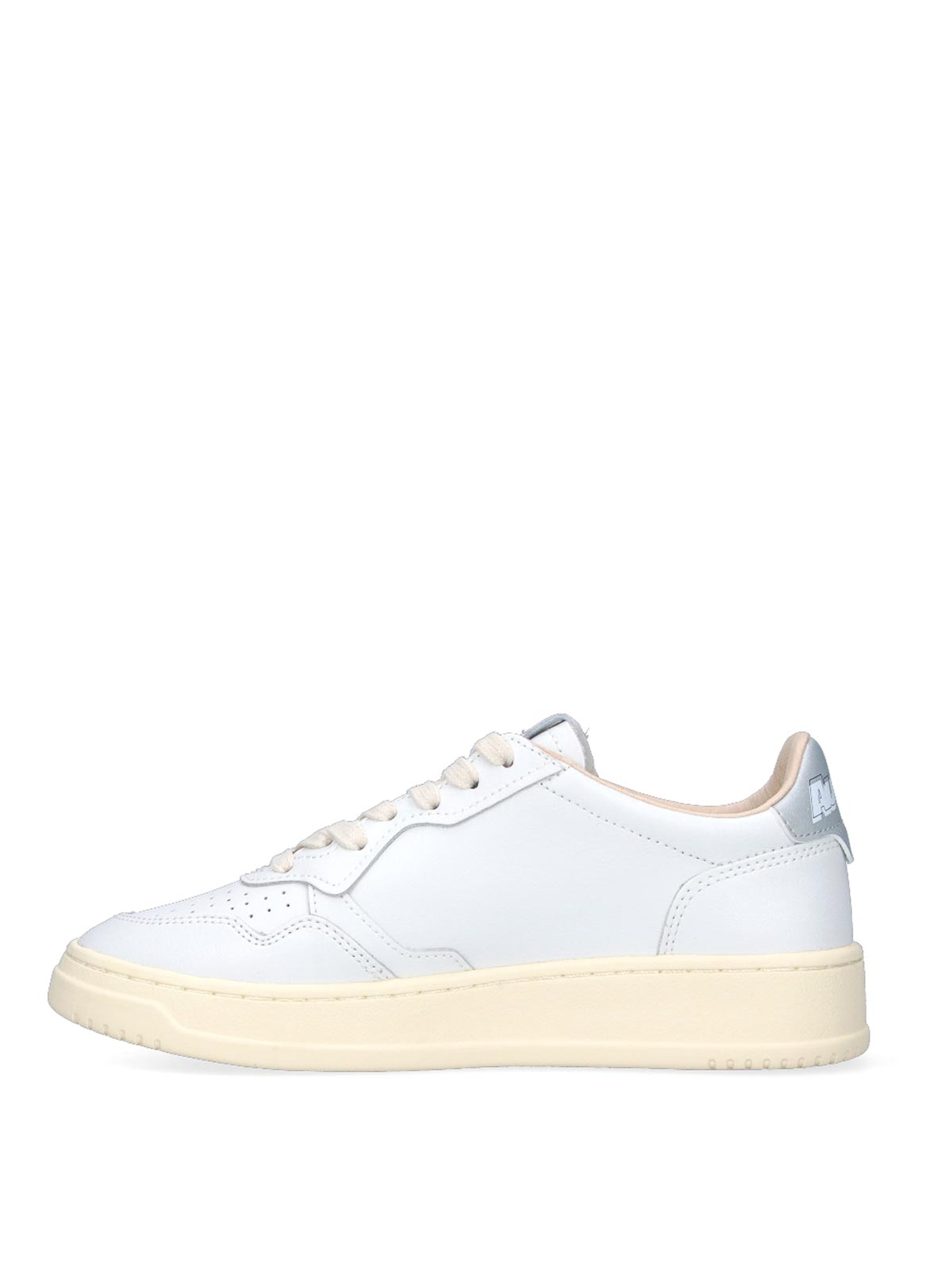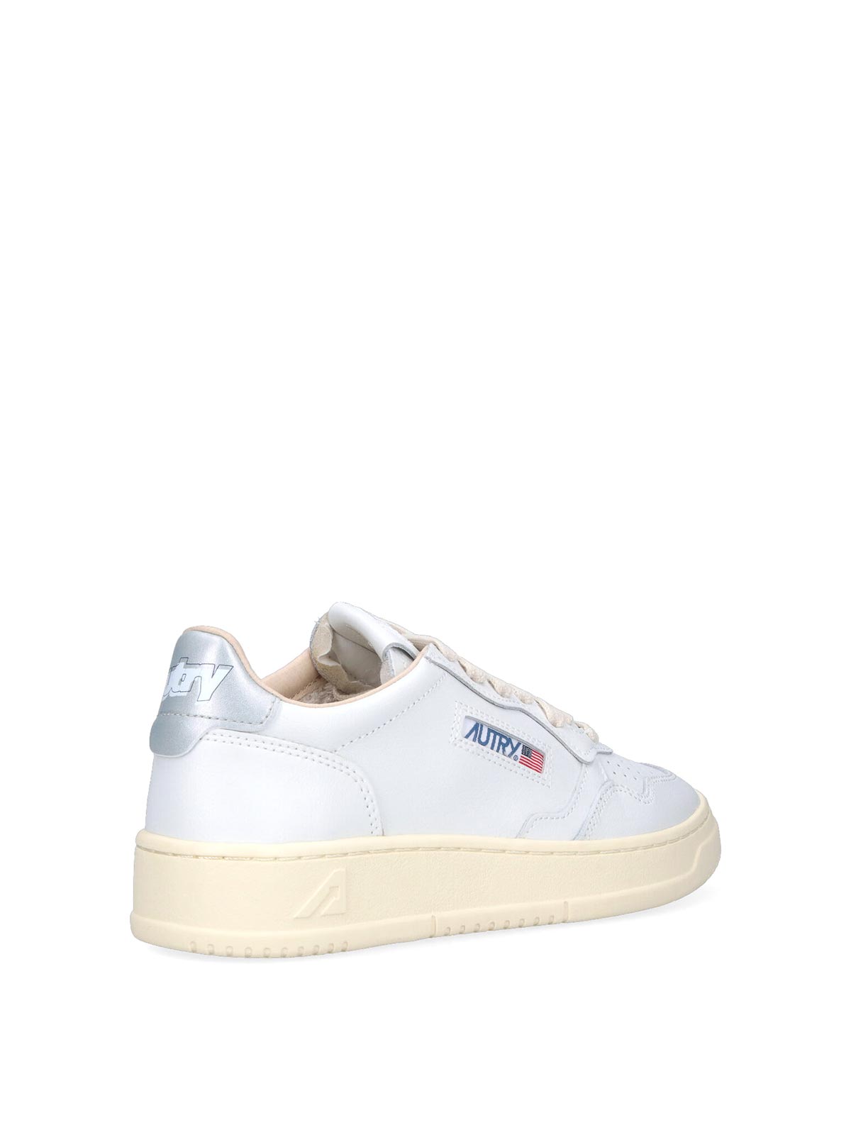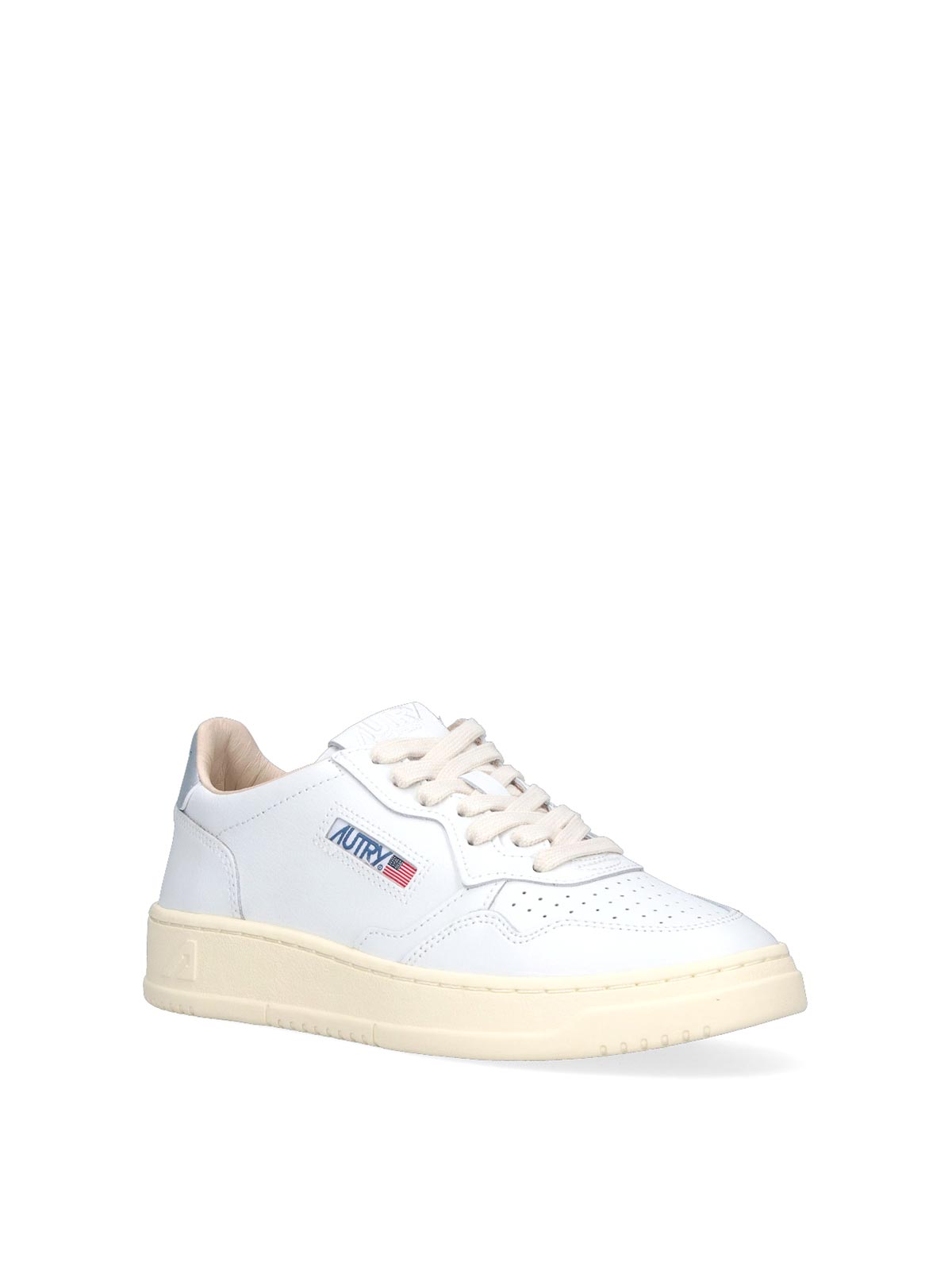 Autry ローメダリストスニーカー、ホワイトレザー、ラウンドトウ、レースクロージャー、トングロゴラベル、サイドマルチカラーロゴタグ、コントラストカラーのバックタブ、ラバーソール。