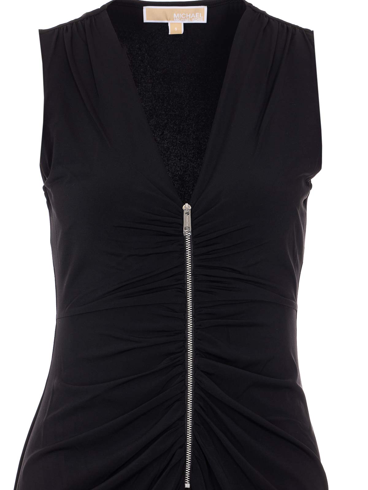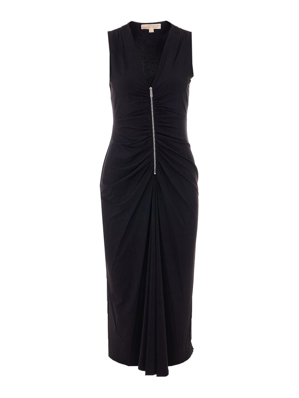 Micheal michael Kors ブラックドレス、フロントファスナー、ノースリーブ、Vネック、フリル、ロングスリーブ、タイトフィット