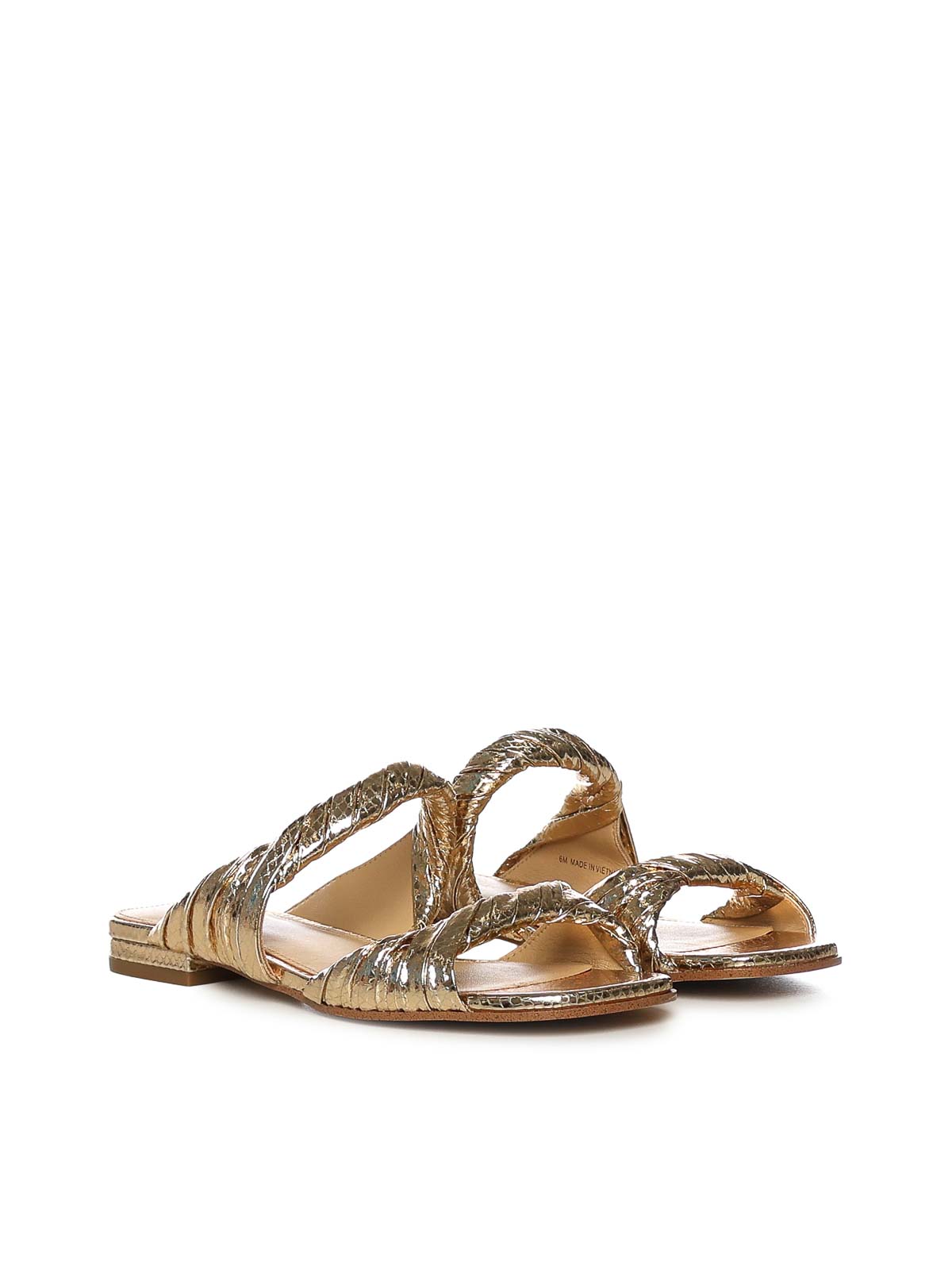 メタリックレザーアッパー、オープントゥ、ラバーソール、デザイナーカラー:ペールゴールド