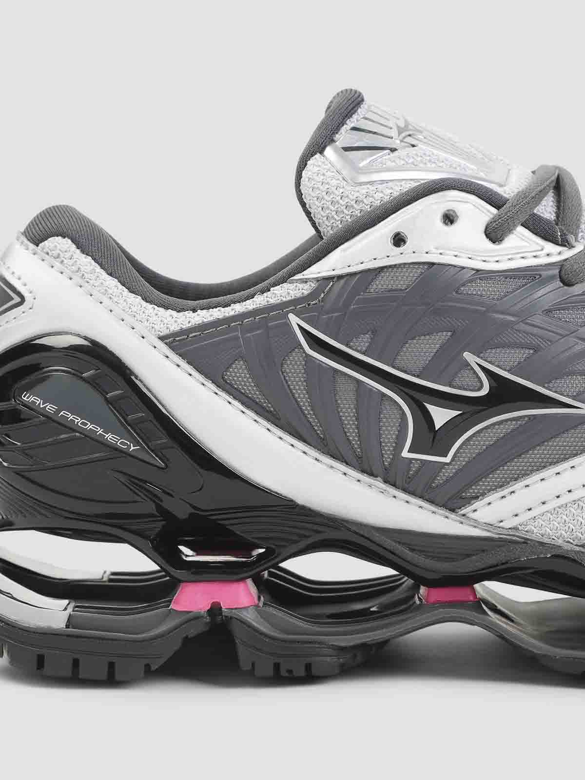 ミズノハーバーミストグレーレザーウェーブプロフェシー LS スニーカー。レザーとメッシュスニーカー。ラウンドトゥ、トップグレーのレースアップファスナー、タンにグレーとダークグレーのパッチロゴ、サイドグレーのディテールケージデザイン、サイドダークグレーのロゴ、バックブラックデザイン、アッパーにライトグレーのメッシュディテール。カットアウトのディテールが施されたブラックとピンクのラバーソール。