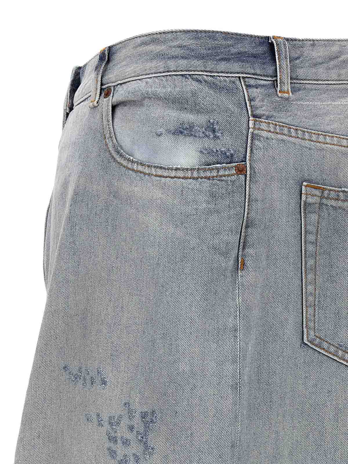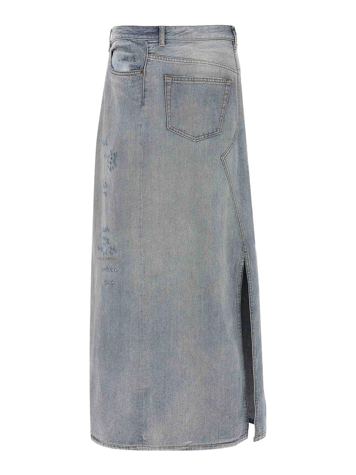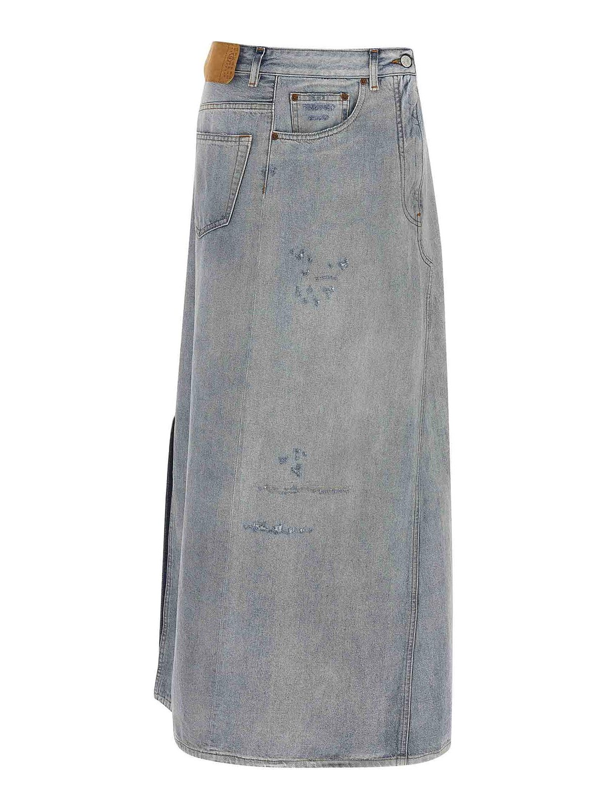 コントラストステッチ、アシンメトリー構造、ジッパーとボタン留め、フロントロゴタグ、バックスプリット、フレアシルエットが特徴のユーズドエフェクトコットンデニムのマキシスカート。