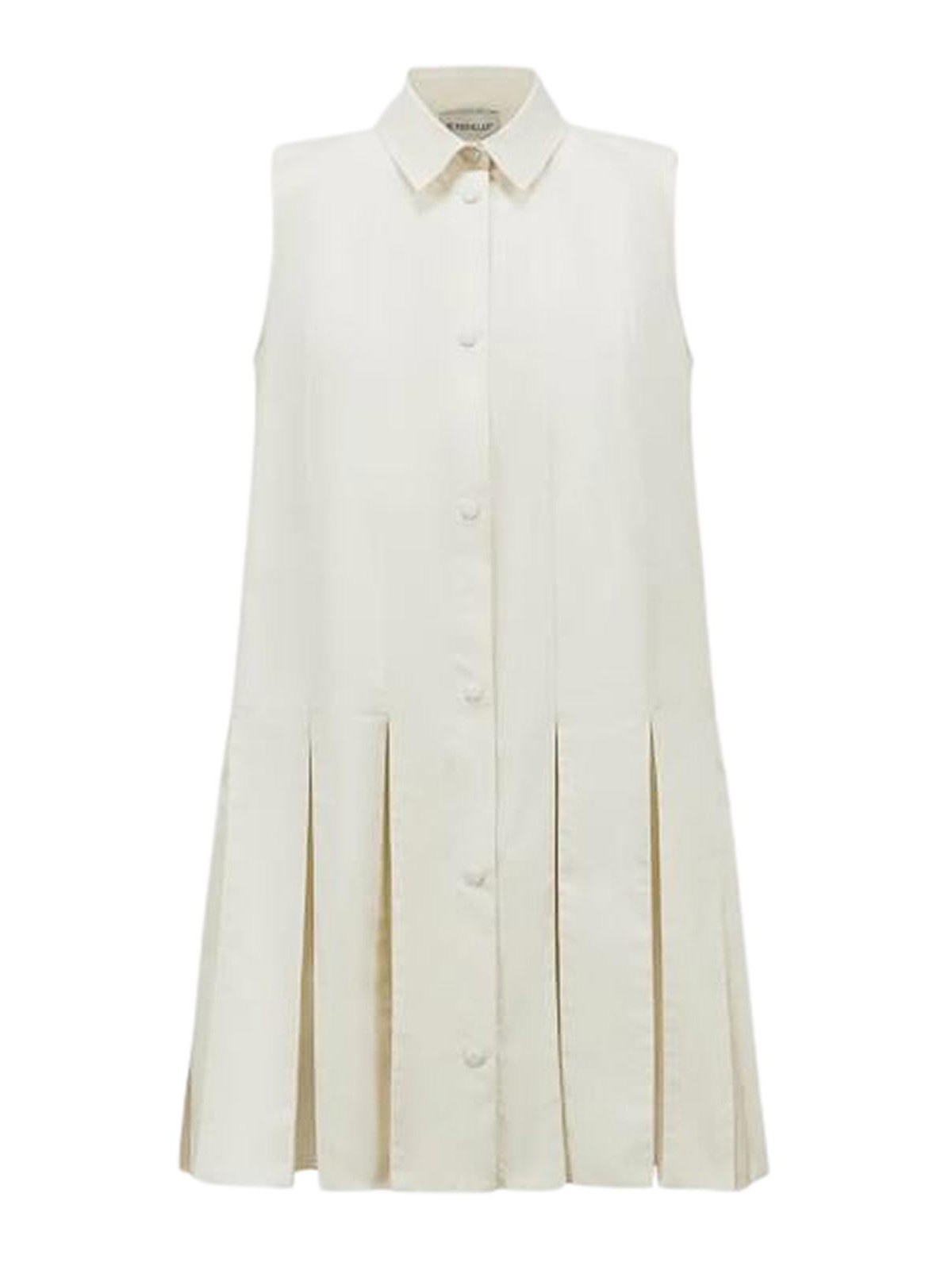 薄手のシルクパネルをあしらったアイボリーホワイトの軽量コットンポプリンシャツドレスプリーツスカート付き透け感のあるシルクパネル付きノースリーブデザインポインテッドカラースナップボタンクロージャー付きプリーツスカート