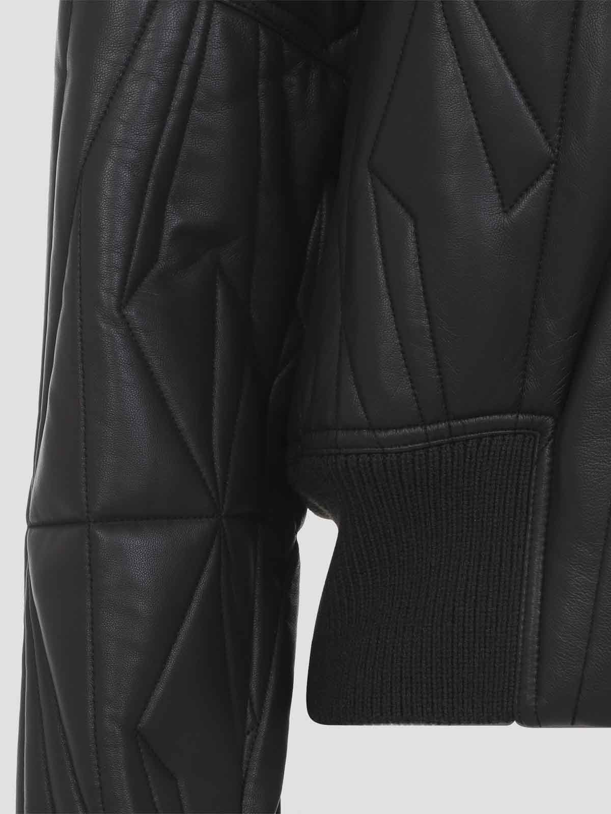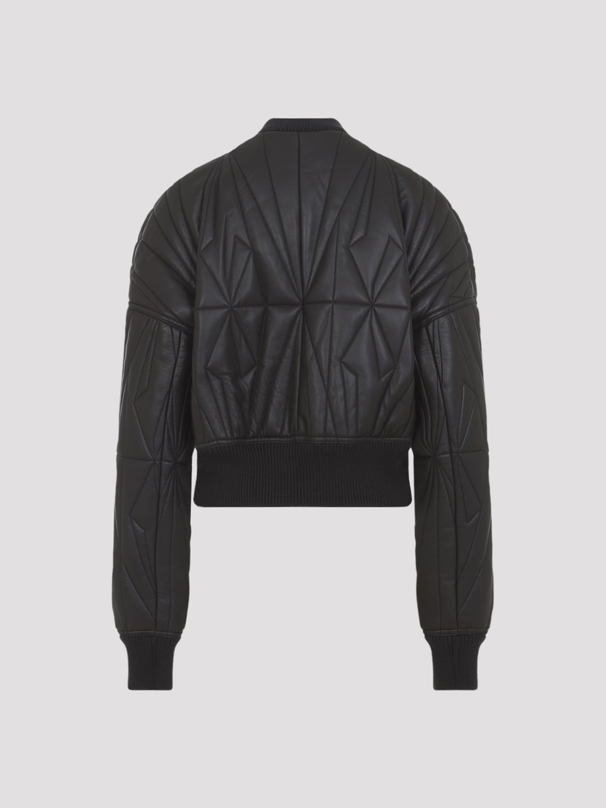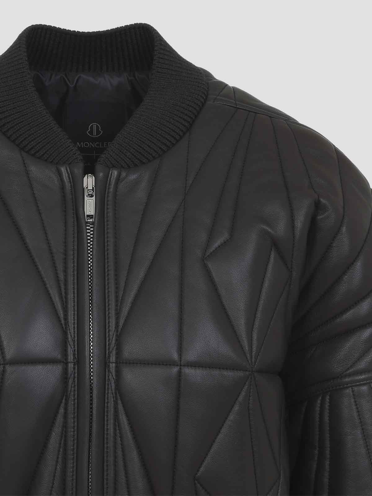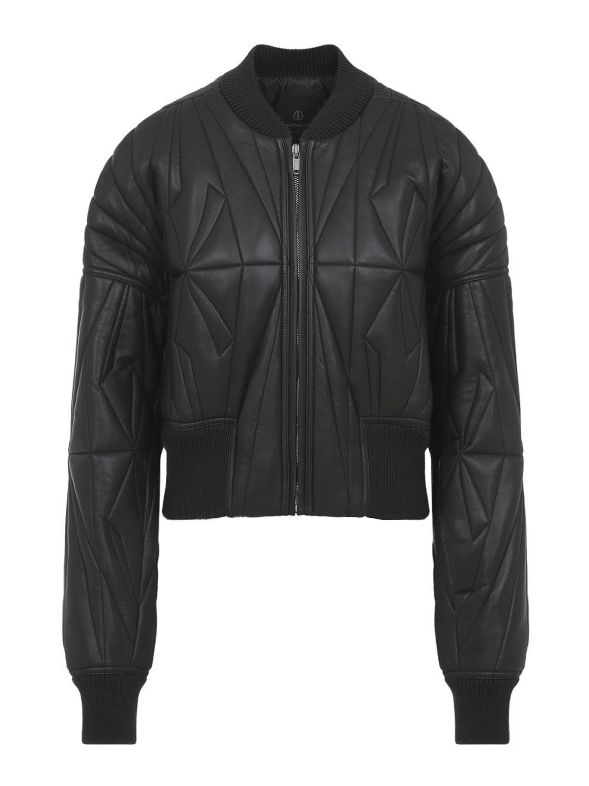 Moncler x rick owens ダークグレーのジオカモクロップドジャケット。ダークグレーのナッパラムスキンレザー、ウエストの長さは長袖、レギュラーフィット。前立てとトップスナップ付きのセンターフロントメタルジッパー、ウール混紡リブニットの襟、袖口、幅広のウエストバンド。ドロップアームホール付きの丸みを帯びたフィットで、全体にジオカモキルトと刺繍が施され、パッド効果を生み出しています. 左腕下部にモンクレール+リック・オウエンスの刺繍入りロゴパッチ。リサイクル超軽量ポリエステルの裏地と内側に金属製のジッパー付きポケット。