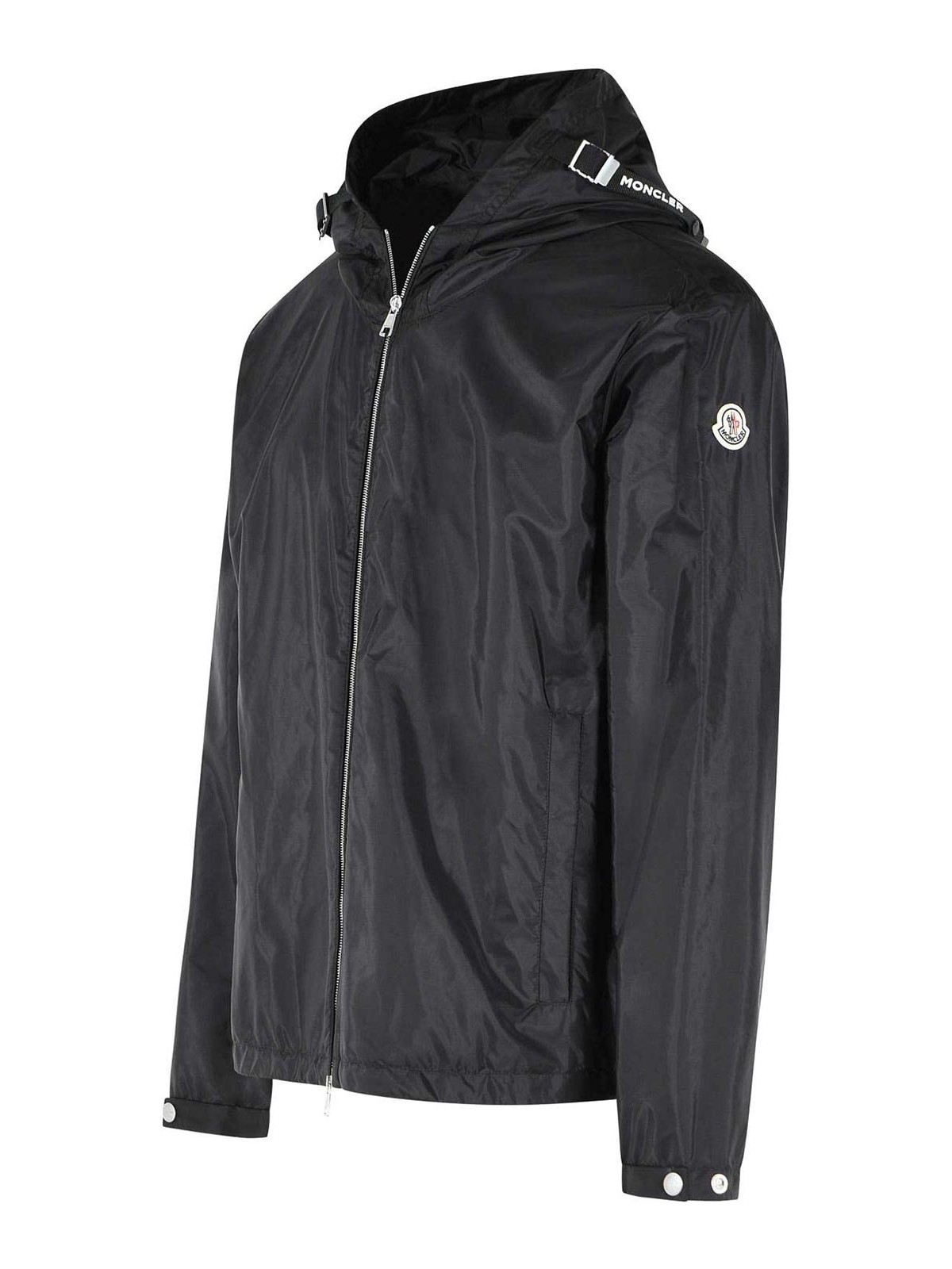 テクニカルナイロン製、撥水加工のメインファブリック、テクニカルナイロンの裏地、調節可能なフード、ジッパー開閉、スナップボタンポケット、調節可能な袖口、ドローストリングヘム、ロゴディテール