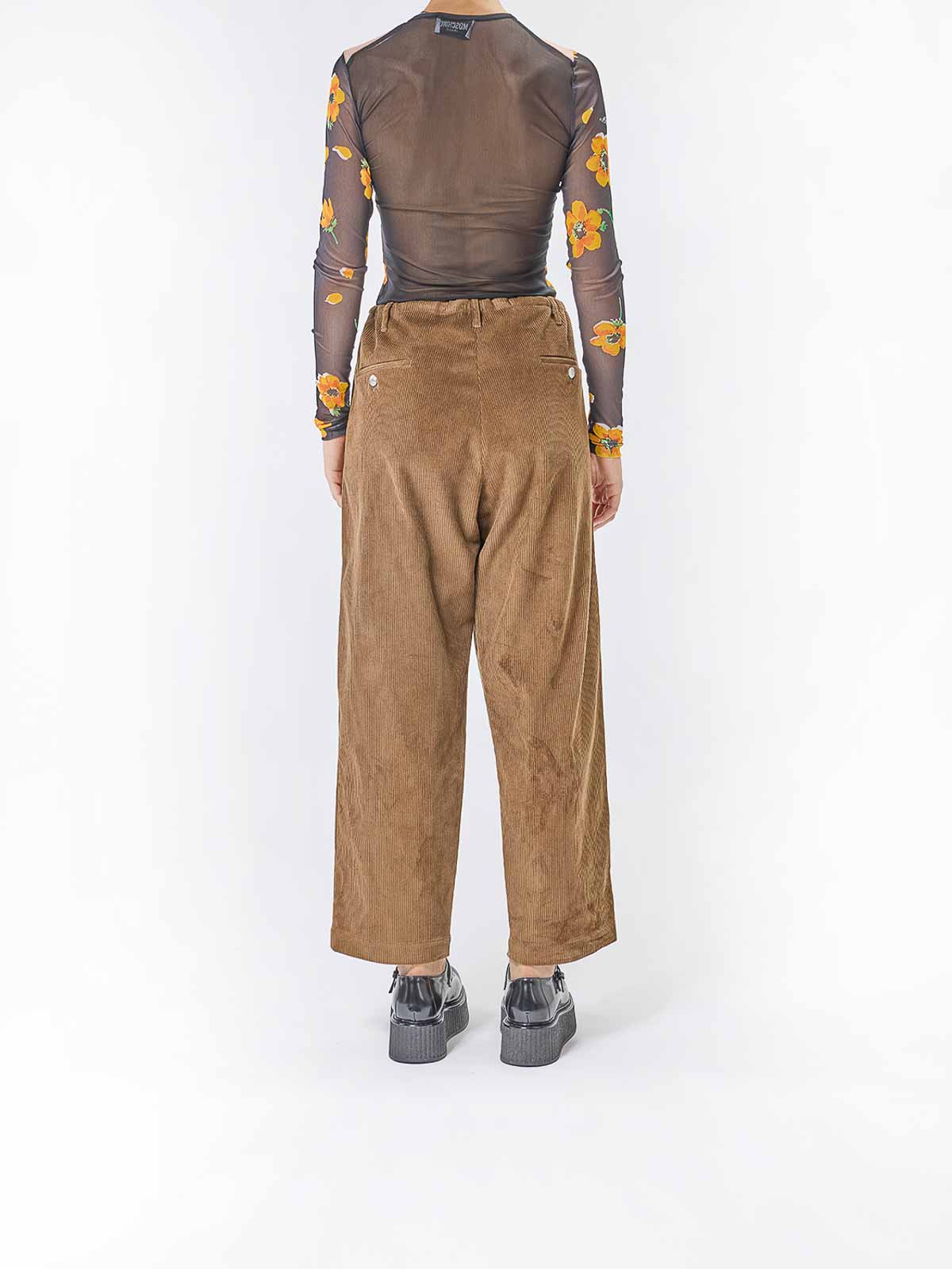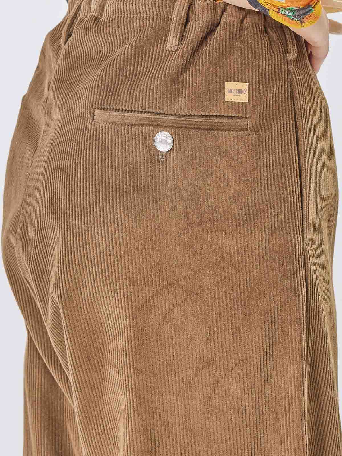 Adrian コーデュロイのトラウザーズ。カラーはライトブラウン。Moschinoのルーズフィットコーデュロイパンツ。ウエストにドローストリングとバックポケットが付いています。ルーズフィット、ローライズ、リブニット、サイドポケット2つ、バックポケット2つ、メタルロゴボタン付きバックポケット、フロントジッパー、ドローストリングクロージャー。カラー:ブラウン。100% コットン。