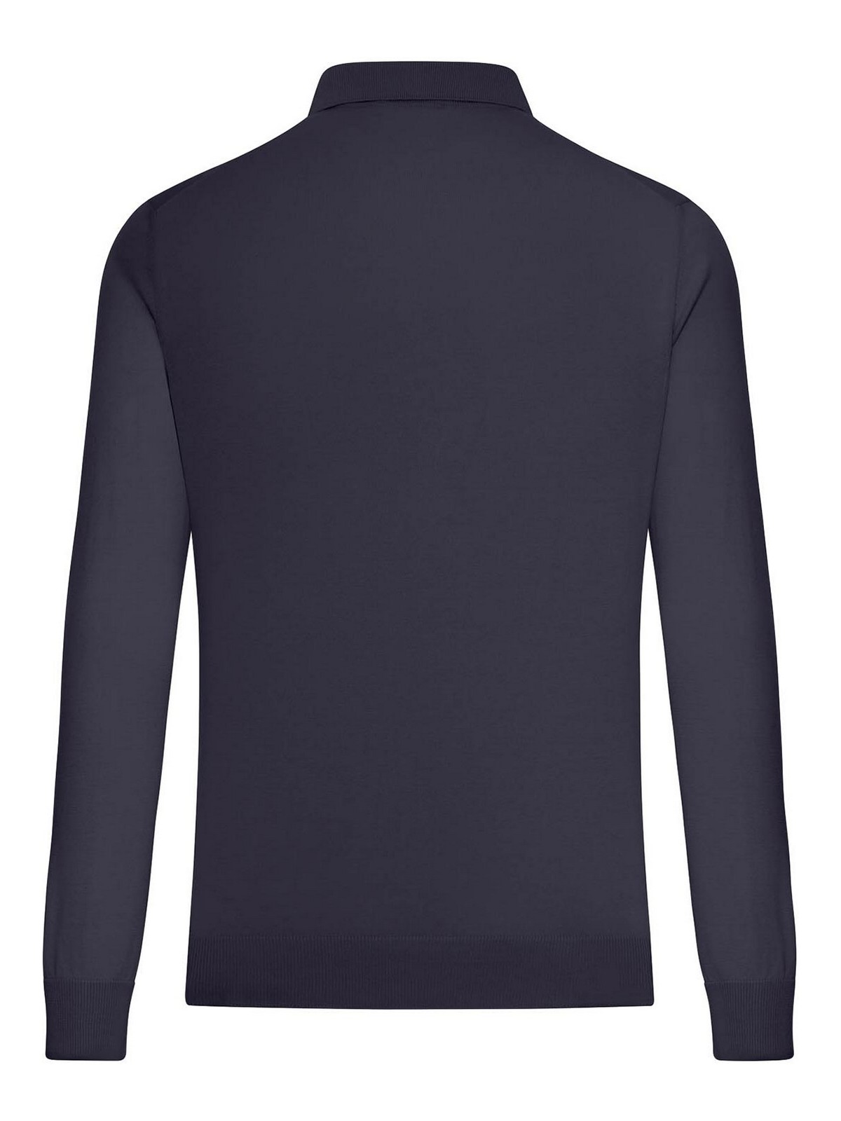 上質でコンパクトな質感の軽量ニットポロシャツ、クラシックカラー、ボタンレス Vネック、リブ編みの袖口付きロングスリーブ、リブ編みの伸縮性ウエストバンド付きストレートヘム、トーン・オン・トーンのトリム、レギュラーフィット、100% オーガニックコットン、色:ブルー