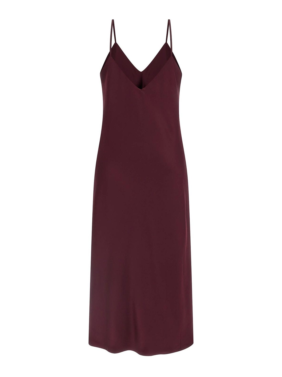 流れるようなサテン調の生地を使用したバイアススリップミディドレス。斜めカット、前面と背面に幅広のVネック、細いストラップ、ノースリーブ。