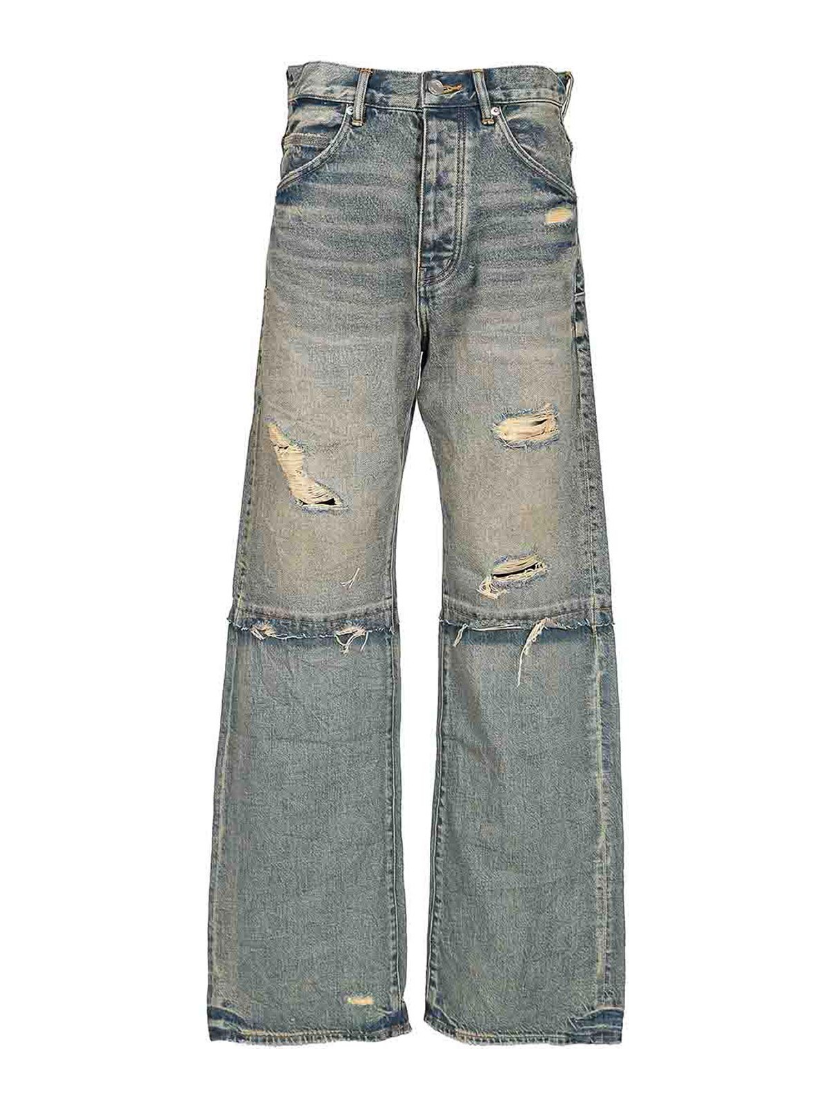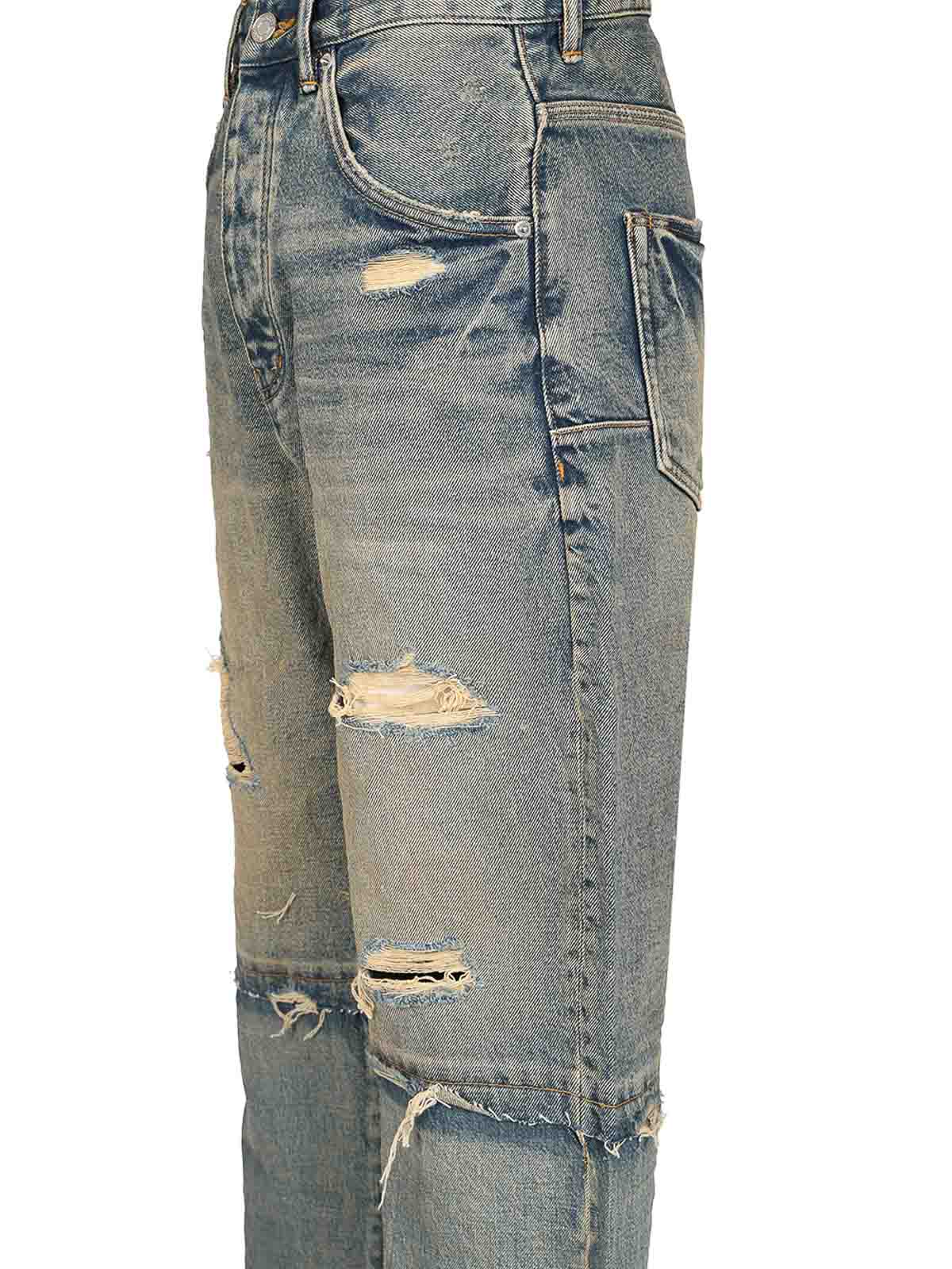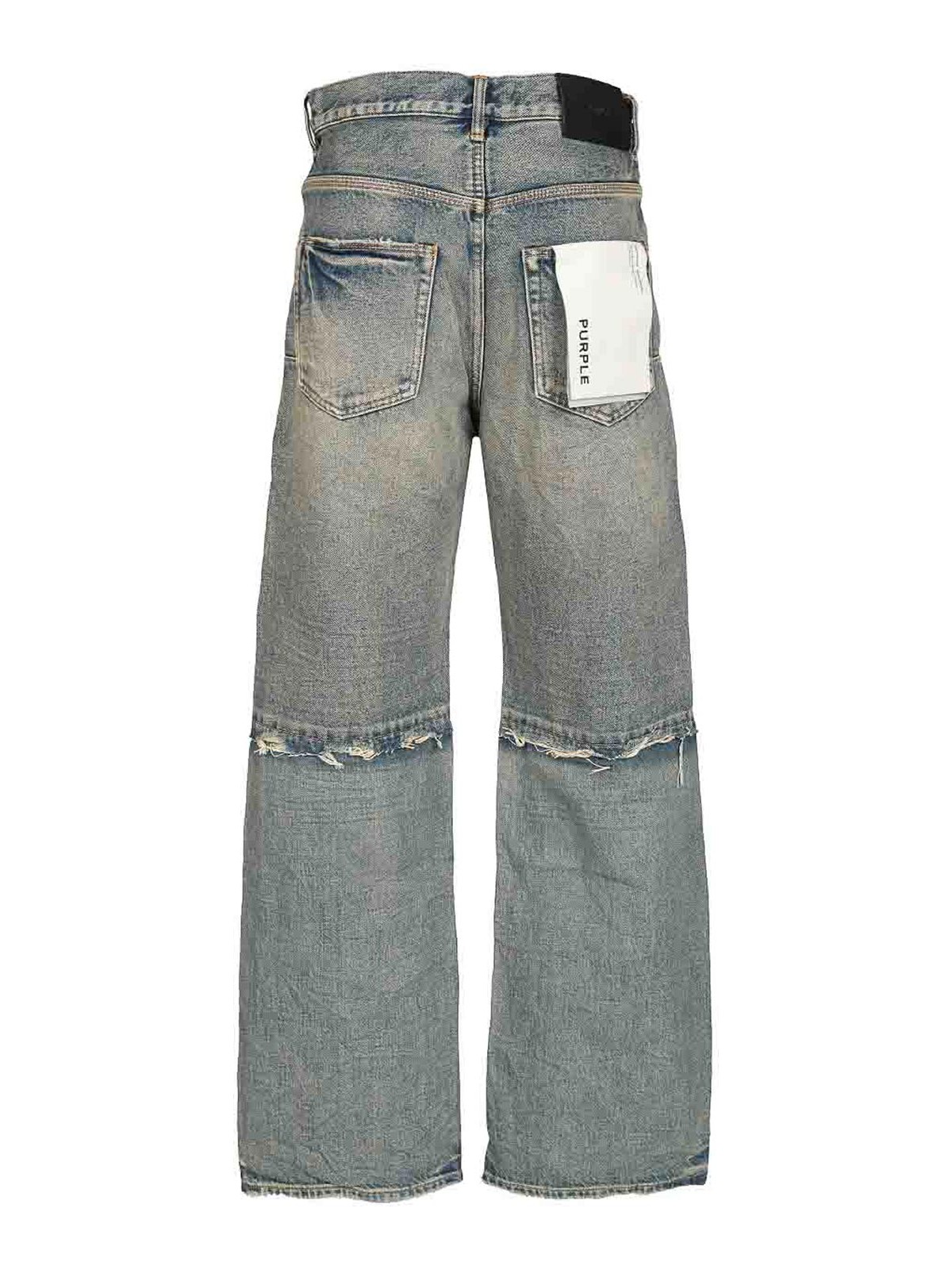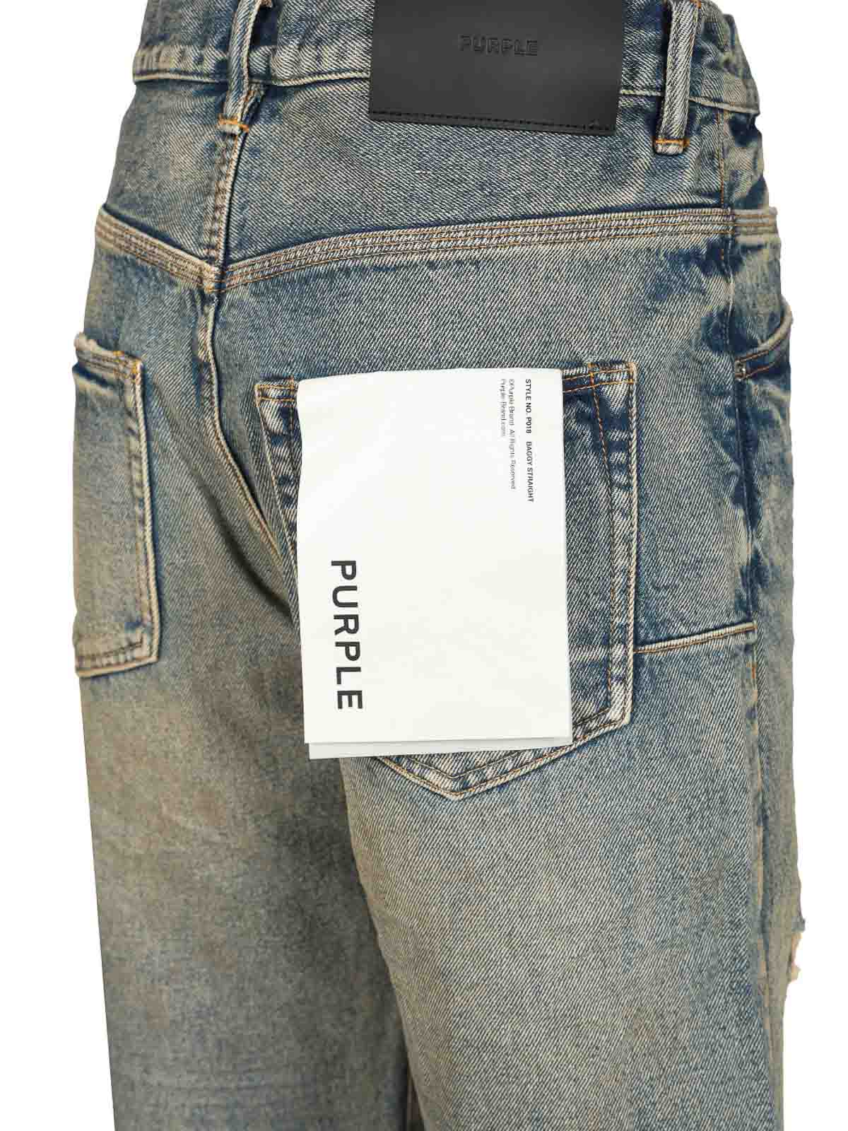 Purpleの「p018」ライトインディゴコットンデニムバギーフィットジーンズは、裂け目、ほつれ仕上げ、ダメージ加工による色あせ、ストレートレッグ、ベルトループ、シルバートーンのメタルボタン留めが付いたボタンフライ、ウエストの後ろにロゴパッチをあしらったのが特徴です。