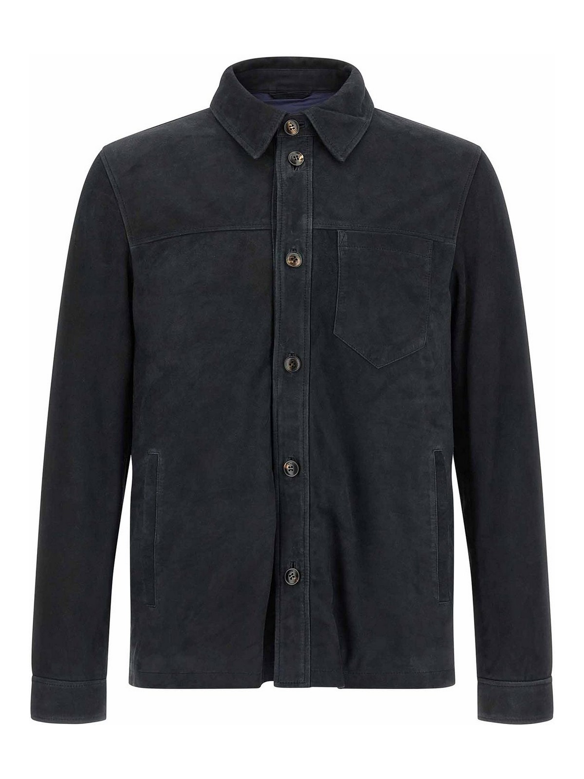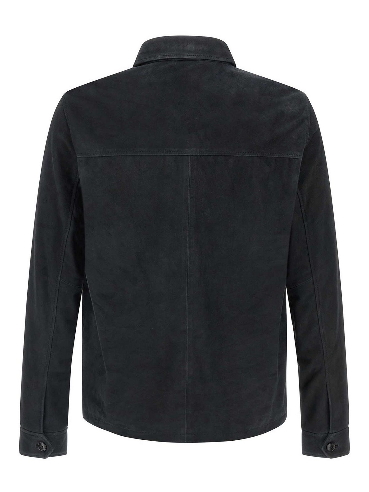 スエードオーバーシャツ、ナイロン裏地、フロントボタン留め、ポケット、ロングカフスリーブ。