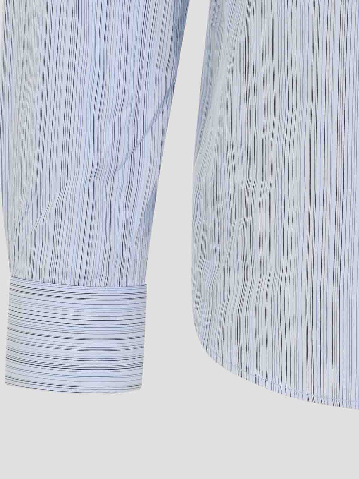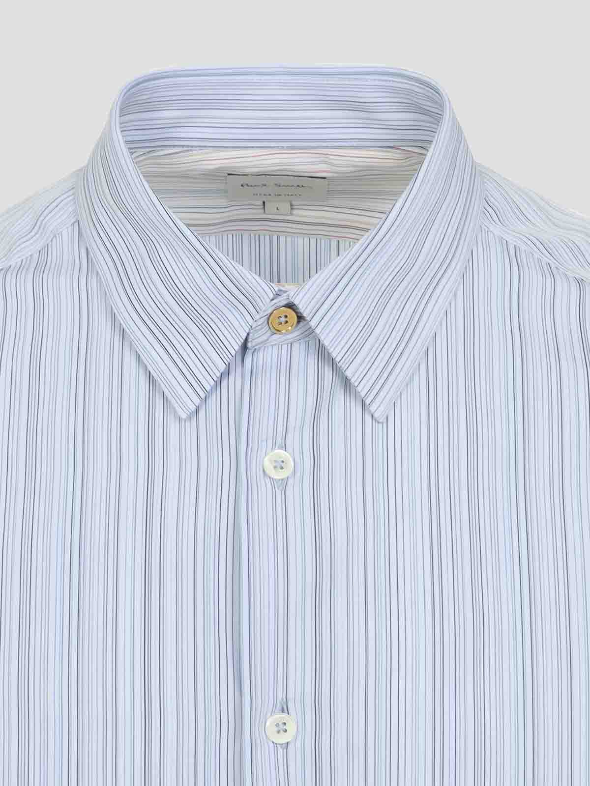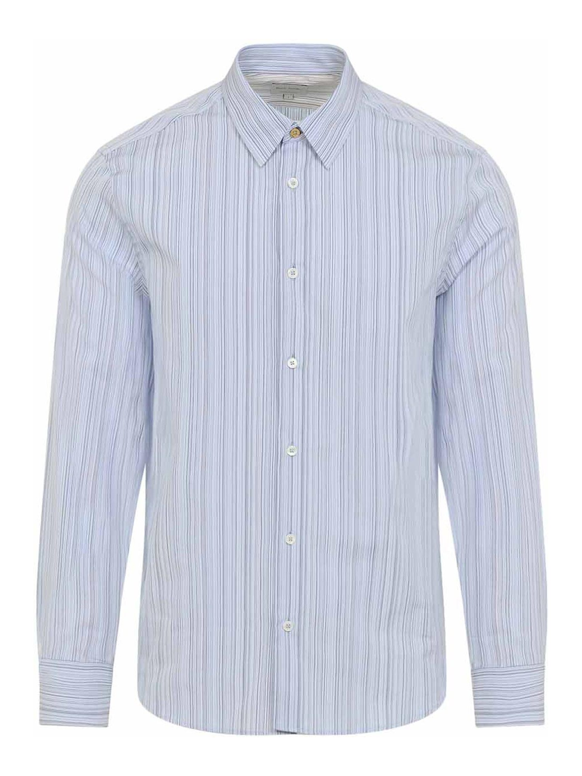 Paul smith スリムフィットライトブルーコットンシャツ。ブルートーンのストライプコットン製のスリムフィットシャツ。ポインテッドカラー、フロントボタン留め、ボタン付きカフス付きロングスリーブ、バックヨーク、丸みを帯びた裾が特徴です。