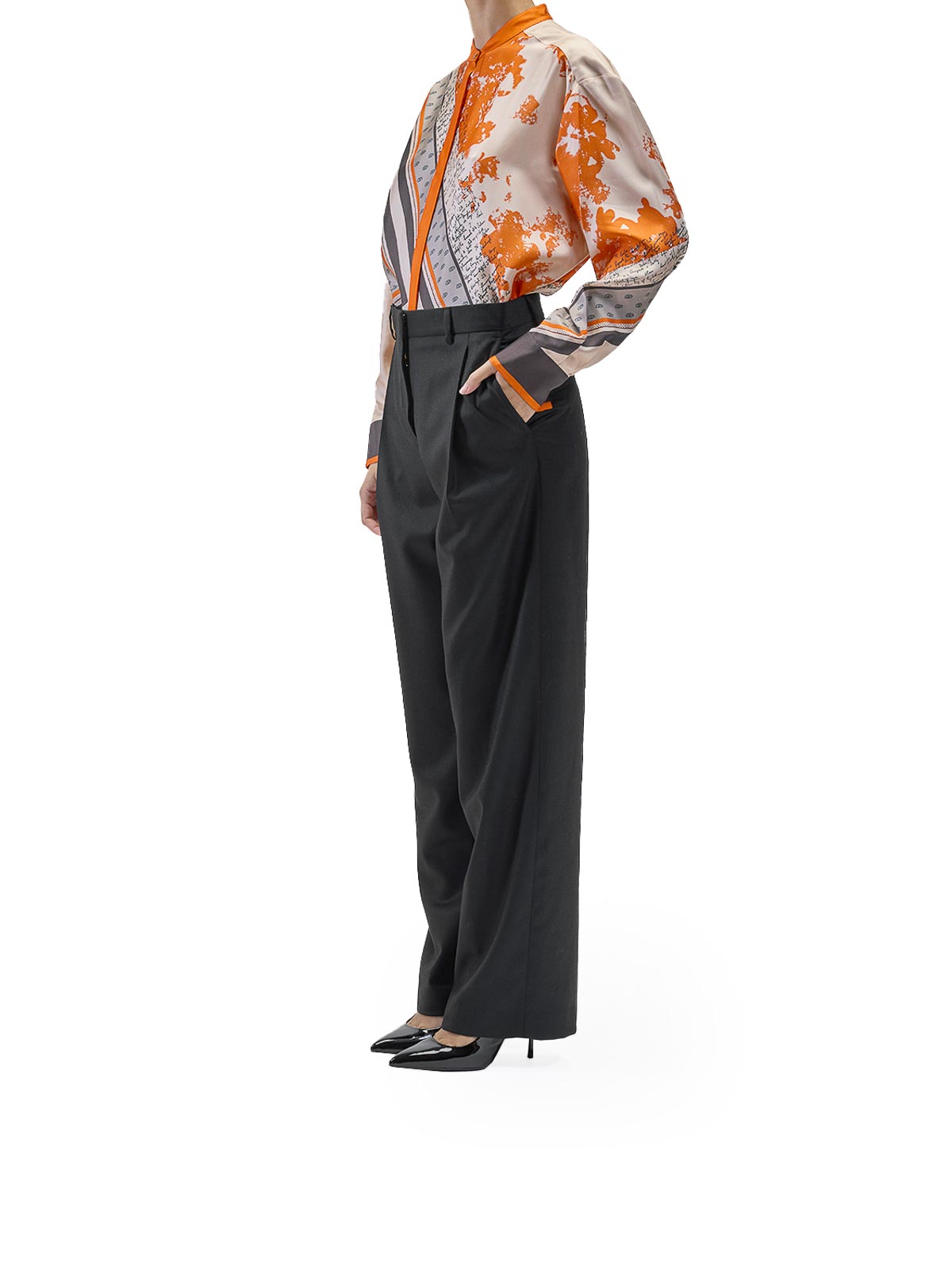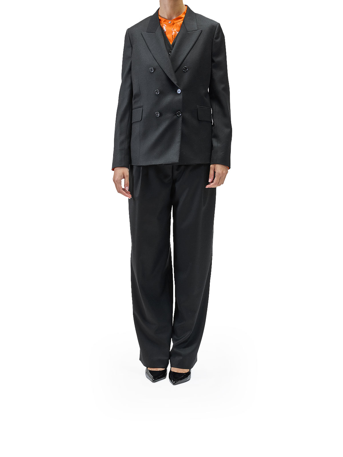 プリーツフランネルのトラウザーズ。カラーはブラック。Paul Smithのウールワイドレッグパンツ。フロントにプリーツをあしらい、ファスナーとフックで留めます。ワイドレッグ、フロントプリーツ、ファスナーとフック留め、サイドポケット2つ、バックボタンポケット2つ。カラー:ブラック。100% ウール。ルーズフィット。イタリア製。