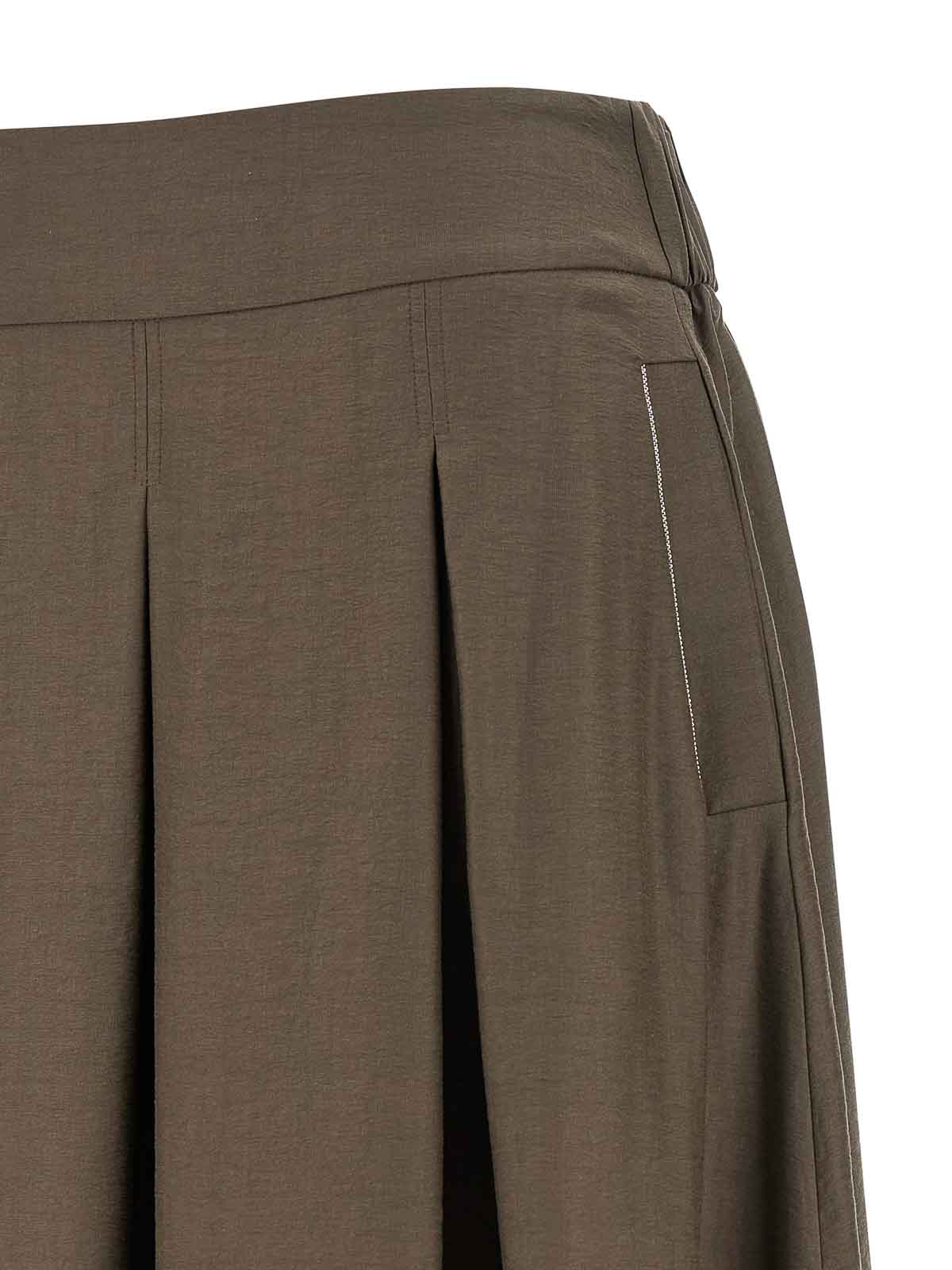 流れるような生地のミディスカート、Aラインシルエット、ピンス、後ろにゴム入りのウエストバンド、金属製の「プントルース」ディテールをあしらったポケット、キュプラの裏地。