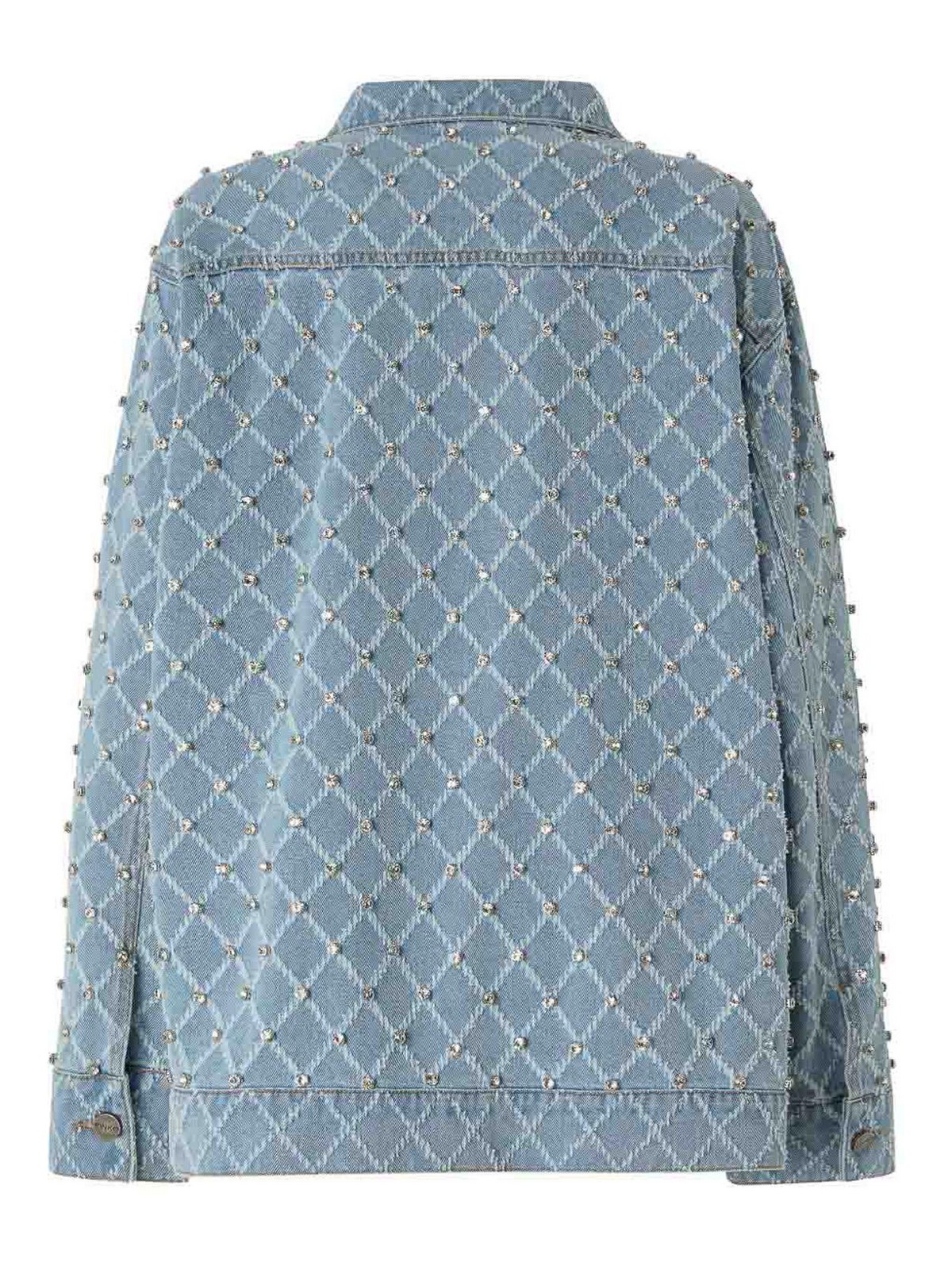 ラインストーンで装飾されたデニムジャケット。長袖とフロントポケットが特徴で、ピンコがデザインしたもので、春にぴったりです。