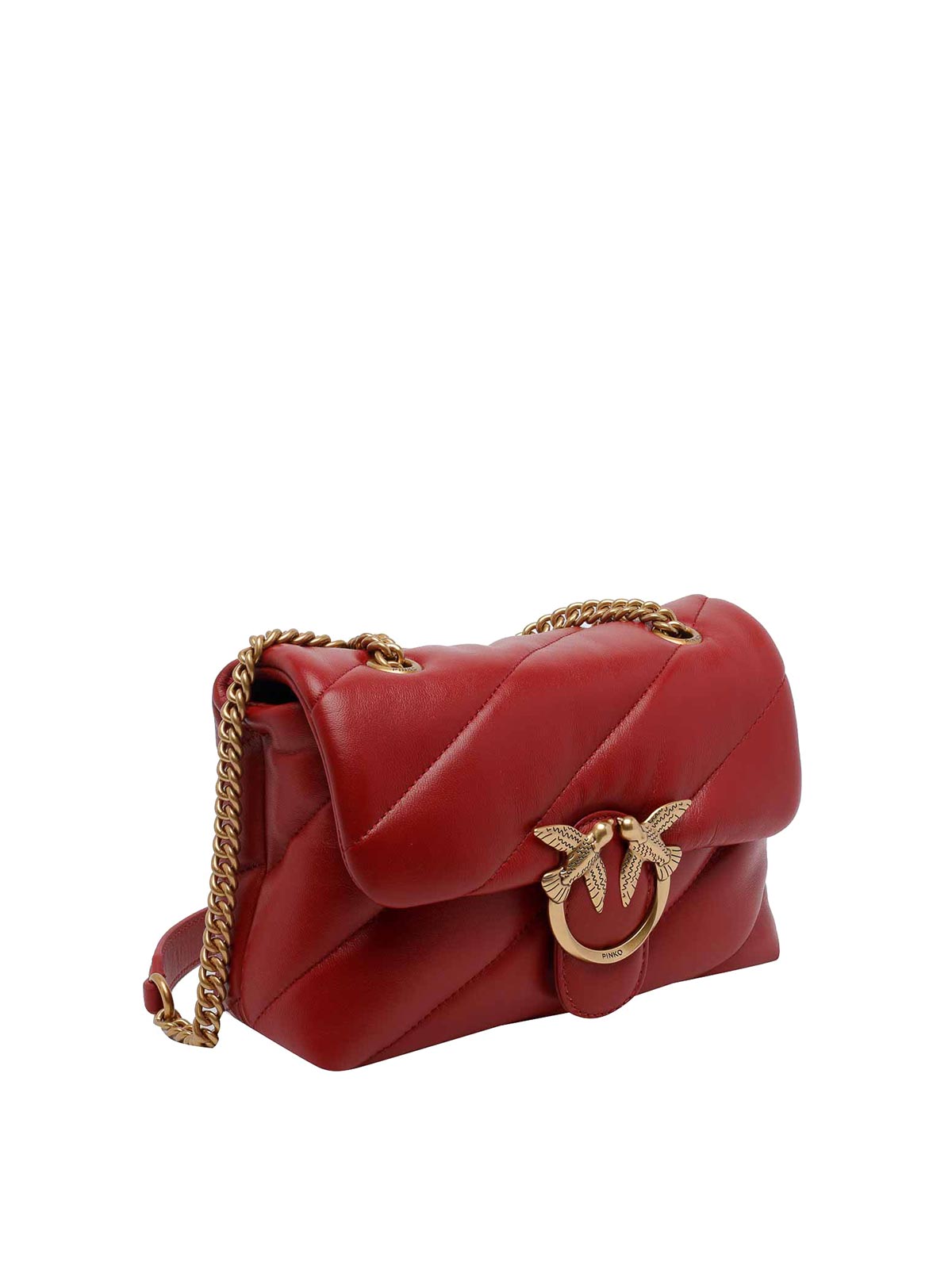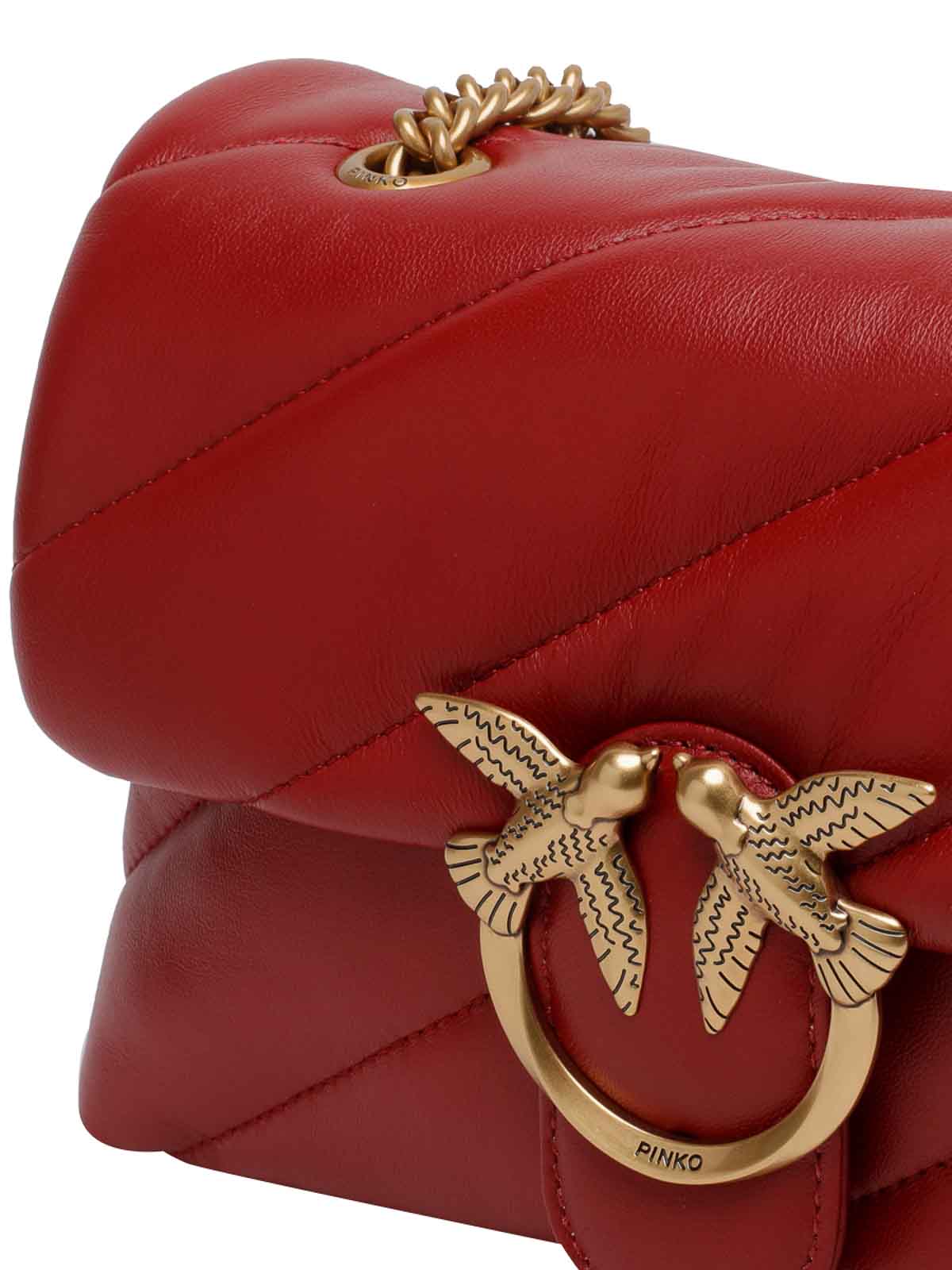 Pinko red love ミニパッファーショルダーバッグ、マグネット式インターロッキングクロージャー、2つのコンパートメント、1つはオープンポケット、もう1つはマグネット付き、内側にファスナーポケット、オープンポケット1つ、チェーン付きストラップ、前面に金色のロゴ