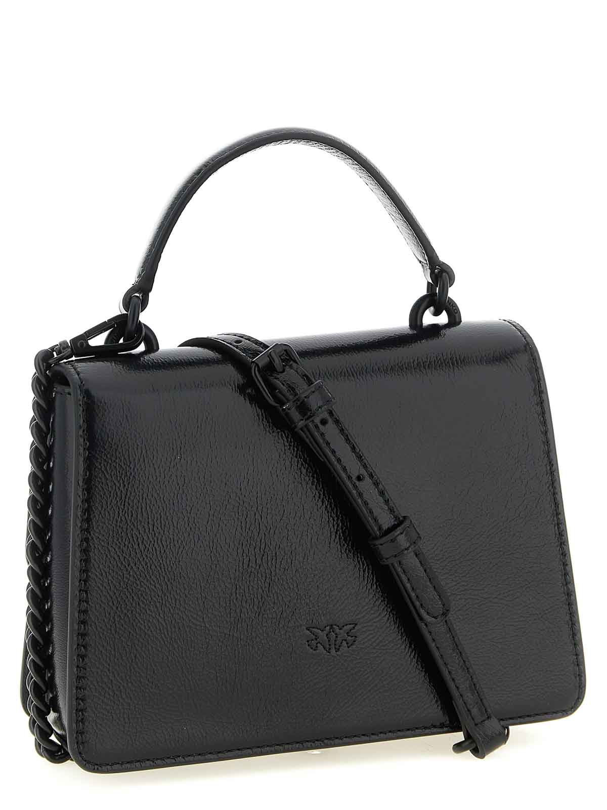 ミニ・ラブ・ワン・ライトのビンテージ光沢レザーハンドバッグ。壊れた台形の形をしていて、インターロッキングボタン付きのフラップクロージャー、前面にトーン・オン・トーンのメタルの「ラブバーズ・ダイヤモンドカット」バックル、背面にロゴ刺繍、固定ハンドル、コットンドリル生地の裏地、取り外し可能なレザープロテクション付きのチェーンショルダーストラップ。