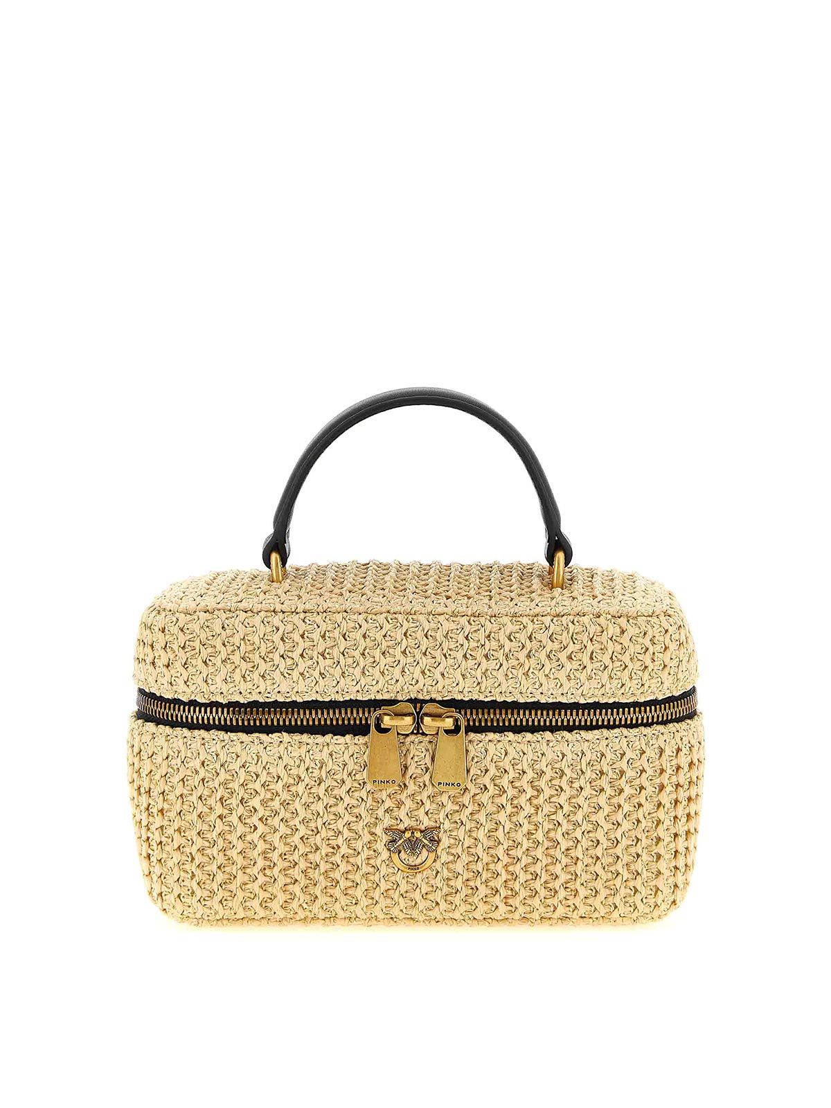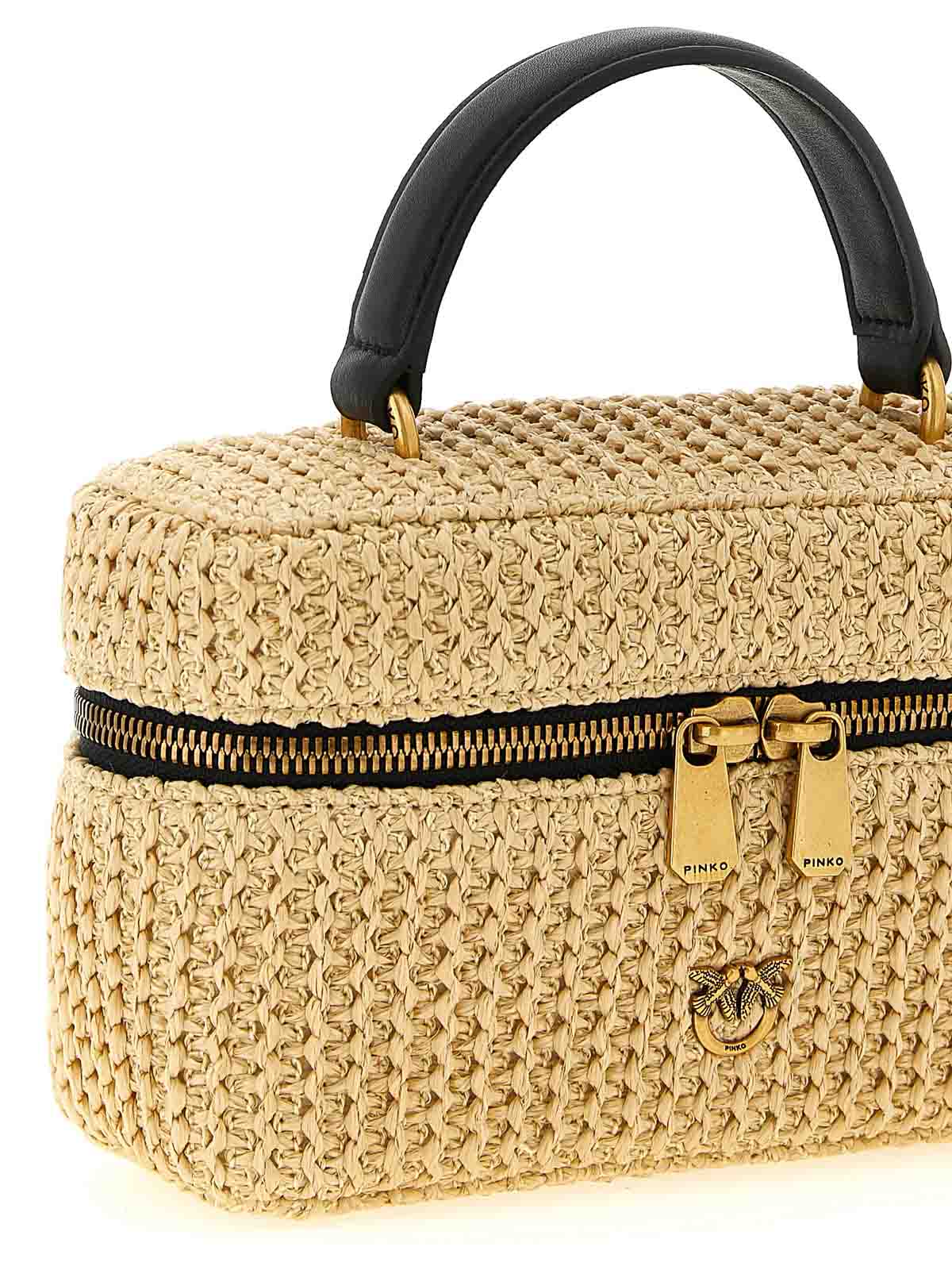 カーフレザーのディテールが施されたバニティソフトミニクロシェットラフィアハンドバッグ、前面にアンティークメタルの「ラブバードダイヤモンドカット」ロゴ、固定ハンドル、ジッパー、ハードボトム、調節可能で取り外し可能なショルダーストラップ。