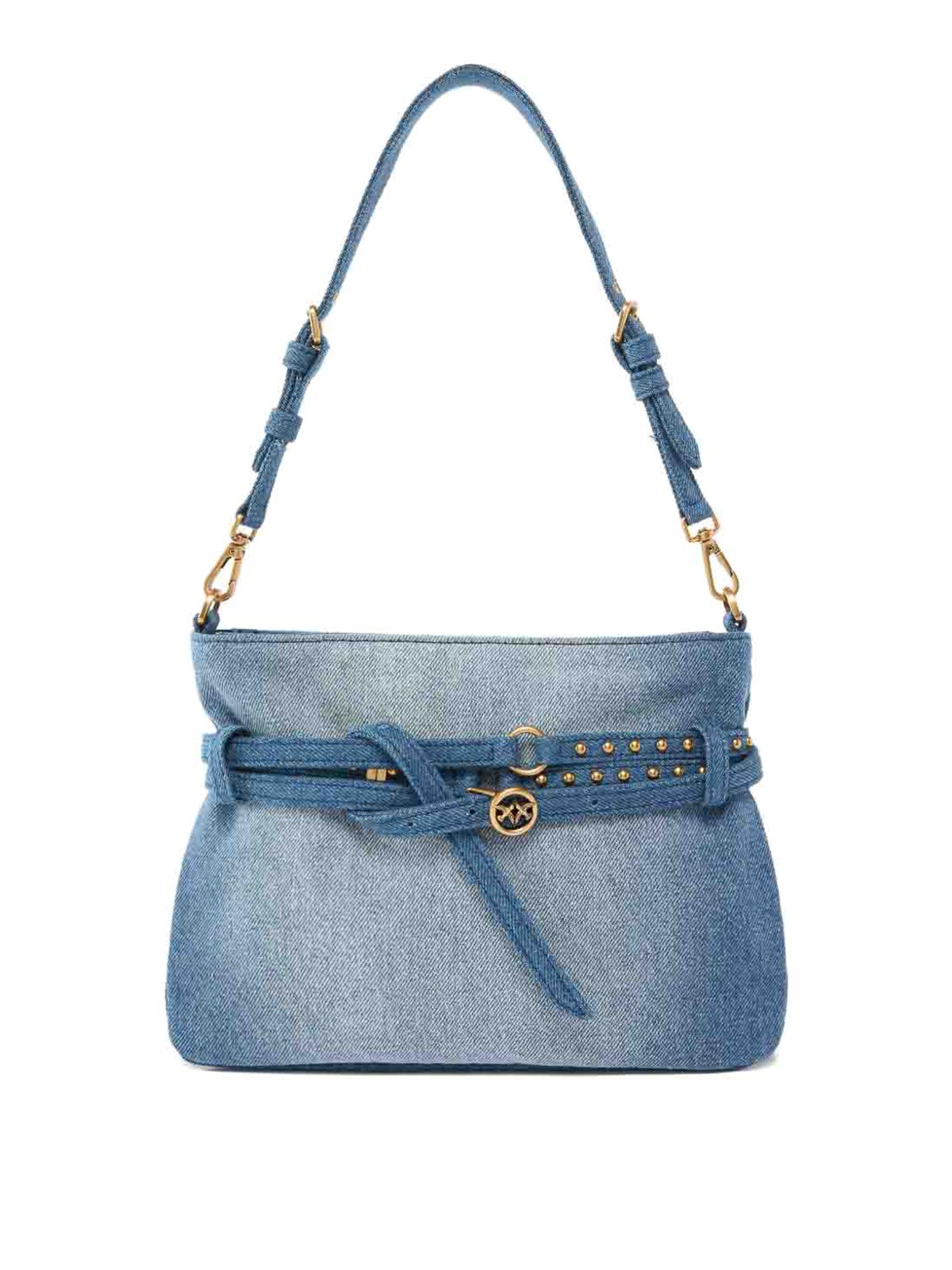 ソフトデニムブルーのスエードで作られたpinkoのスモールベルトショルダーバッグ。取り外し可能で調節可能なショルダーストラップ、シグネチャーのラブバードバックルが付いたベルトのディテール、トップジップクロージャー付きのメインコンパートメント、ゴールドトーンの金具が特徴です。エレガントで用途の広いデザインで、個性的で洗練されたタッチで日常や夜の装いを盛り上げるのに最適です。