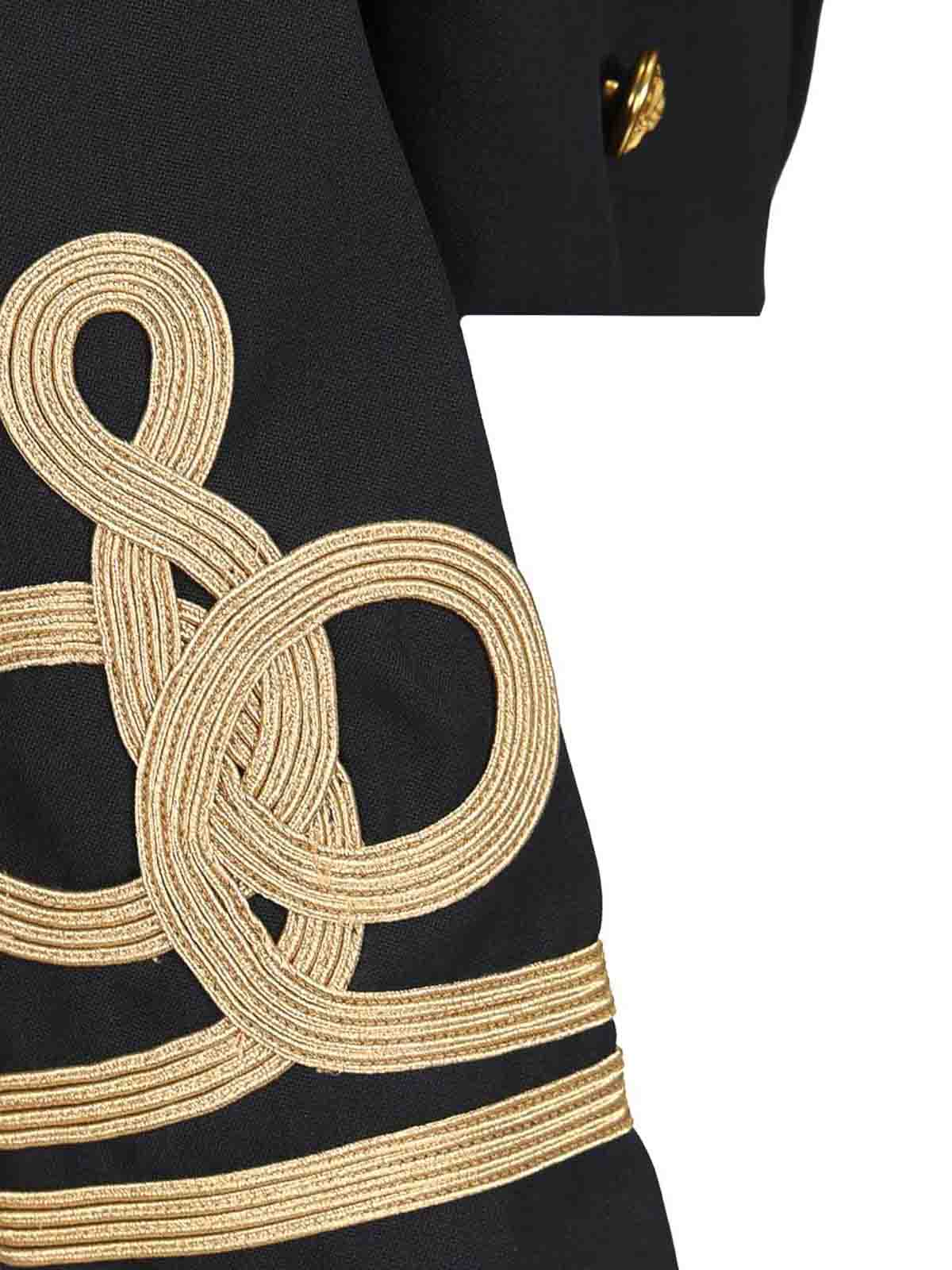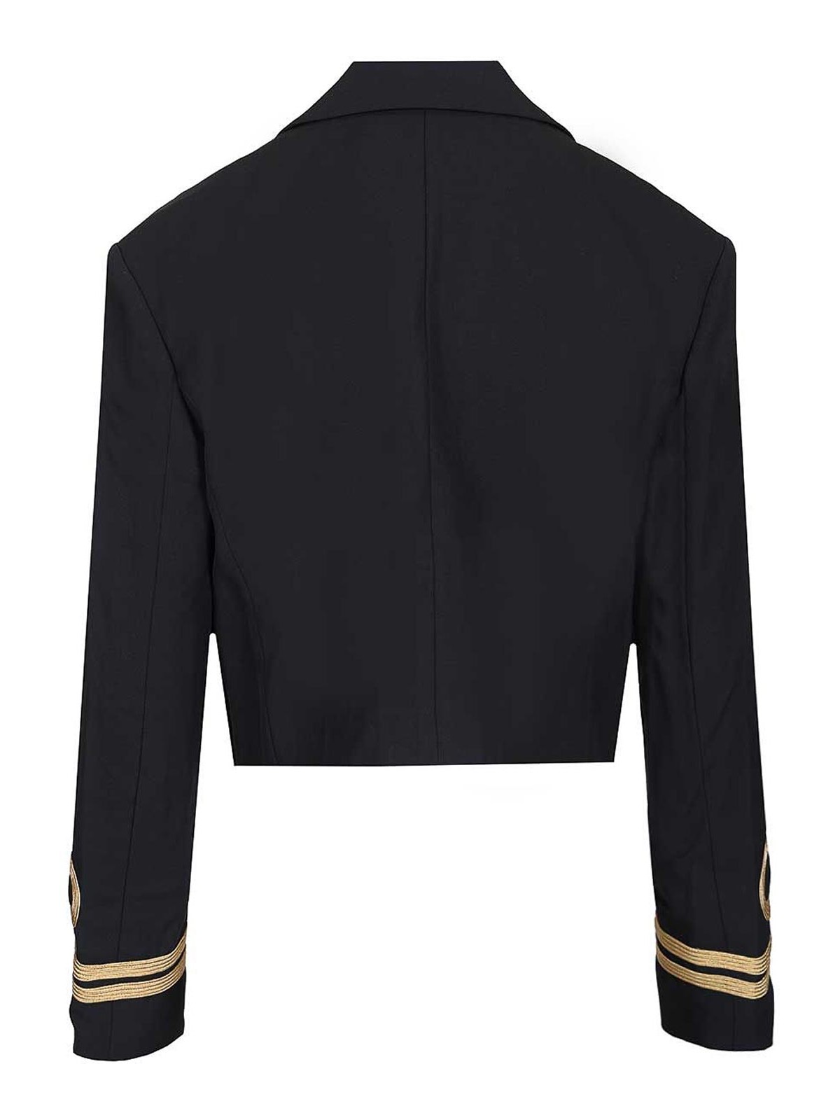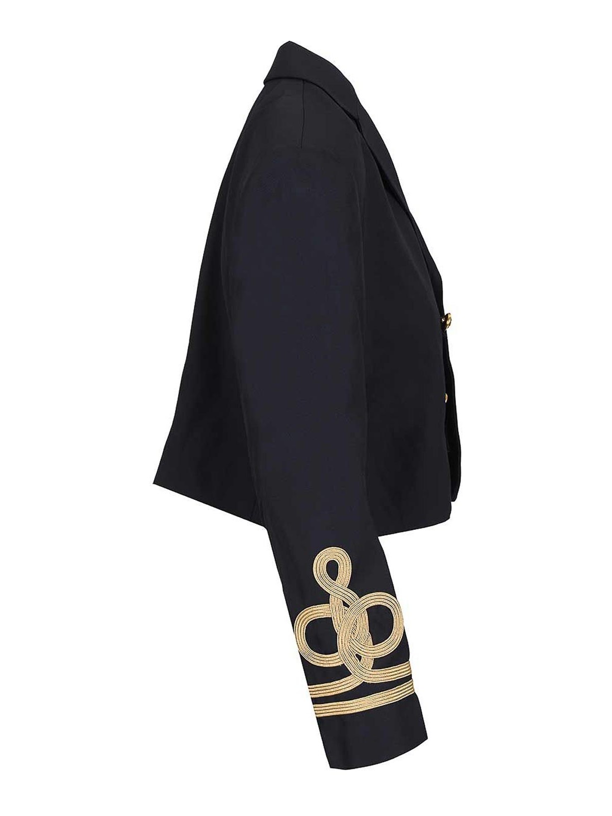 ネイビー風のショートダブルブレストウールブレザー。ゴールドメタルのボタン留めと袖にゴールドの装飾が施されています。