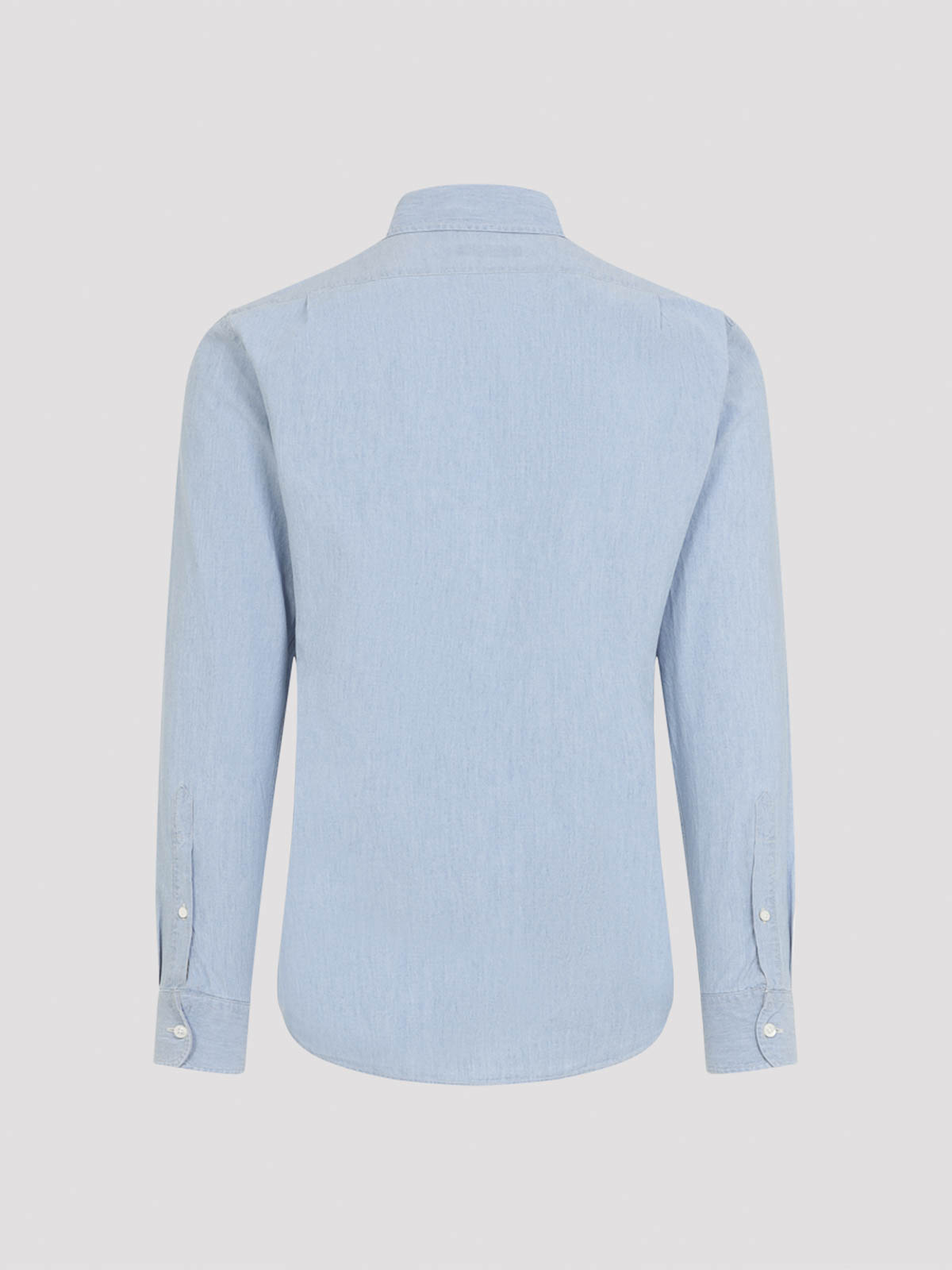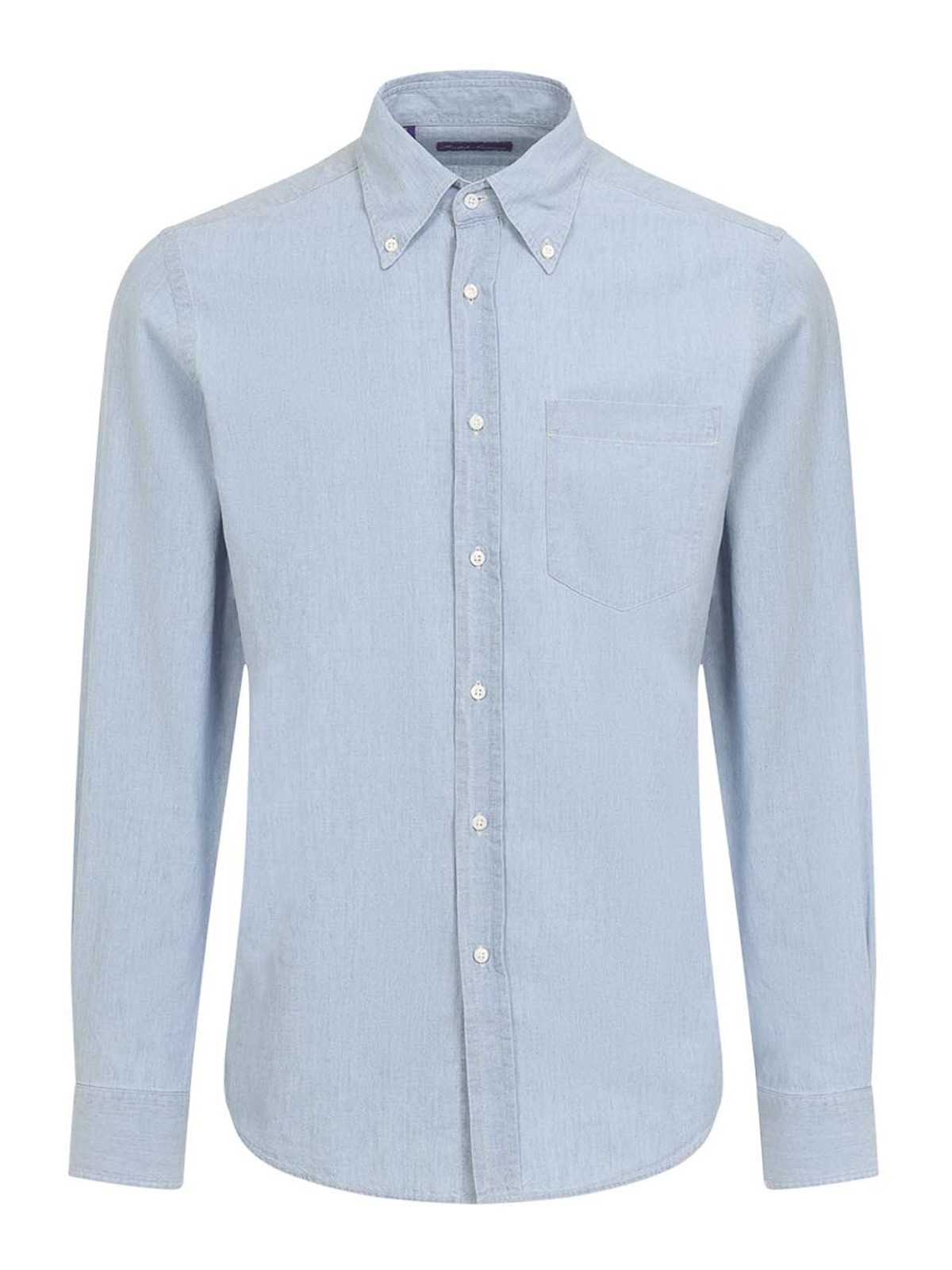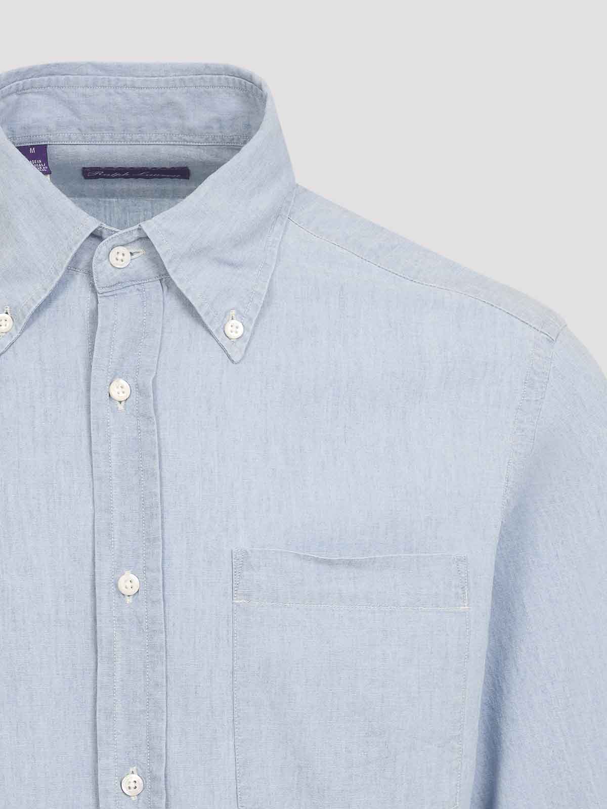 ラルフローレンパープルレーベルミディアムウォッシュブルーコットンスポーツシャツ。ピュアメディアムウォッシュブルーコットンシャツ、先のとがったボタン付き襟、フロントボタン留め、パッチポケット、長袖、ボタン付きカフス、ラウンドヘム。