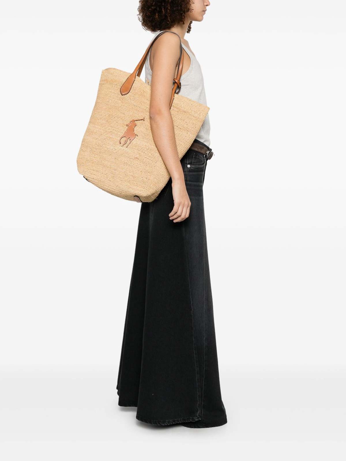ブラウンレザーのハンドルとポロのロゴが目立つようにあしらったポロラルフローレンのショッピングバッグ。軽量で広々としたデザインは、街でのお出かけ、夏休み、カジュアルなビーチルックに最適で、レザーハンドルは耐久性と快適なグリップを提供します。エレガントなスタイル、日常の機能性、ポロラルフローレンのアイデンティティを兼ね備えた多用途のアクセサリー。実用的でありながら洗練された着用に最適なポロローレンのアイデンティティを兼ね備えていますラルフローレン