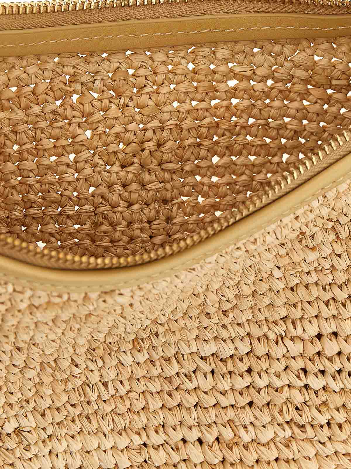 Polo id' ラフィアショルダーバッグ、サドルシルエット、ファスナー開閉、穴あきロゴ入りレザーハットンバックルディテール、固定式レザーハンドル、レザーディテール