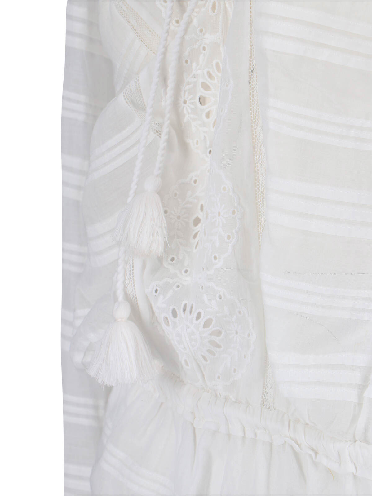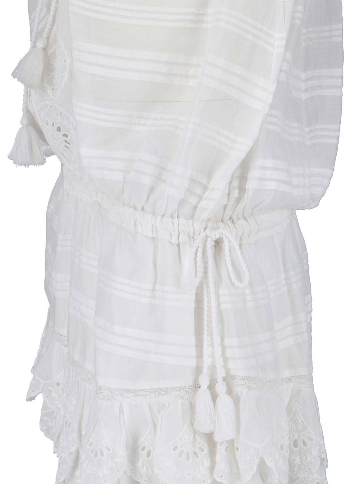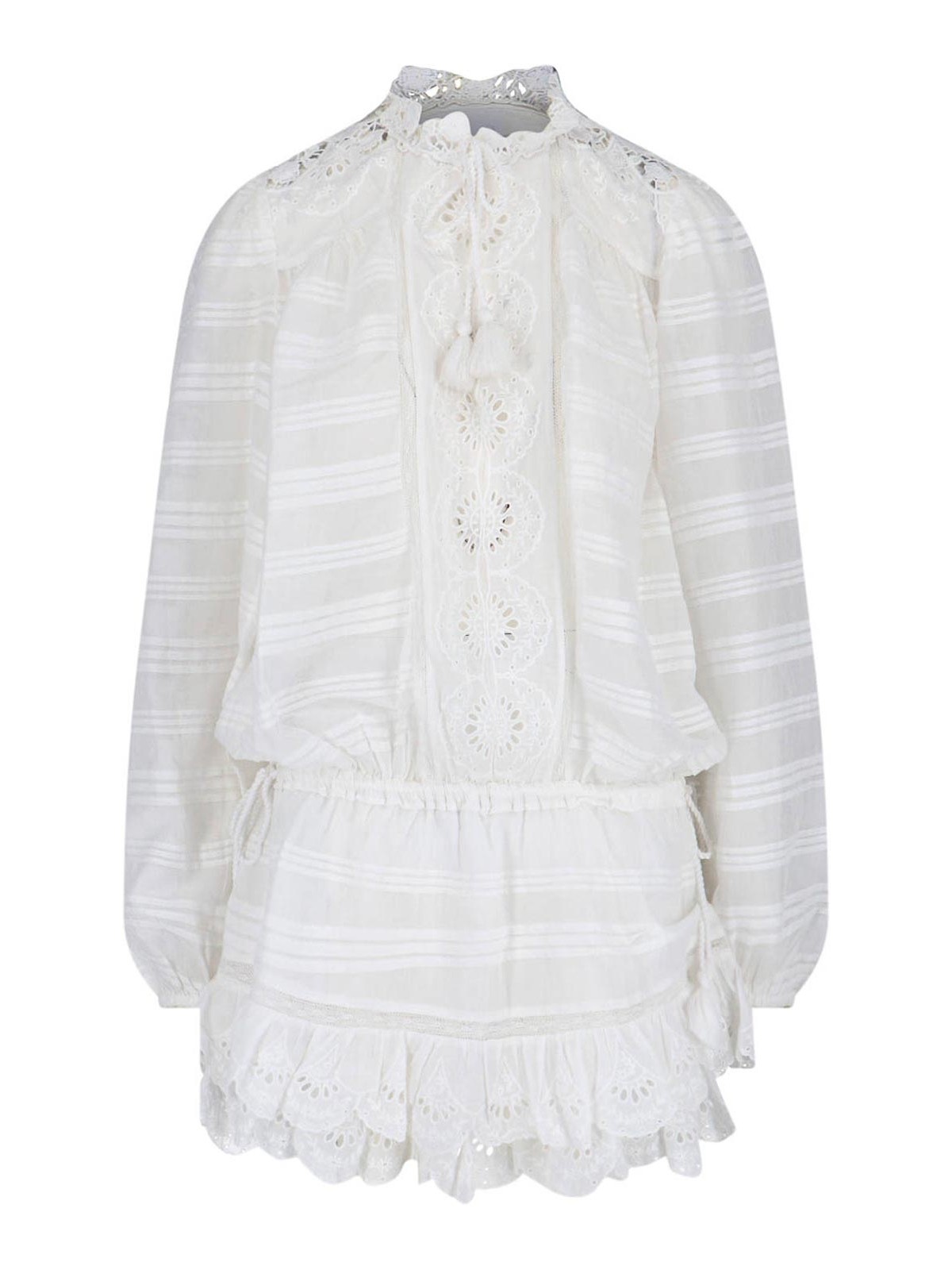ホワイトオーガニックコットンのプレヤ・イザベル・マラン・トワール・ミニドレス、ハイネック、ロングスリーブ、全面レースのディテール、調節可能なドローストリングウエスト、アシンメトリーヘム。