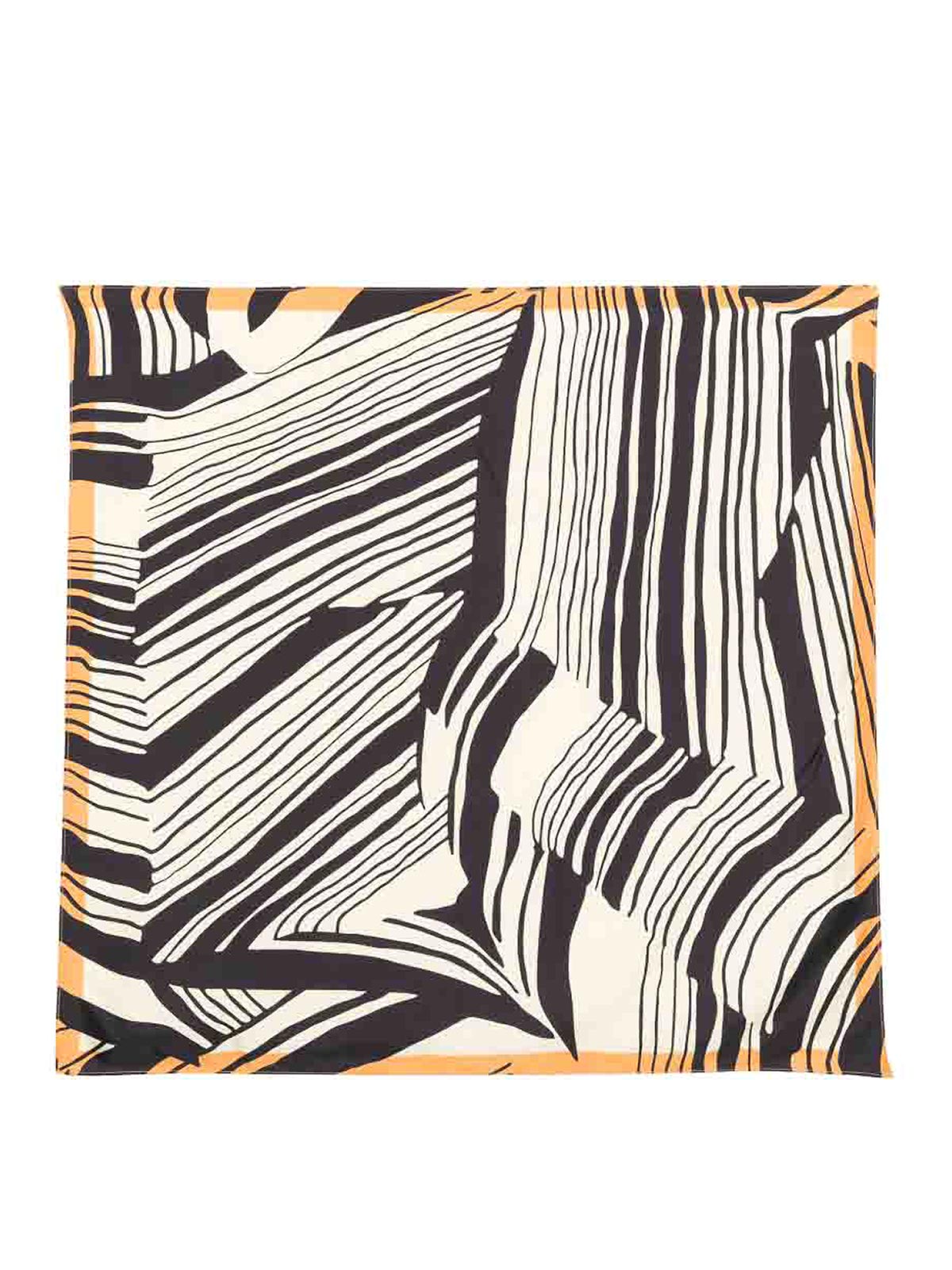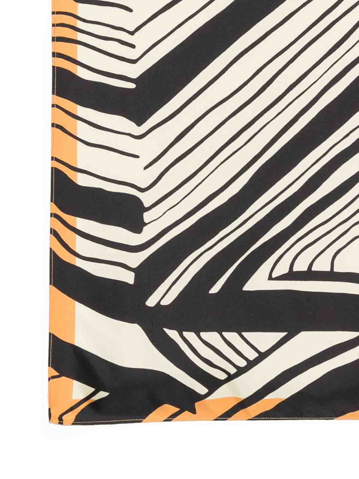 raquel dinizのシルクスカーフ。鮮やかなオレンジ色のボーダーに黒と白の抽象的なグラフィックプリントが施されています。軽量で滑らかな生地はエレガントで自然なドレープ感があり、首に巻いたり、ヘアアクセサリーとして、またはバッグに結んだりするのに最適です。多用途で現代的な一品で、シックな日常のルックスや夜のアンサンブルを引き立てるのに最適です。