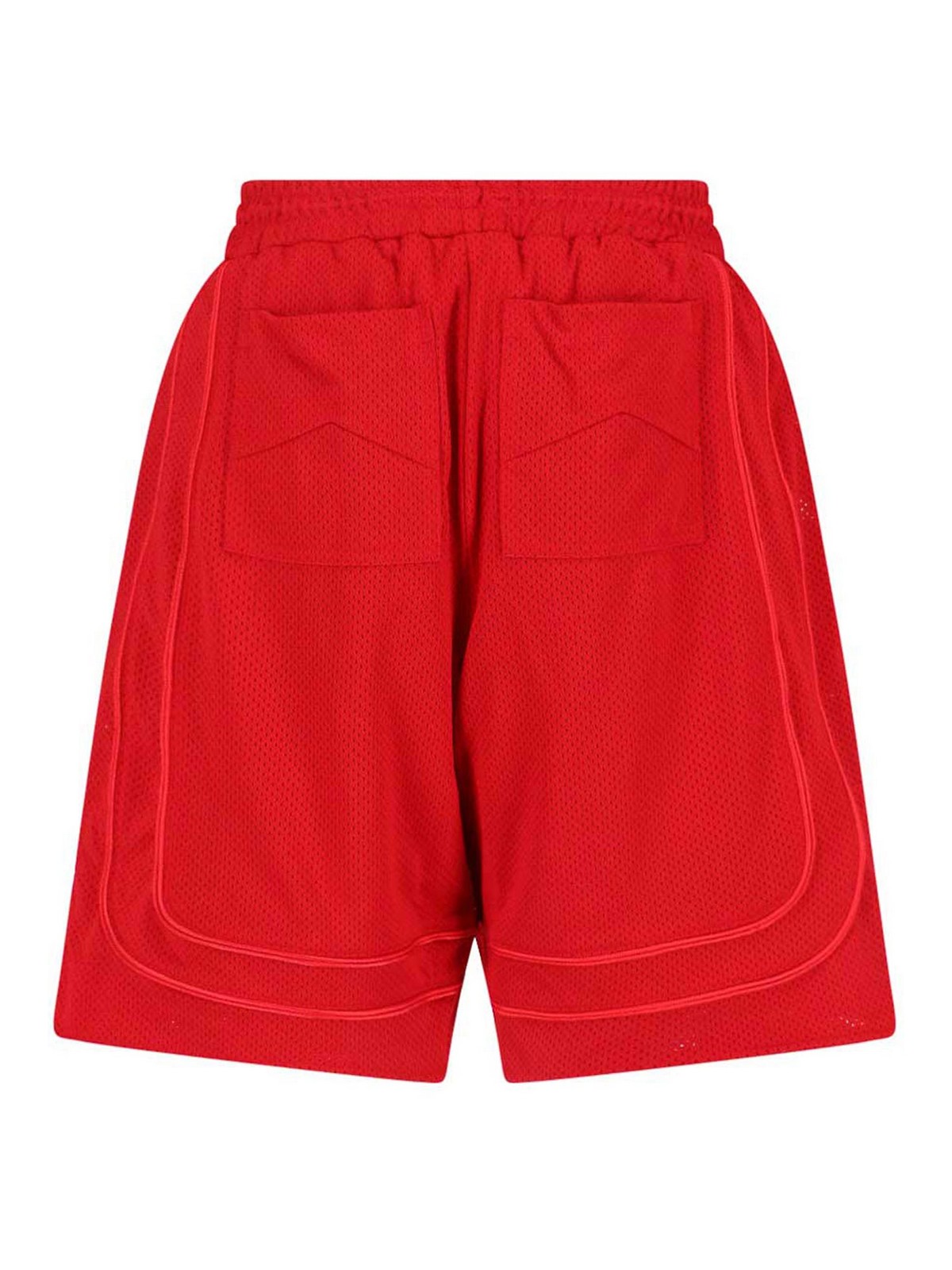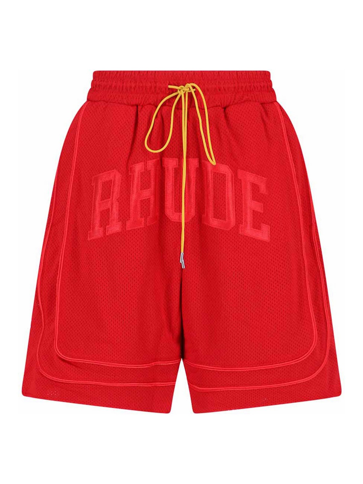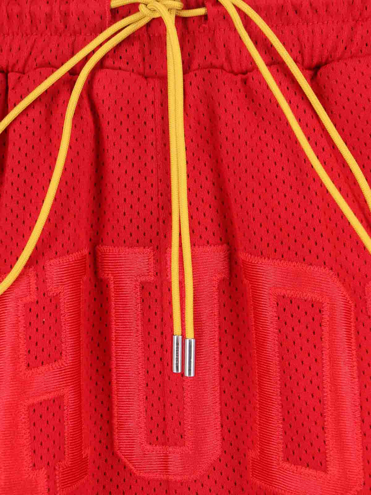 レッドの穴あき生地を使用したRudeロゴショートパンツ、中程度の伸縮性のあるウエスト、コントラストカラーの調節可能なドローストリング、フロントにトーン・オン・トーンのロゴ刺繍、サイドポケット2つ、バックポケット2つ、ストレートレッグ。
