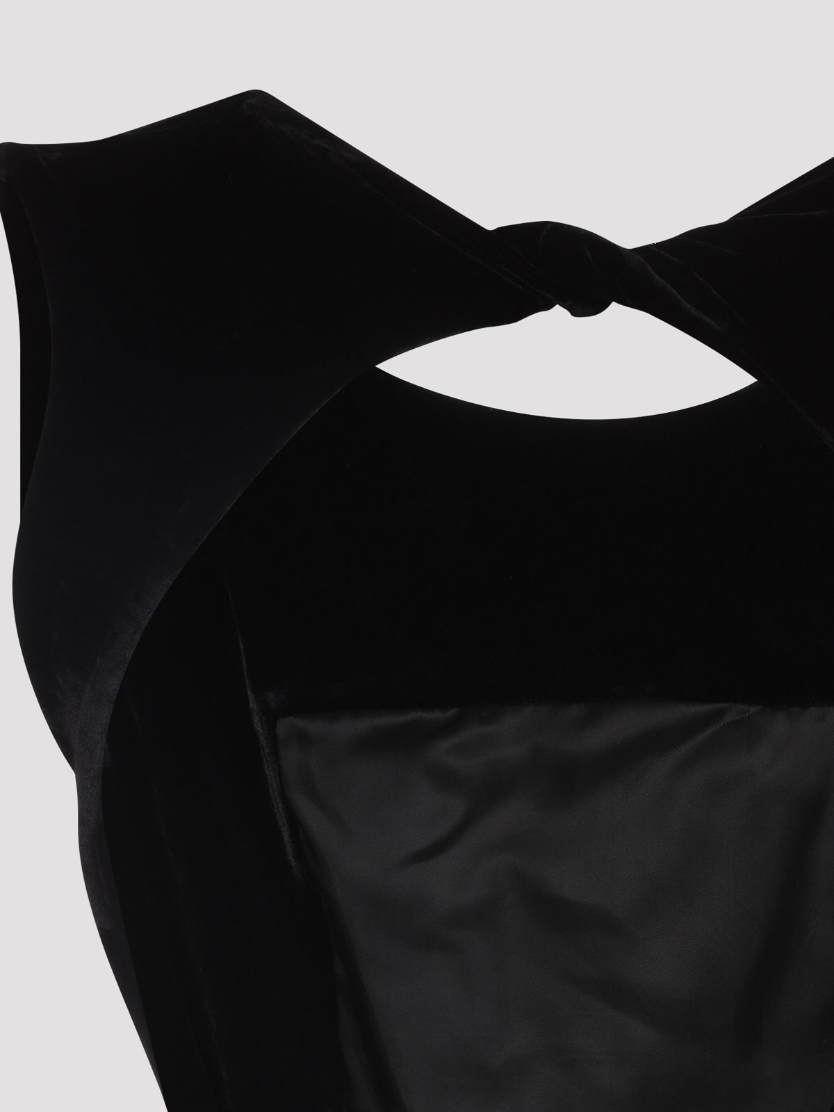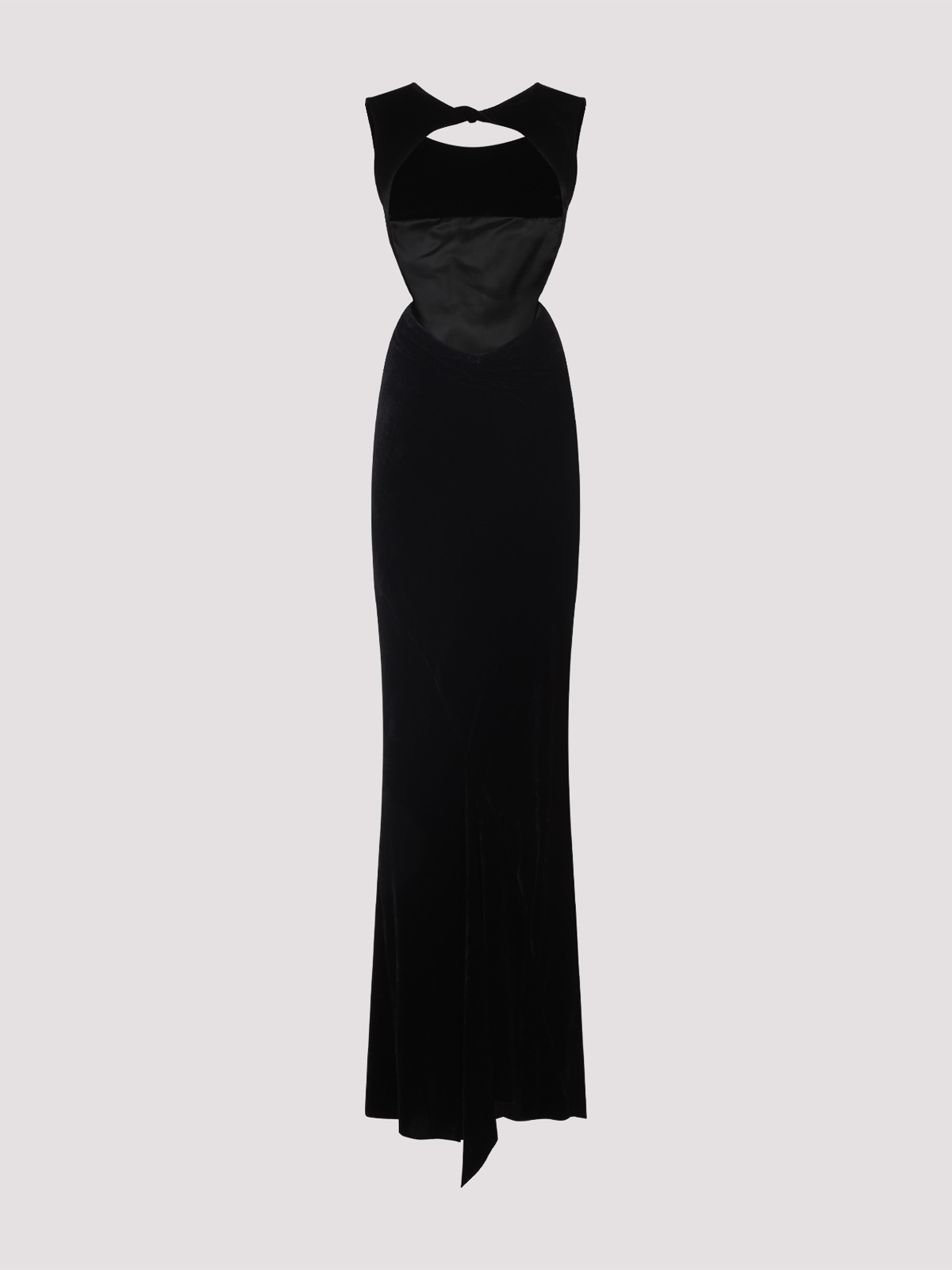 リック・オウエンスのブラックオープンバックガウンロングドレス。ビスコースとシルクの混紡素材で作られた、ラウンドネック、バックオープン、ノットのディテールが施されたバックトーナルストラップ、バックVバック、フィートレングス、トーナルステッチ。