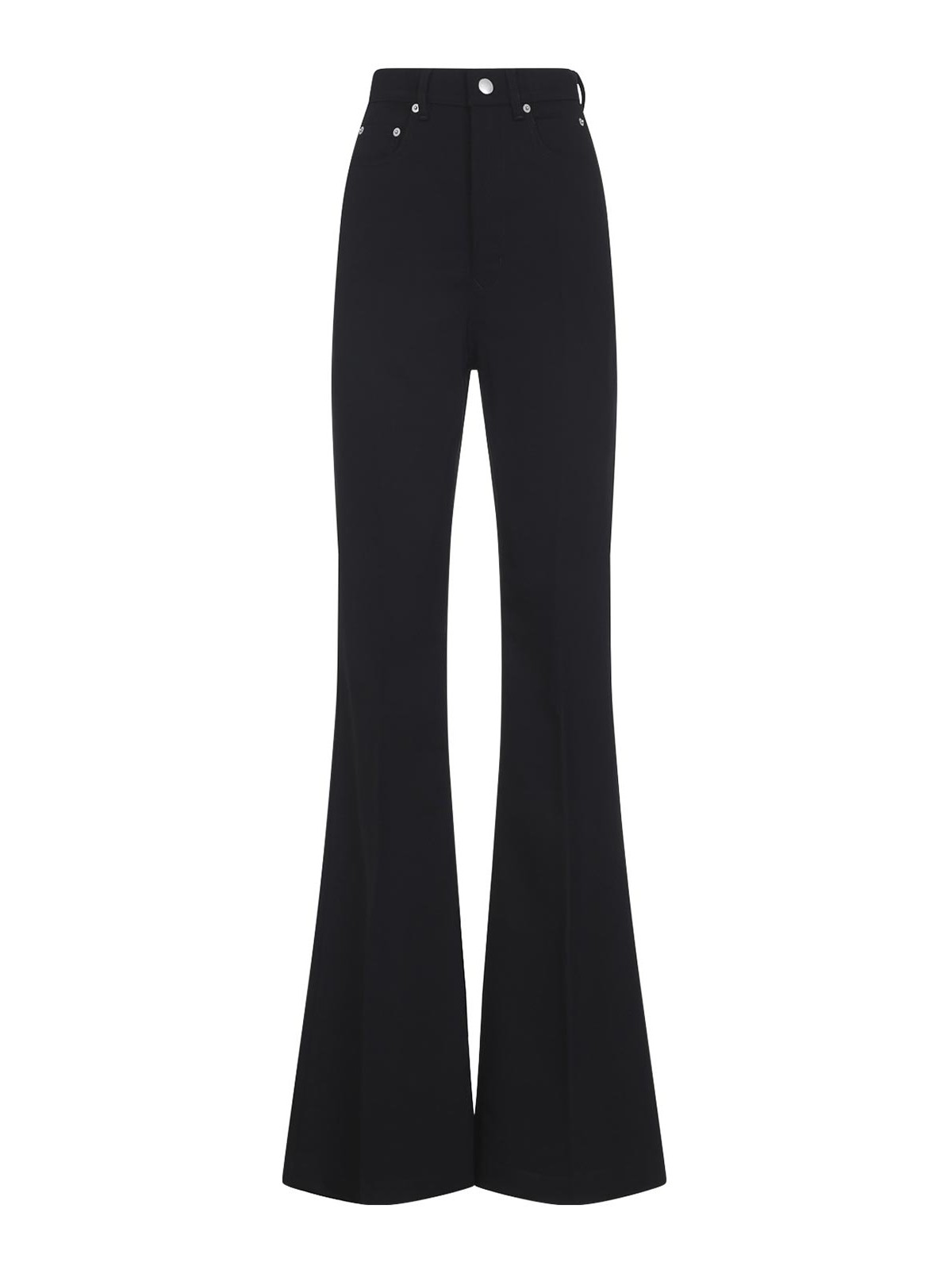 Rick owens Bolan ブーツカットのブラックウールパンツ。ブラックウール製のハイウエストパンツ。アイコニックな6ポケット構造、ベルトループ、フロントボタンフライ、バックのシグネチャーである2ステッチのディテール、ロングフレアレッグが特徴です。