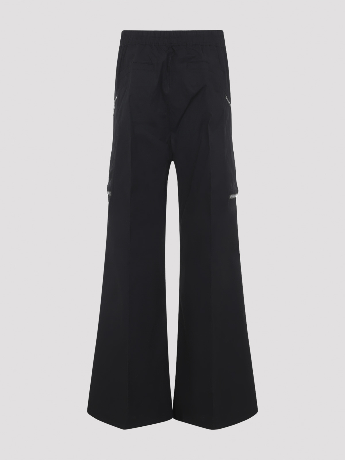 Rick owens Heizer Belas ブラックコットンパンツ。ブラックコットン製のフレアパンツ。アイコニックなドローストリング付きの伸縮性ウエストバンド、フロントファスナー、シルバートーンのメタルアイレットのディテール、スラントポケット、サイドジッパーポケット2つ、背面にウェルトポケット2つ、ワイドレッグ、床まで届く裾が特徴です。