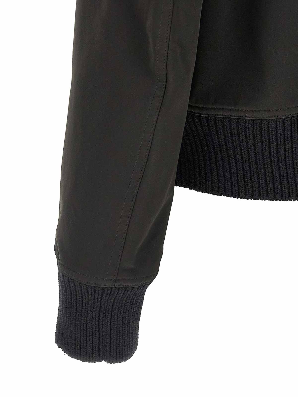 Heizer Flightの光沢のあるコットンボンバージャケット。リブ編みウールニットのディテール、ハイネック、フロントファスナー、ポケット、ロングカフスリーブ、ヘッドバンド付き。