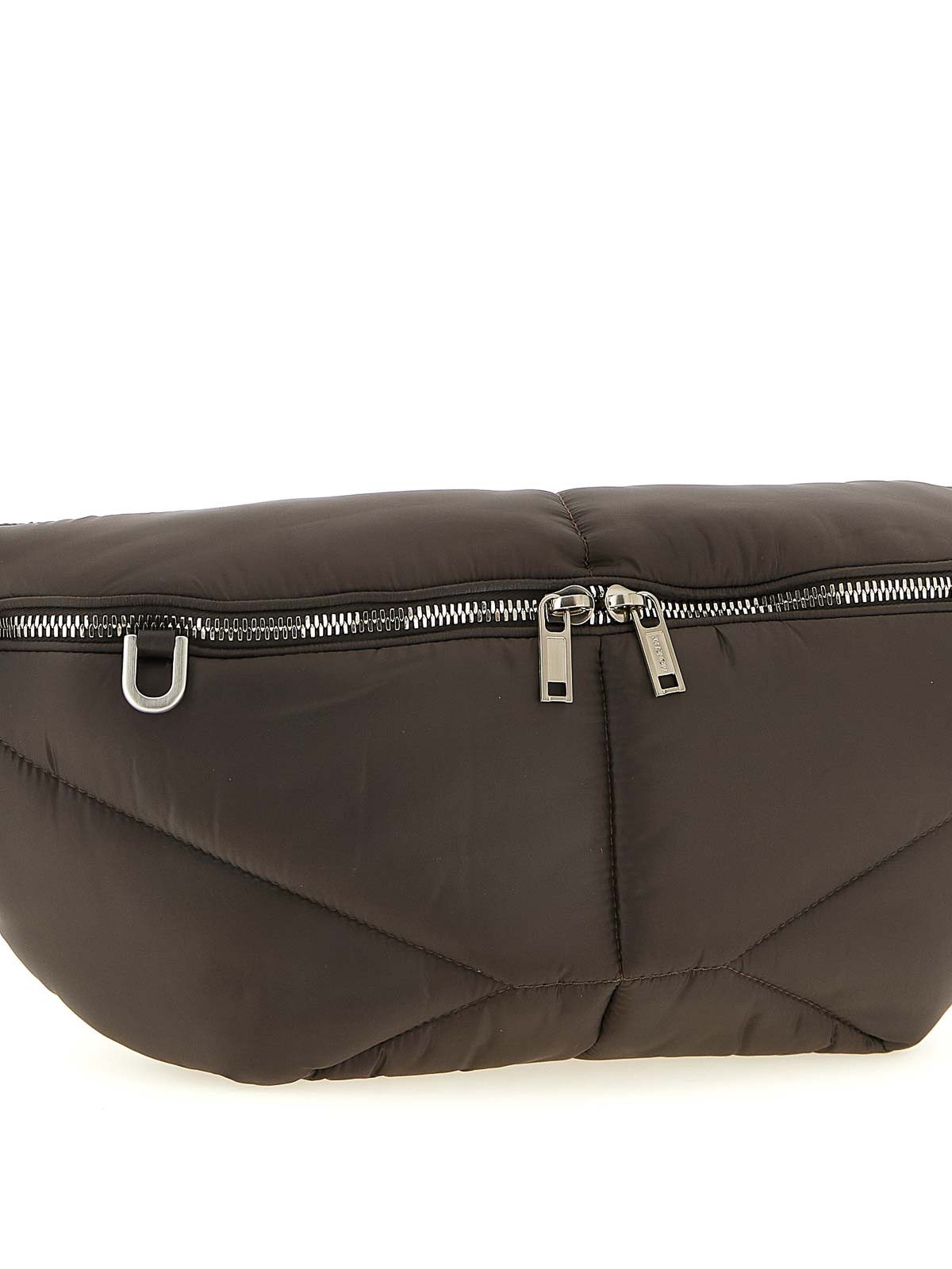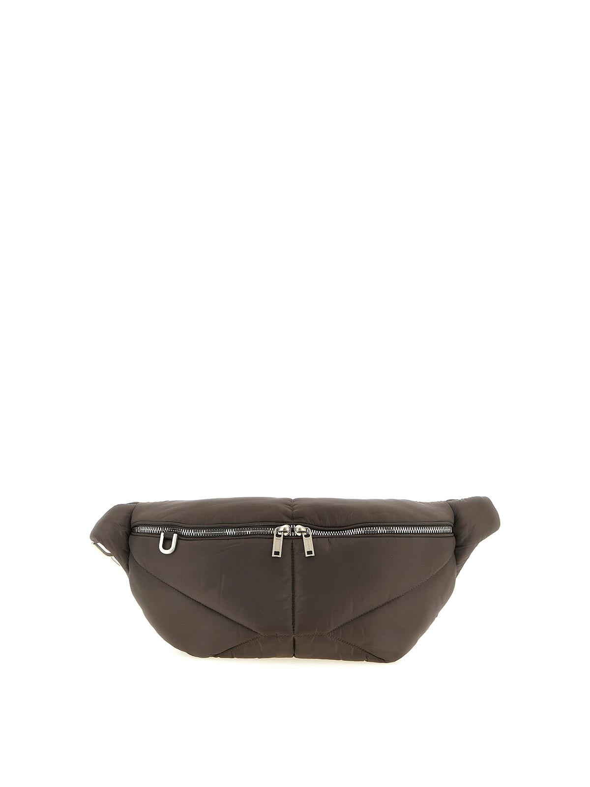 Moncler + rick owens セゾンロングの「バムバッグ」ウエストバッグ。アイコニックな軽いパッド入りのメガペンタキルトパターン、フロントにジップクロージャーとメタルDリング、バックにジッパーポケット、スナップフック付きの調節可能なリボンショルダーストラップが付いています。