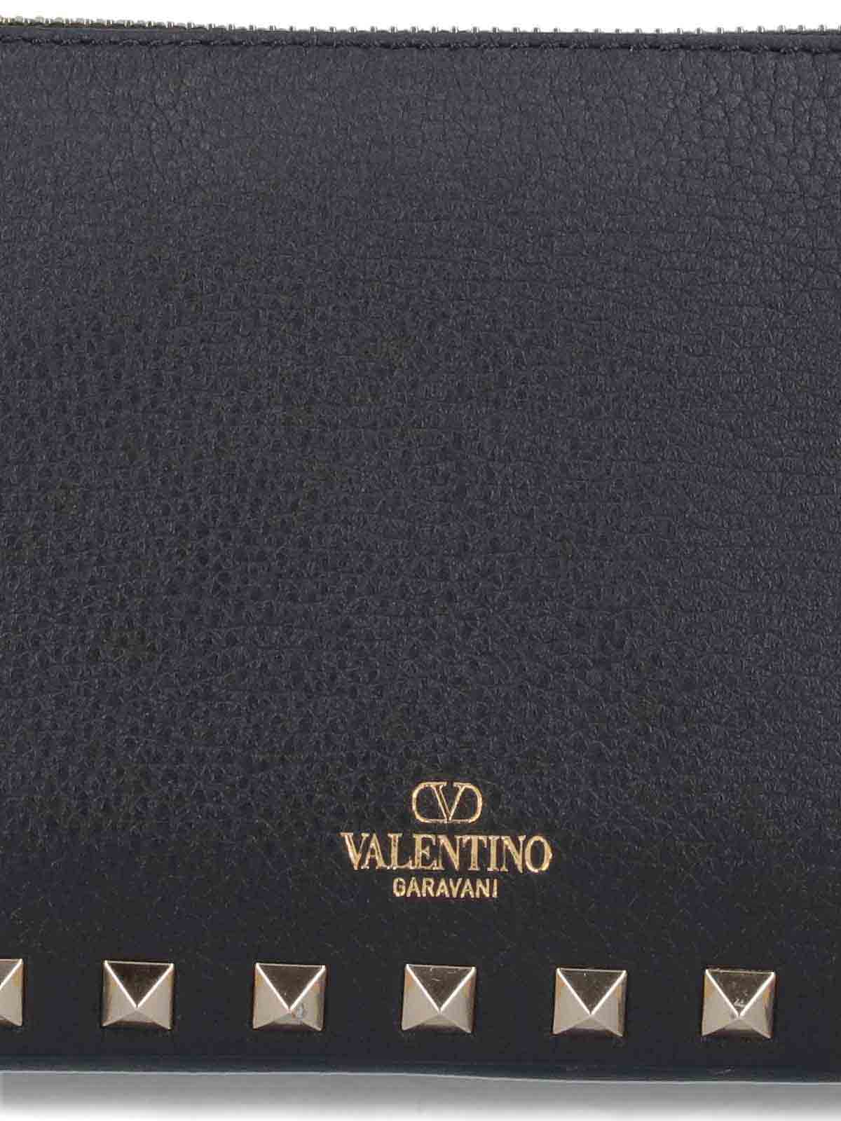 Valentinoの小さなロックスタッズショルダーバッグ、ブラックの質感のあるレザー製、全面にゴールドのメタルスタッズ、ハンドル、調節・取り外し可能なショルダーストラップ、フックとジッパー、背面に金色のエンボス加工ロゴ、内側にカードスロット1つ、メインの内部コンパートメント1つ。