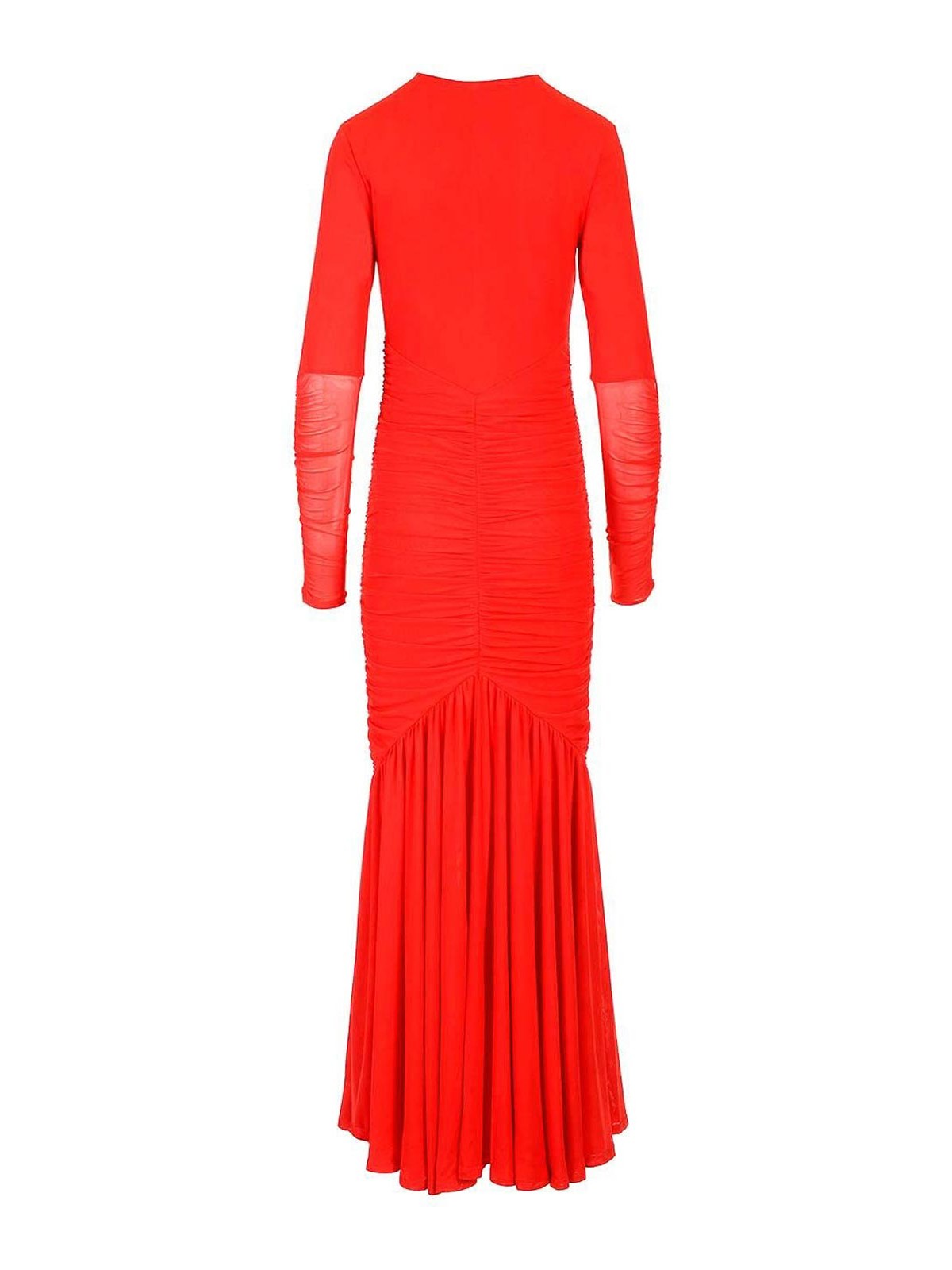 ローテーションのレッドフィットの長袖ドレス。ギャザー付きバスト、プリーツスカート、透け感のあるロングスリーブが特徴です。