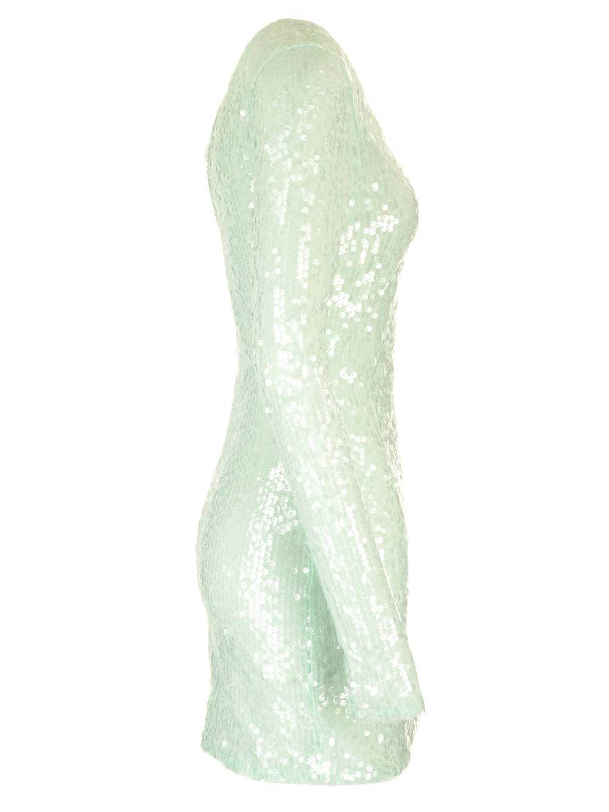 Rotateのアクアグリーンのスパンコールのミニドレス。楕円形のネックライン、ロングスリーブ、背面にファスナー、スリムフィット。