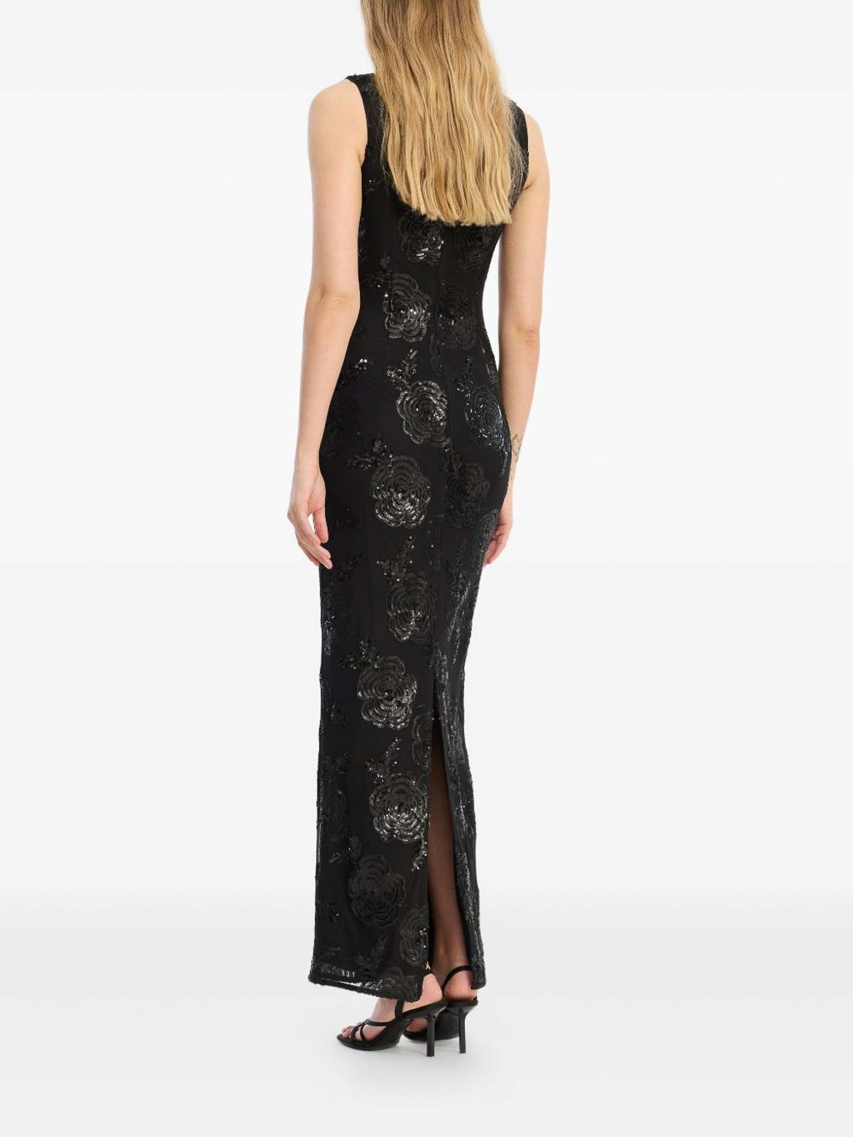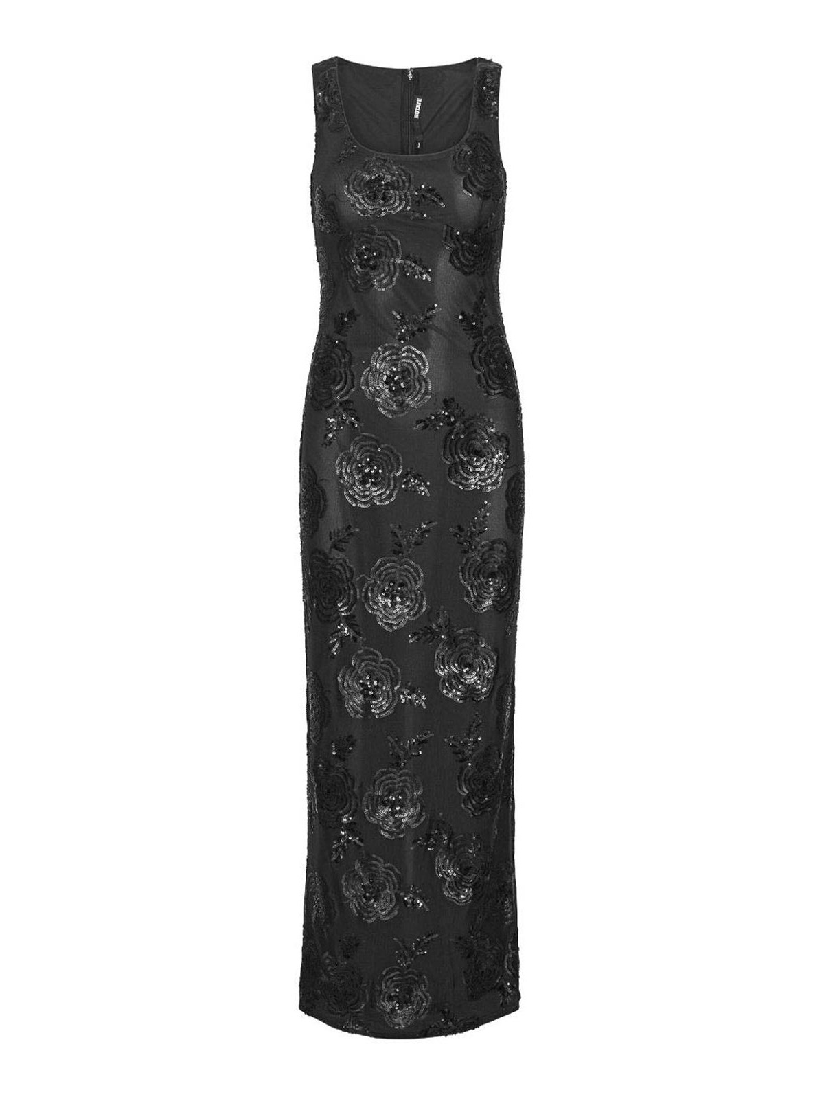 黒い花柄の装飾が施されたノースリーブのスクエアネックラインバックファスナーが特徴です。