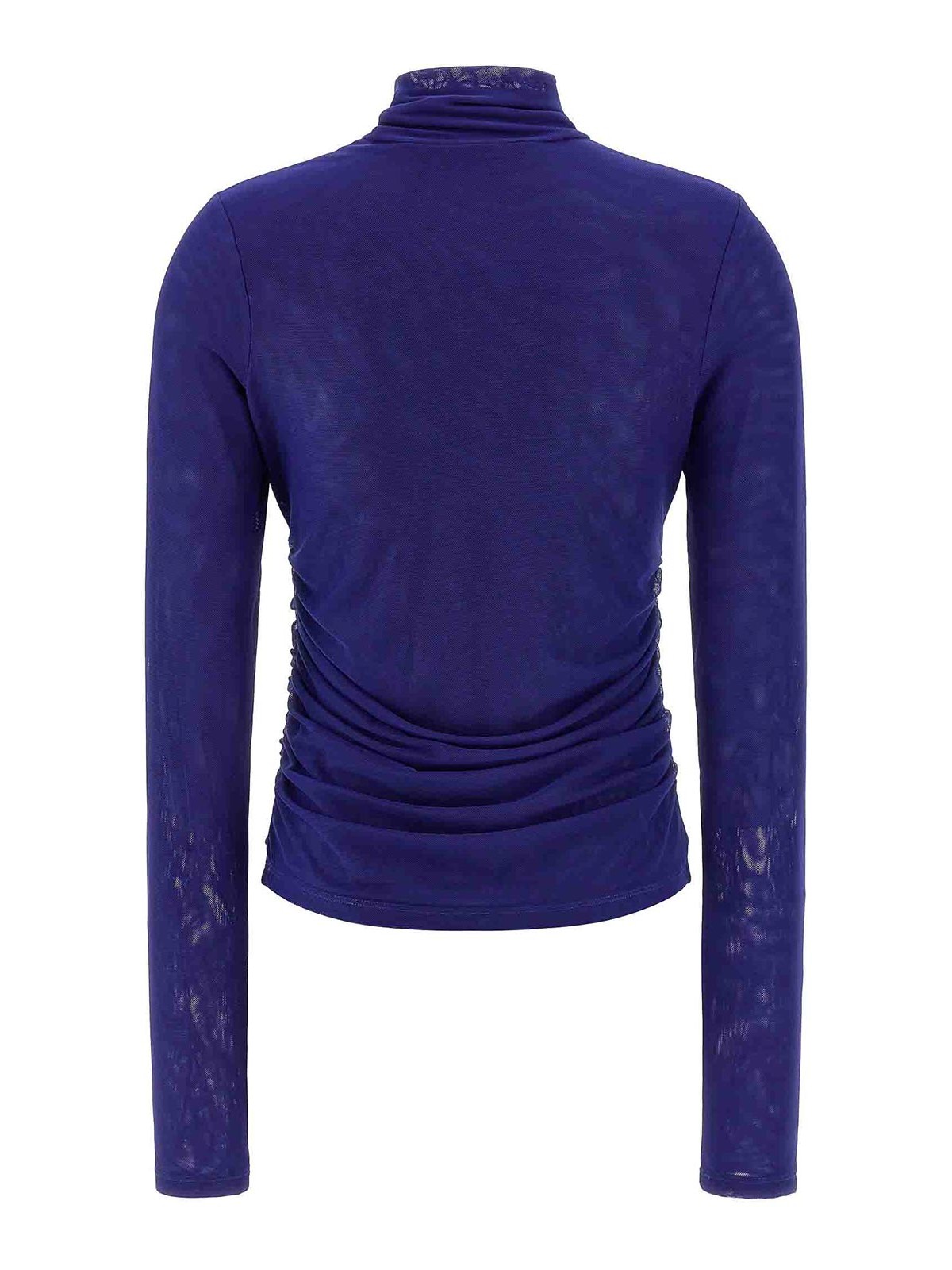 メッシュルーシュ付き二層半透明メッシュセーター、ハイネック、サイドカール、ロングスリーブ。