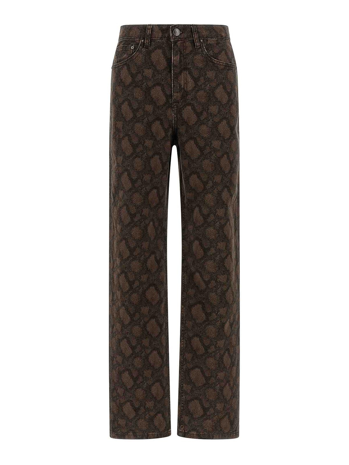 全体にアニマル柄のコットンデニムジーンズ、ハイウエスト、ストレートレッグ、フロントジッパーとボタンクロージャー、ポケット5つ、バックロゴタグ。