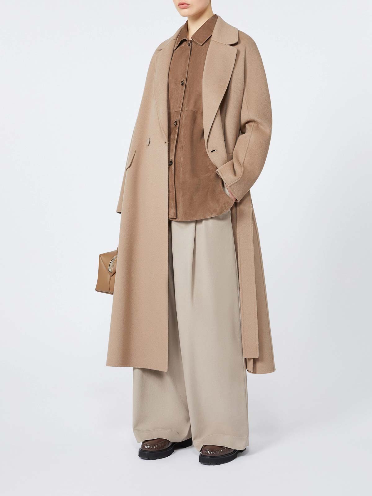 ベージュのダブルブレストのオーバーサイズロングコート。手縫いのピュアウールドラップコートフレアシルエットで、後ろに中央に広い通気口があり、ラペルカラー、ロングキモノスリーブ、露出したボタン留め、お揃いのベルトインセットサイドポケット、前面にフラップ付きサイドポケット、裏地なし