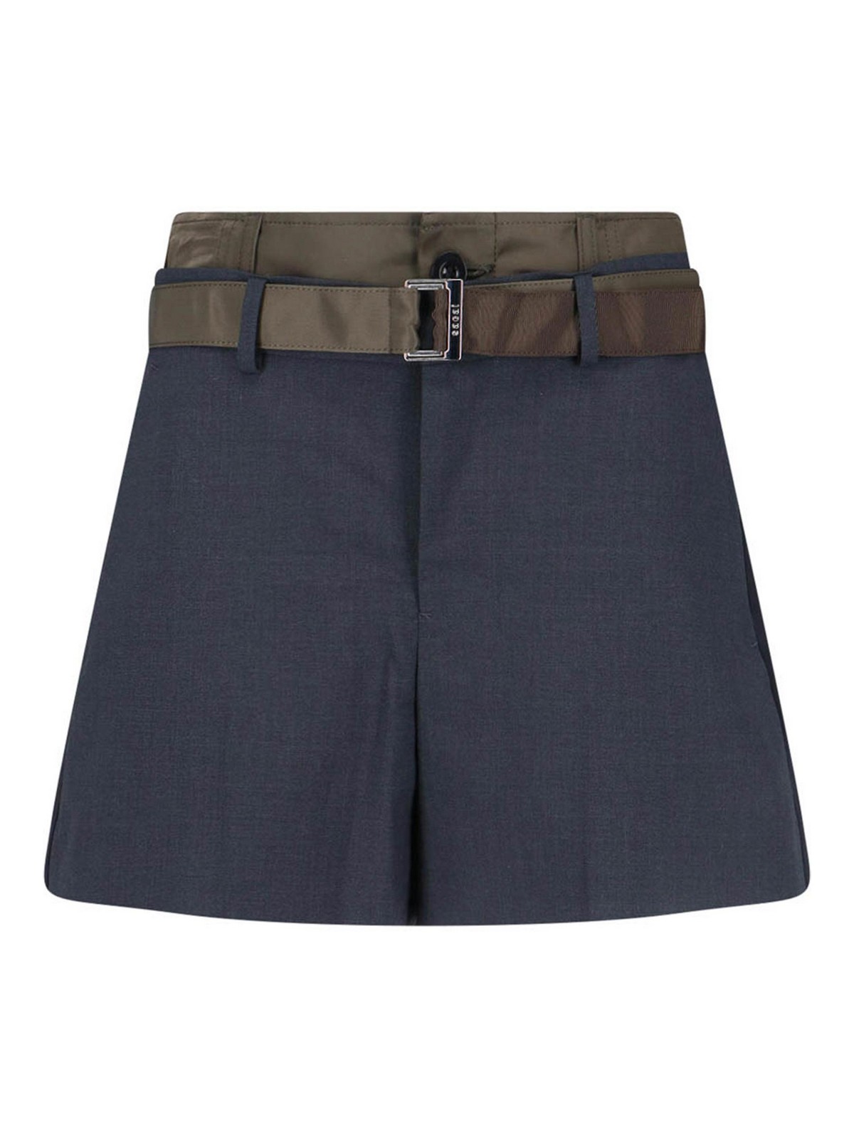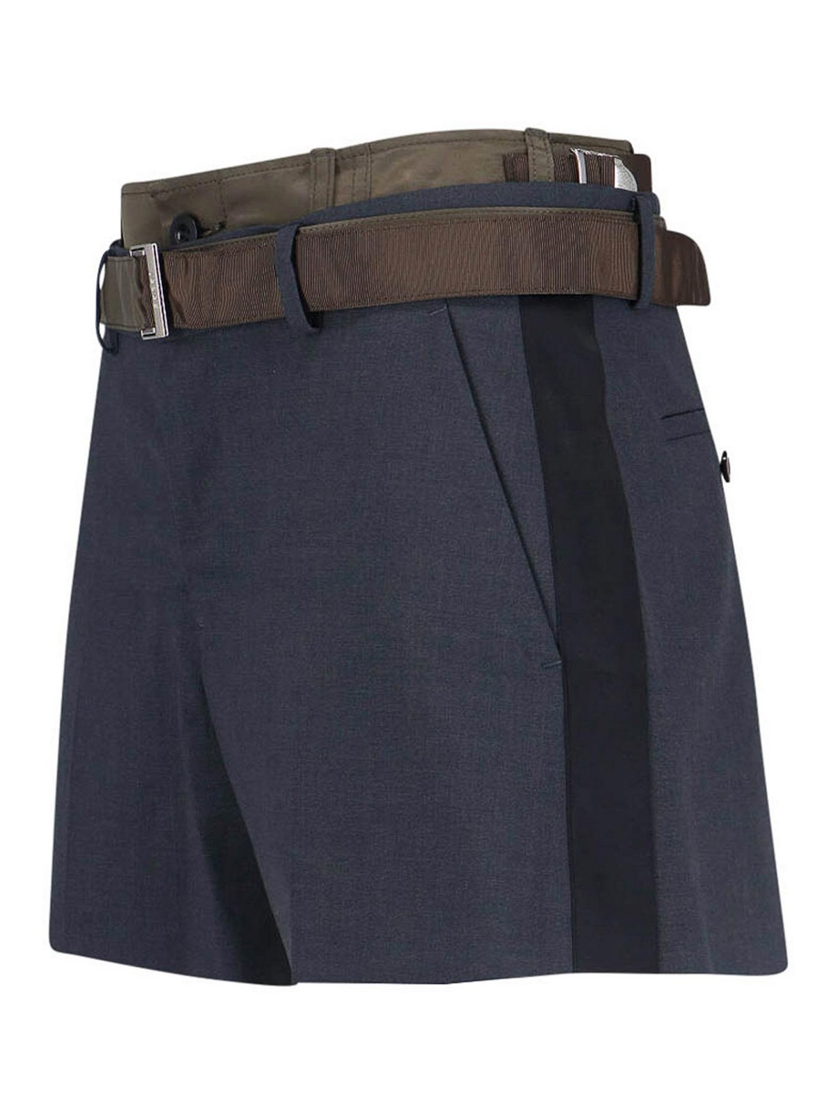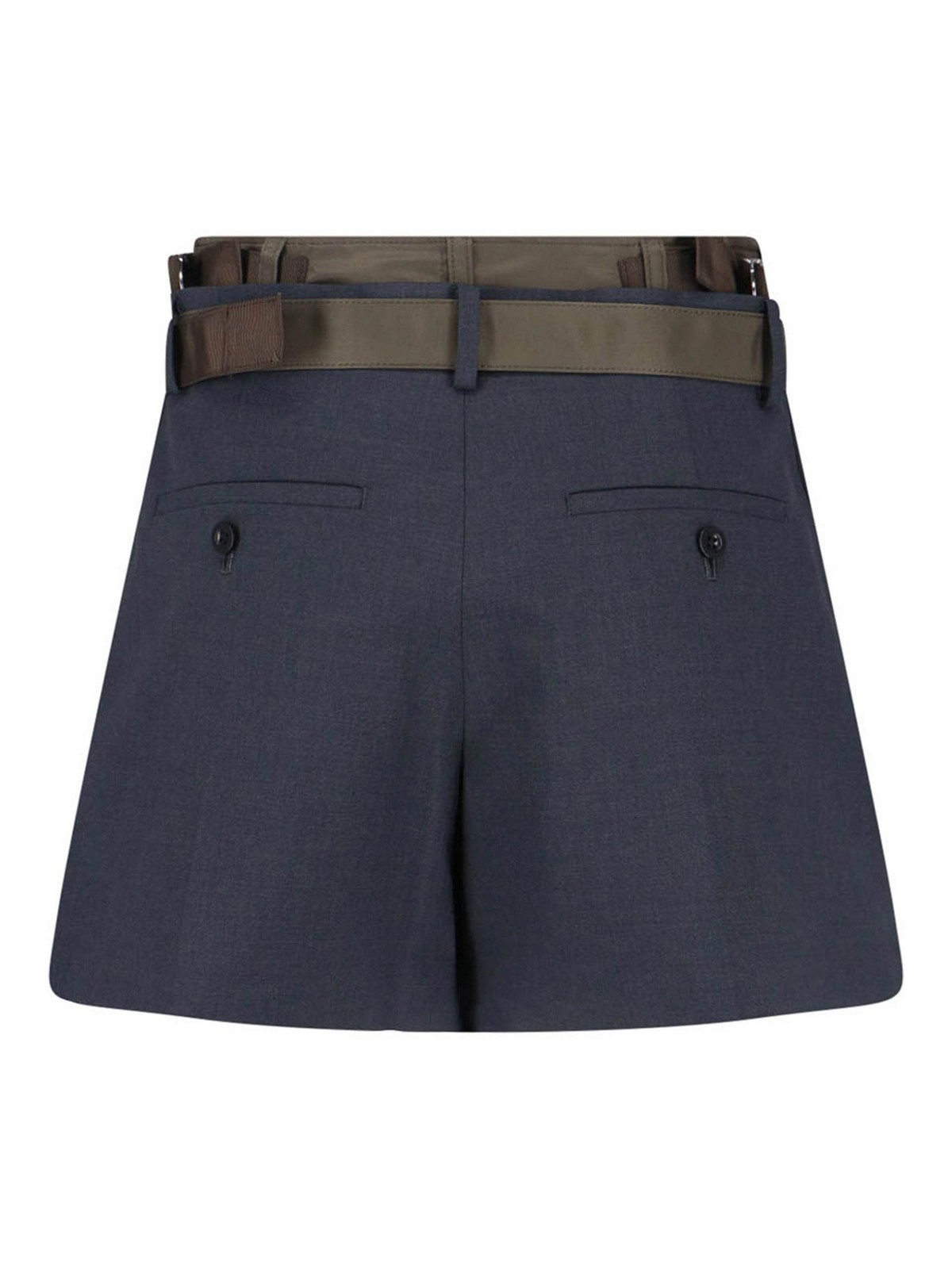 サカイウール混紡ショーツ、グレー、ミディアムウエスト、ボタン&ジッパー、フロントバックルベルトディテール、サイドスラントポケット2つ、バックボタンポケット2つ、ストレートレッグ
