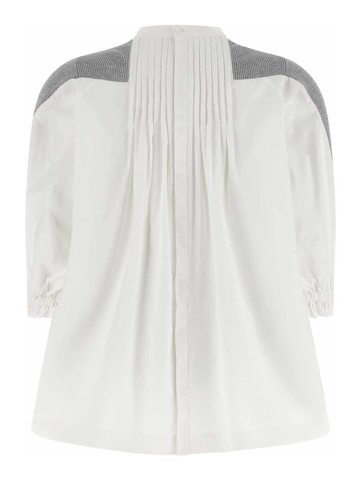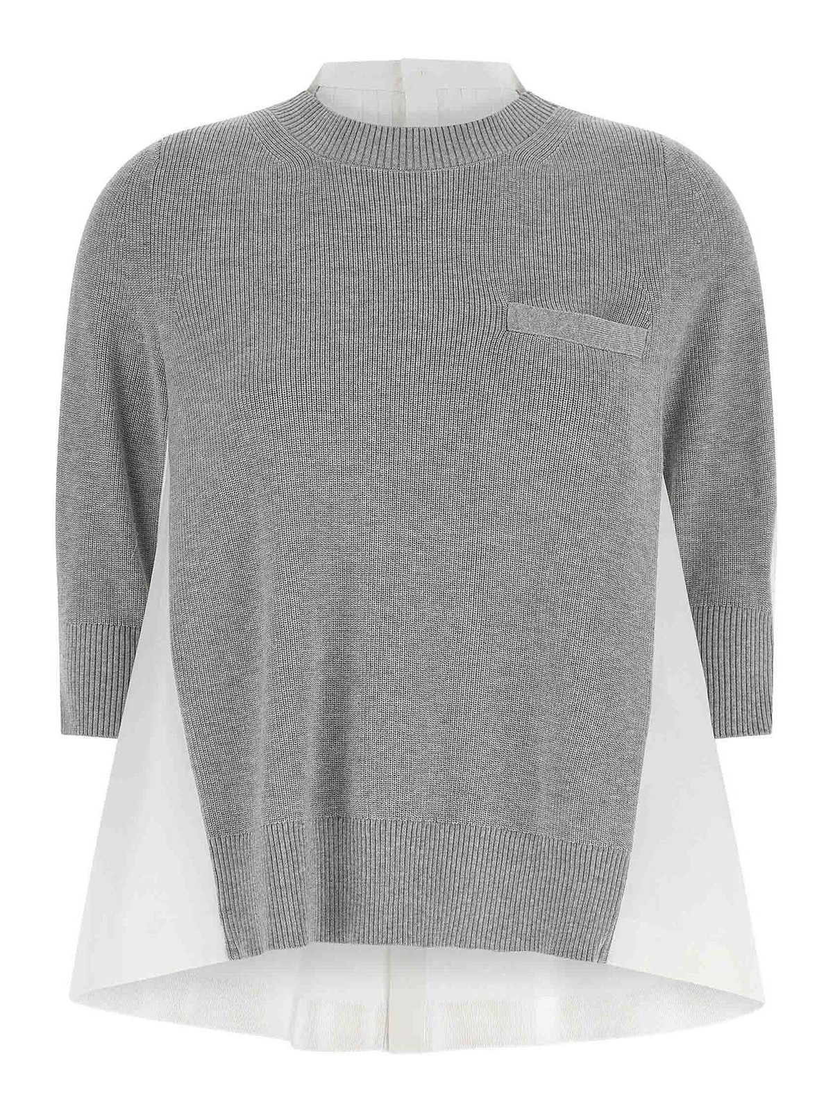 裾が左右非対称のアシンメトリーなセーター。フロントはコットン混紡ニット、クルーネック、ポケット、シャツトップバンドとバックはコットンポプリン製。ボタン留めはサイドプリーツ、ショートパフスリーブ、袖口はゴムでフリル付き。