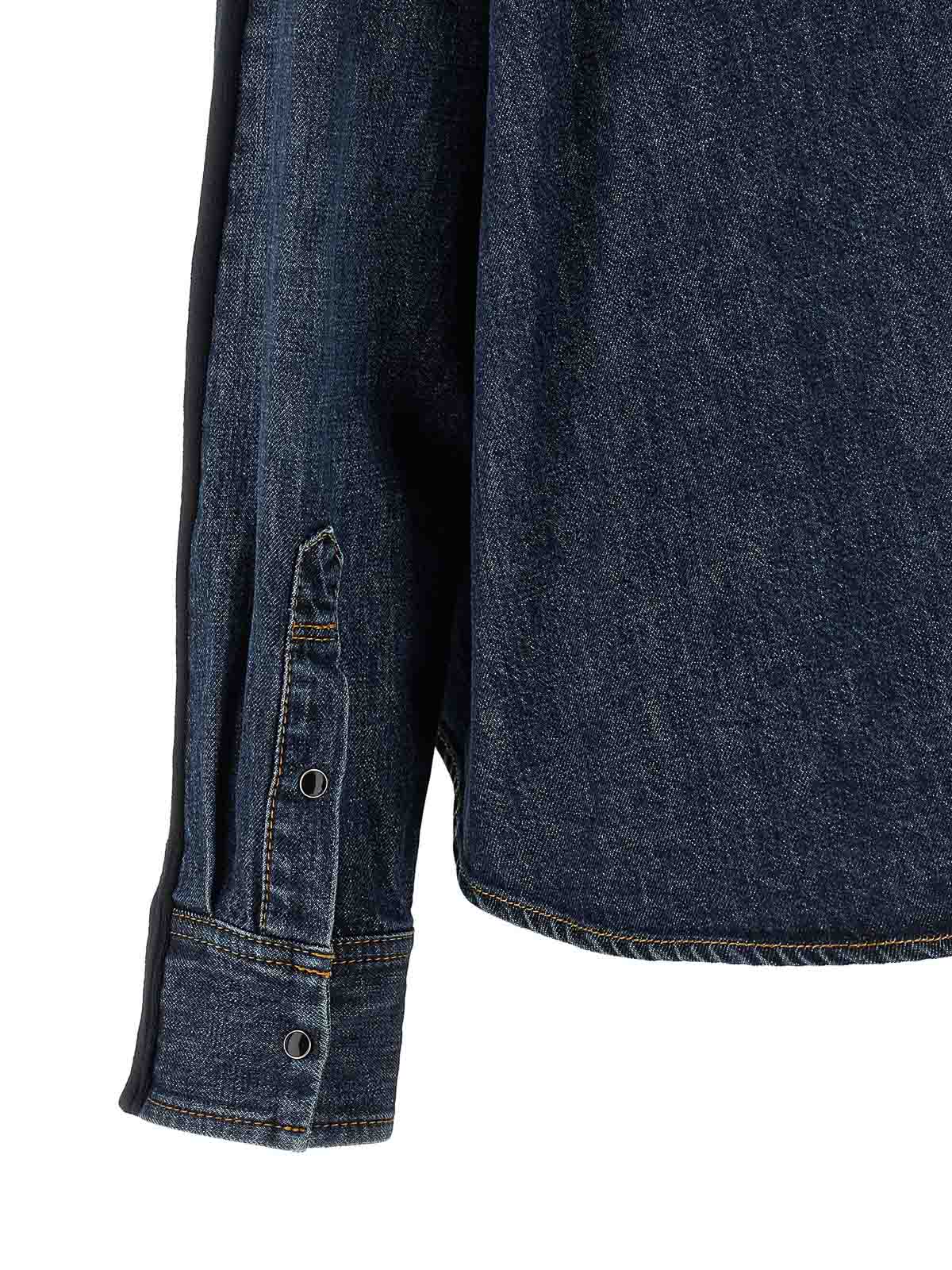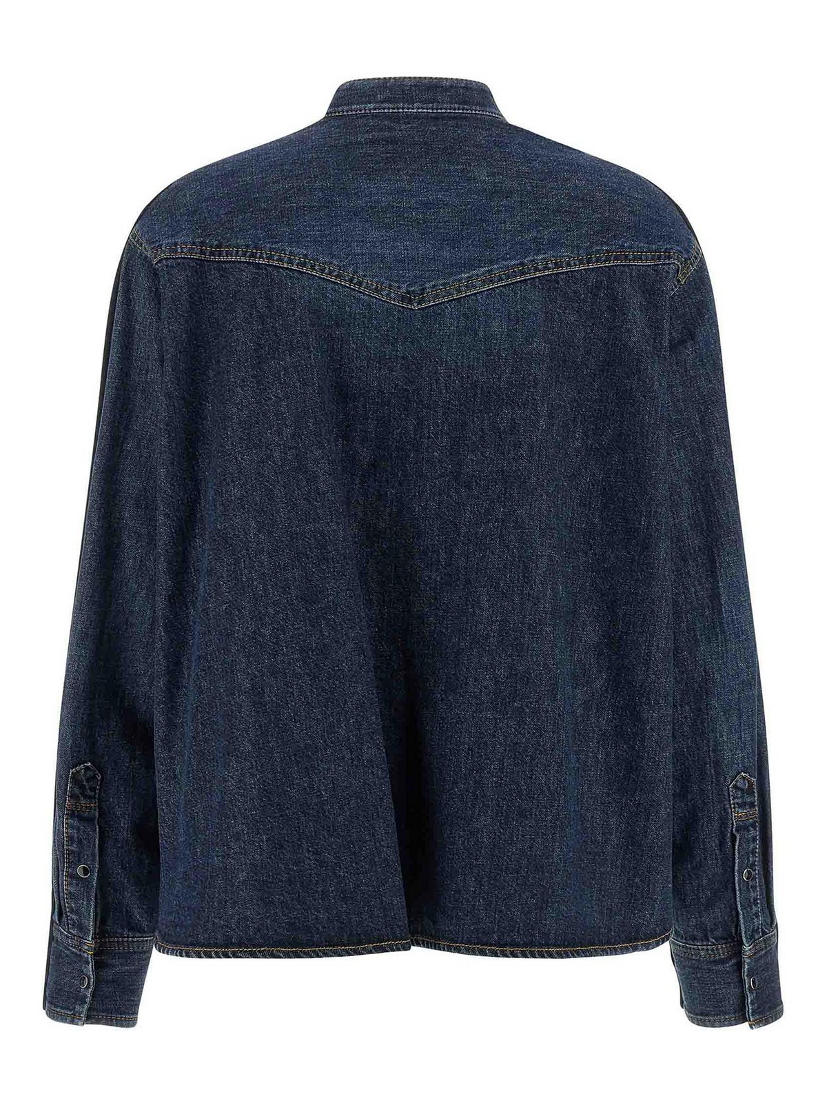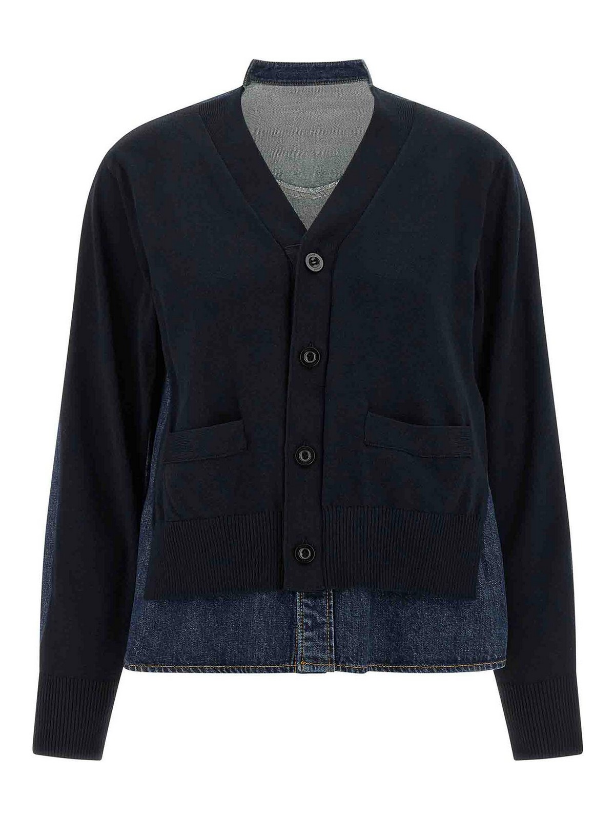 コットンデニムのシャツスタイルのバック、コントラストステッチ、フロントはコットン混紡素材、Vネック、フロントボタン留め、カフスとドロップショルダー付きのロングスリーブ、アシンメトリーヘムで構成されたカーディガン。