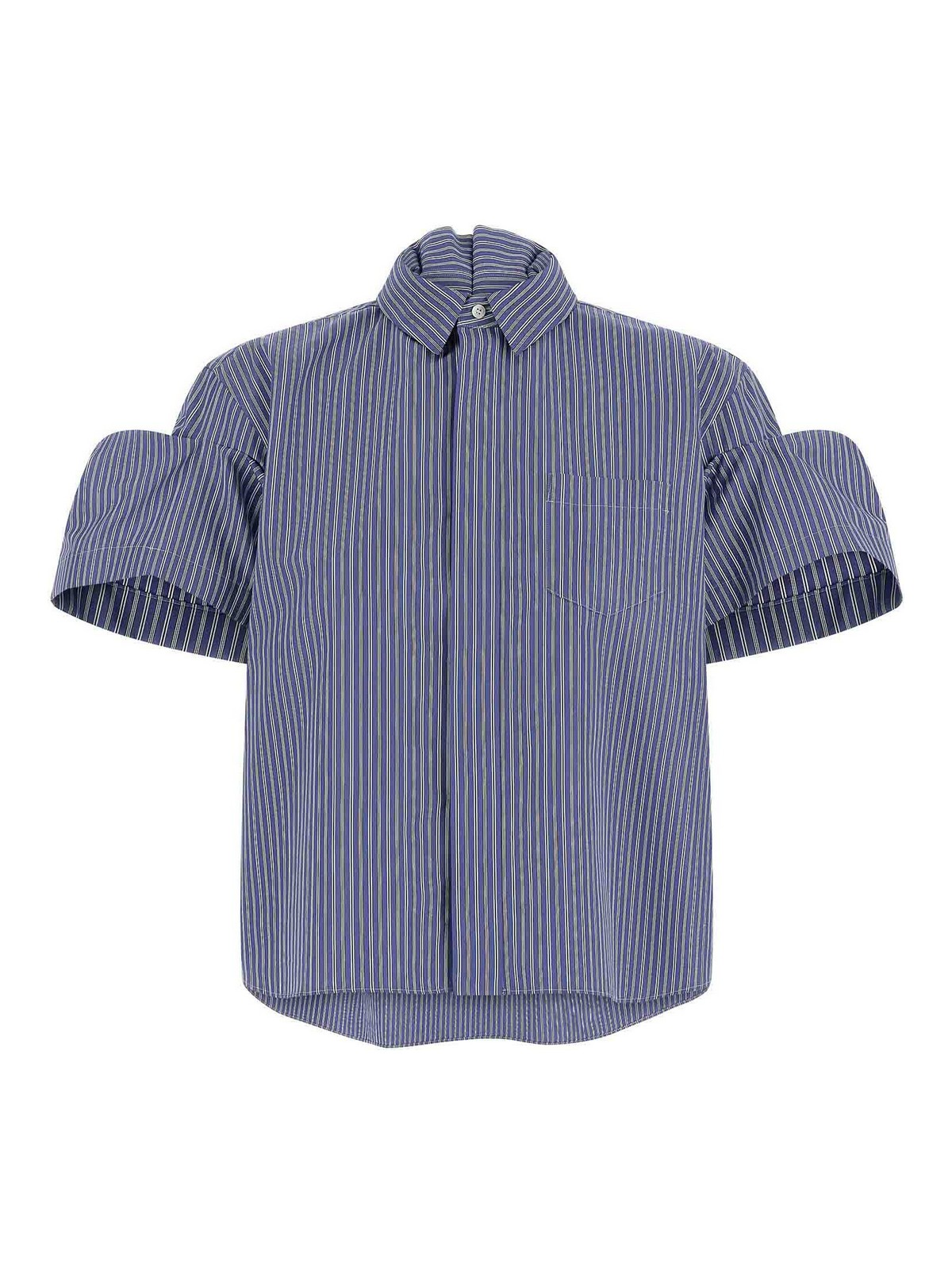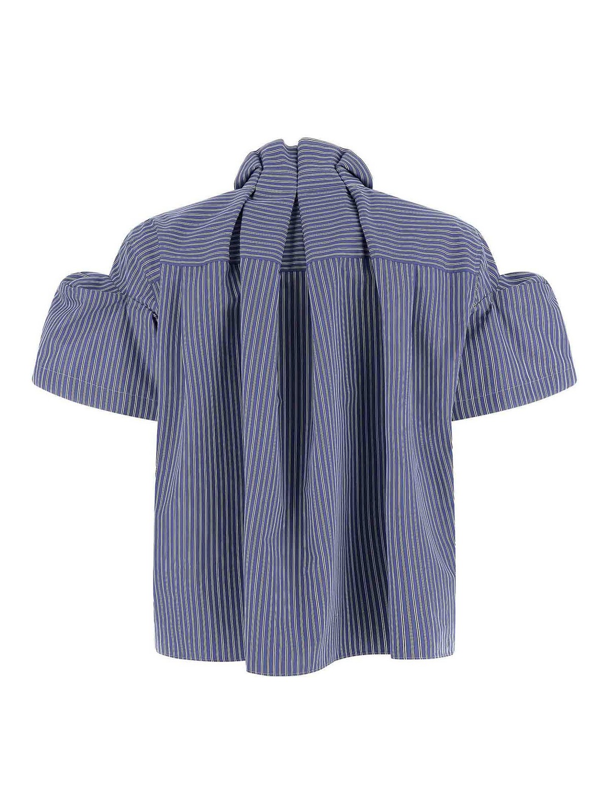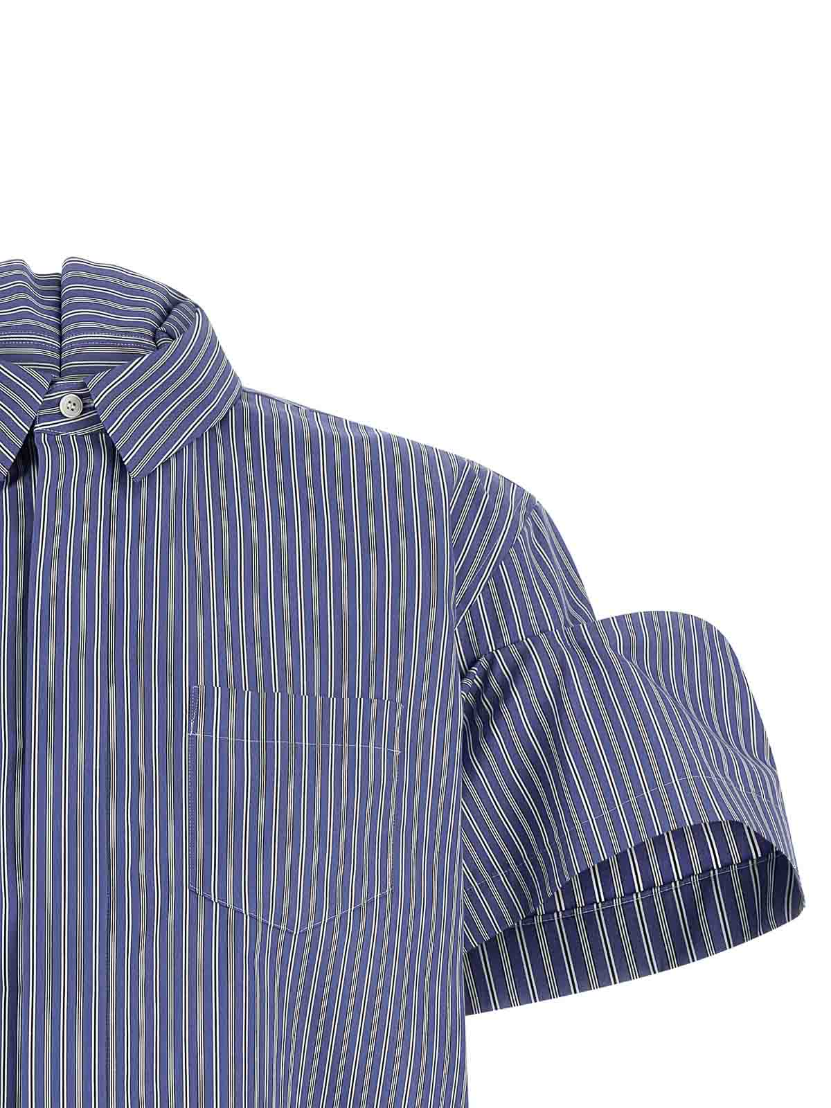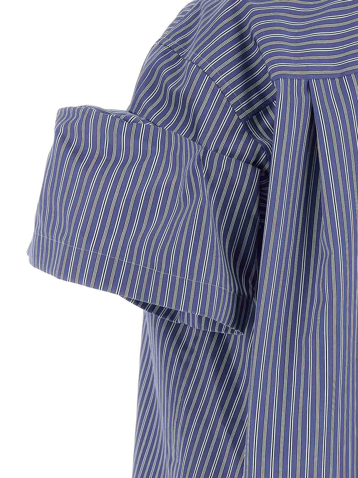 ストライプのコットンポプリンシャツ、胸ポケット、隠しフロントボタン留め、マチ付きショートスリーブ、丸みを帯びたアシンメトリーヘム。